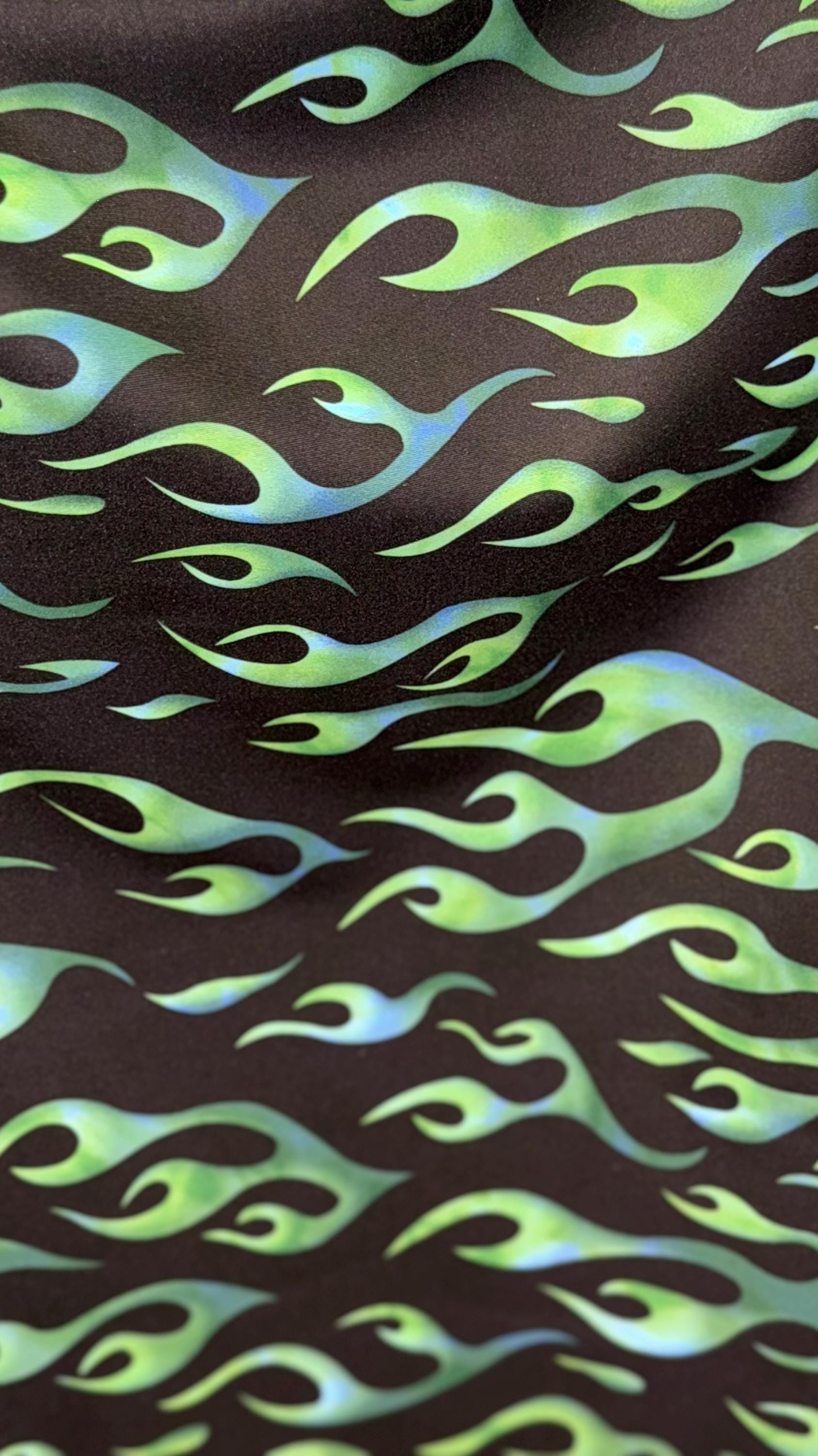 Hot flame design black/Green print on heavy nylon spandex 4way stretch 58/60" Sold by the YD. Ships worldwide from Los Angeles California