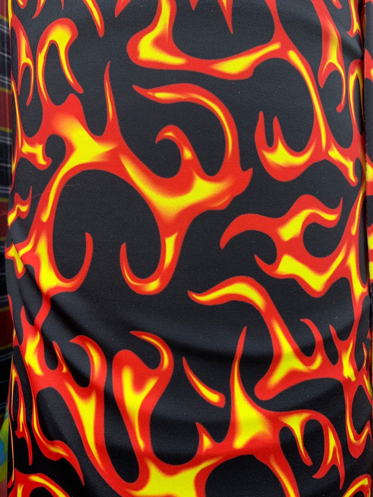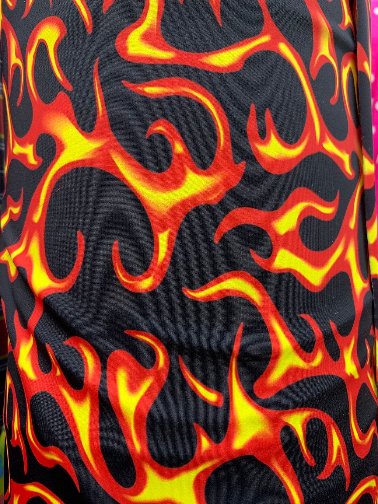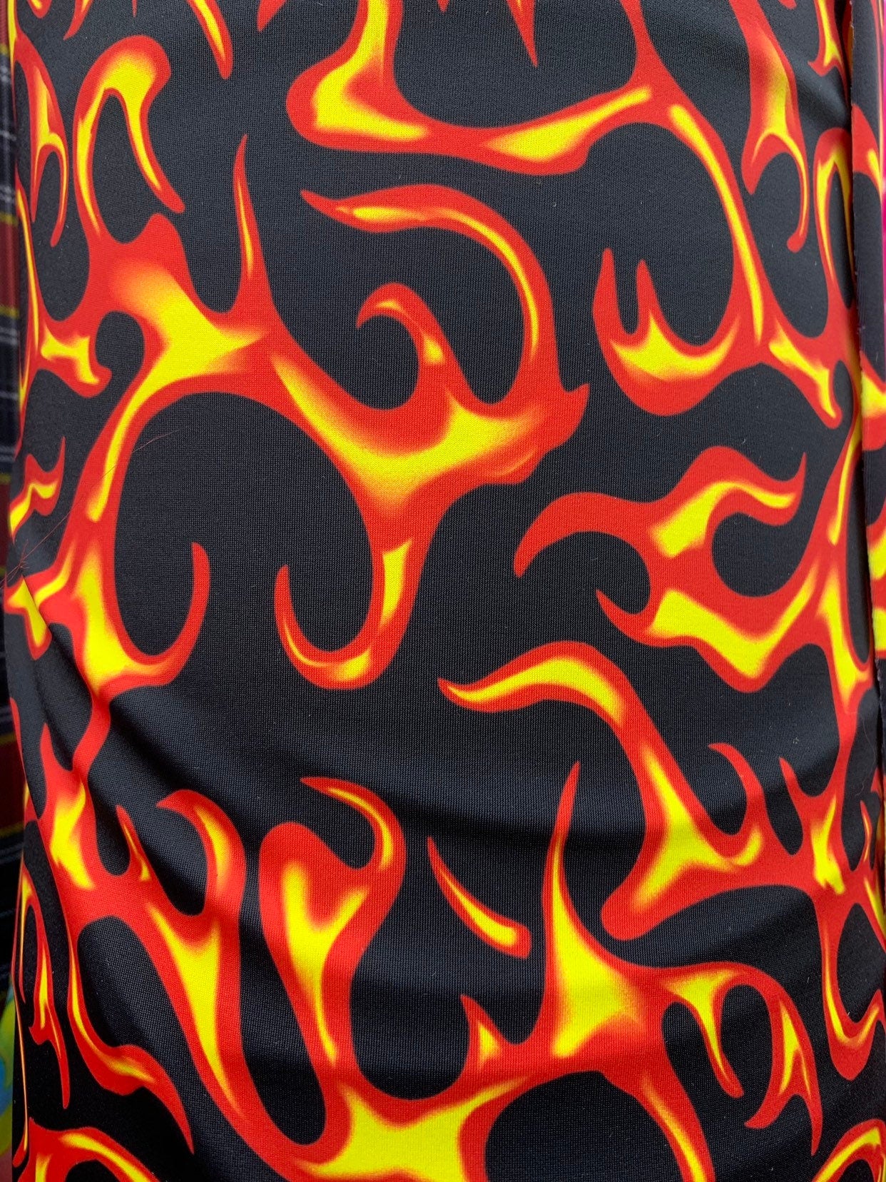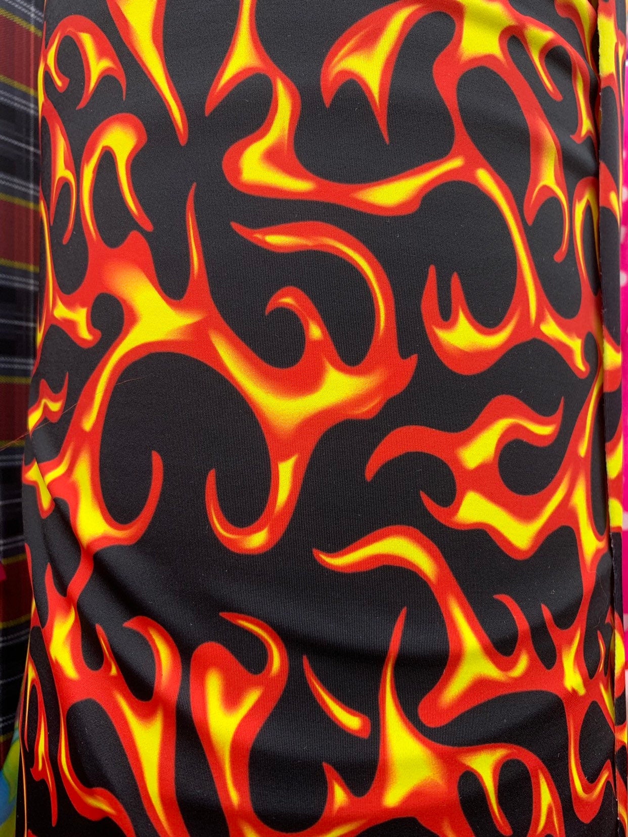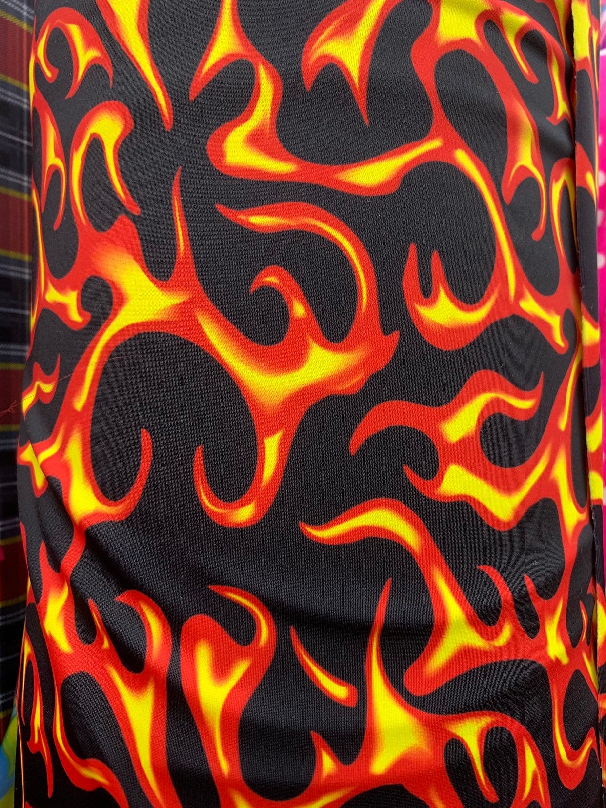 Hot flame design black/red print on heavy nylon spandex 4way stretch 58/60" Sold by the YD. Ships worldwide from Los Angeles California USA.