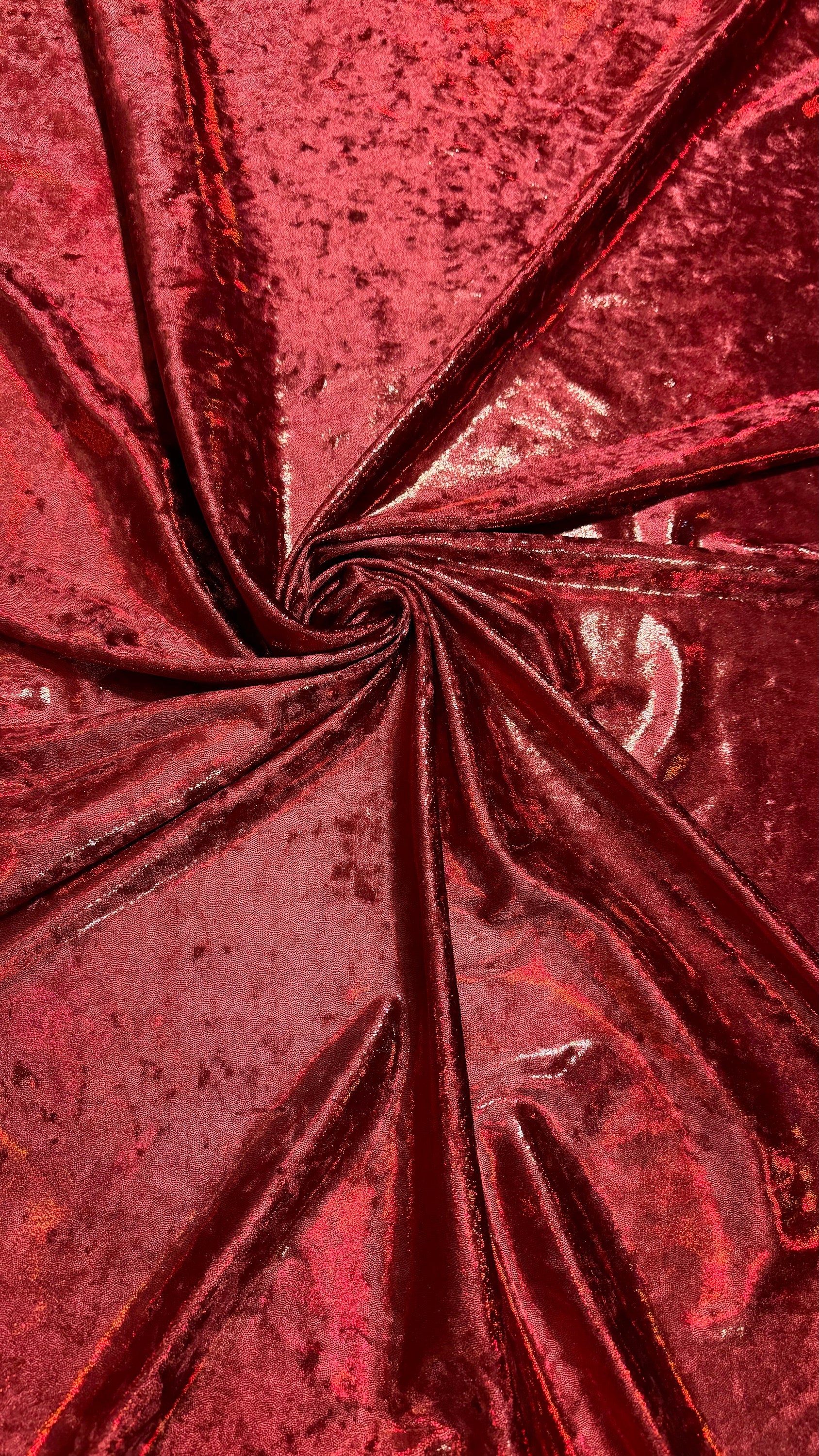 Iridescent Dark Red metallic foggy foil on stretch velvet 4-way 58/60” Sold by the YD. Ships worldwide from Los Angeles California USA. High quality fabrics by AlexLAFabrics
