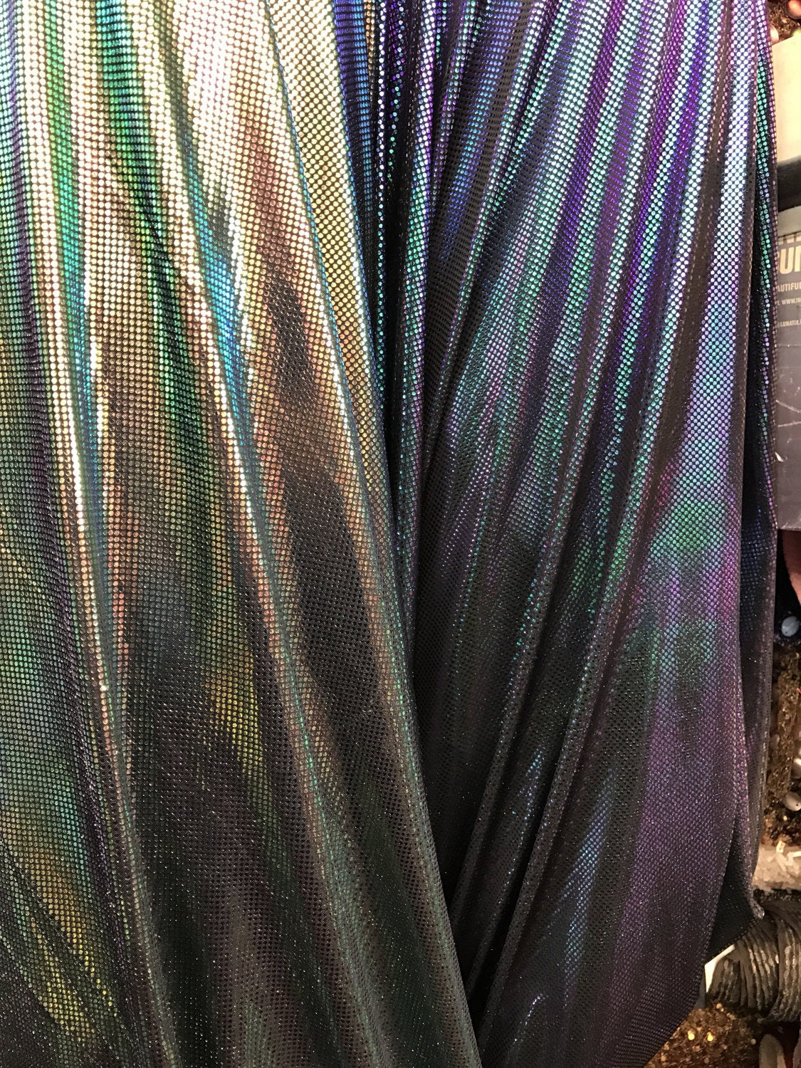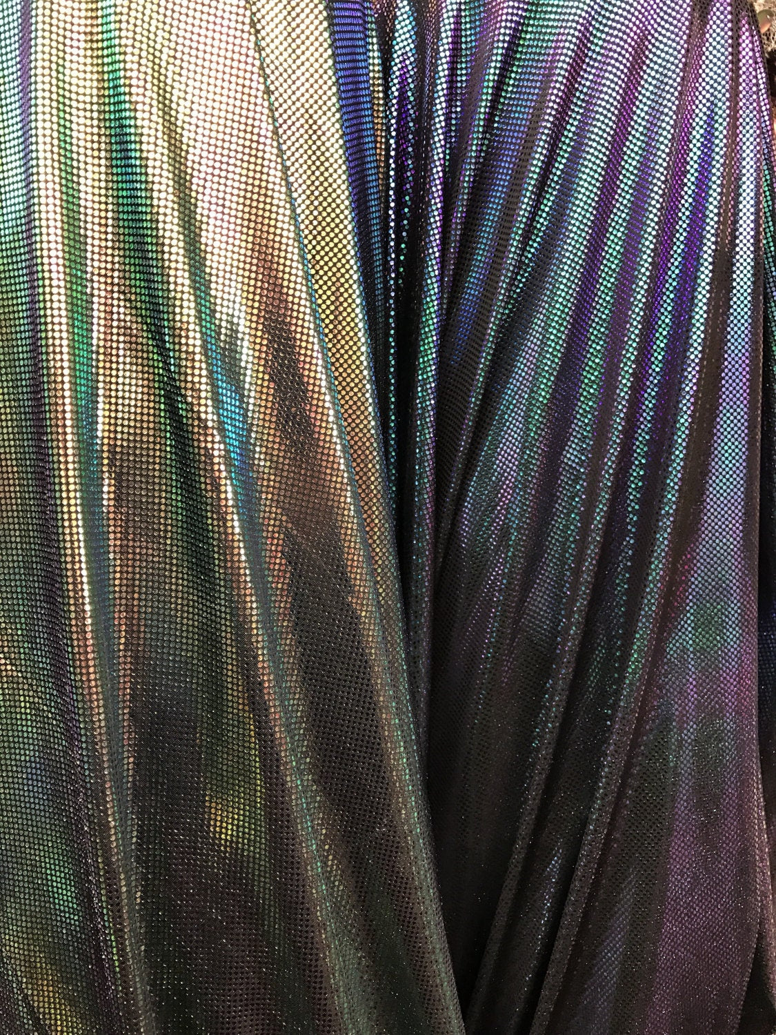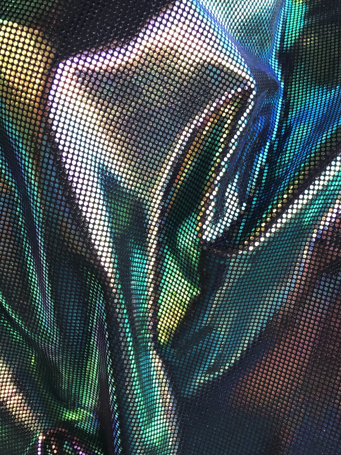 Iridescent mermaid design poly spandex 4Way stretch with foil dots 58/60" sold by the yd. Ships worldwide from Los Angeles California USA