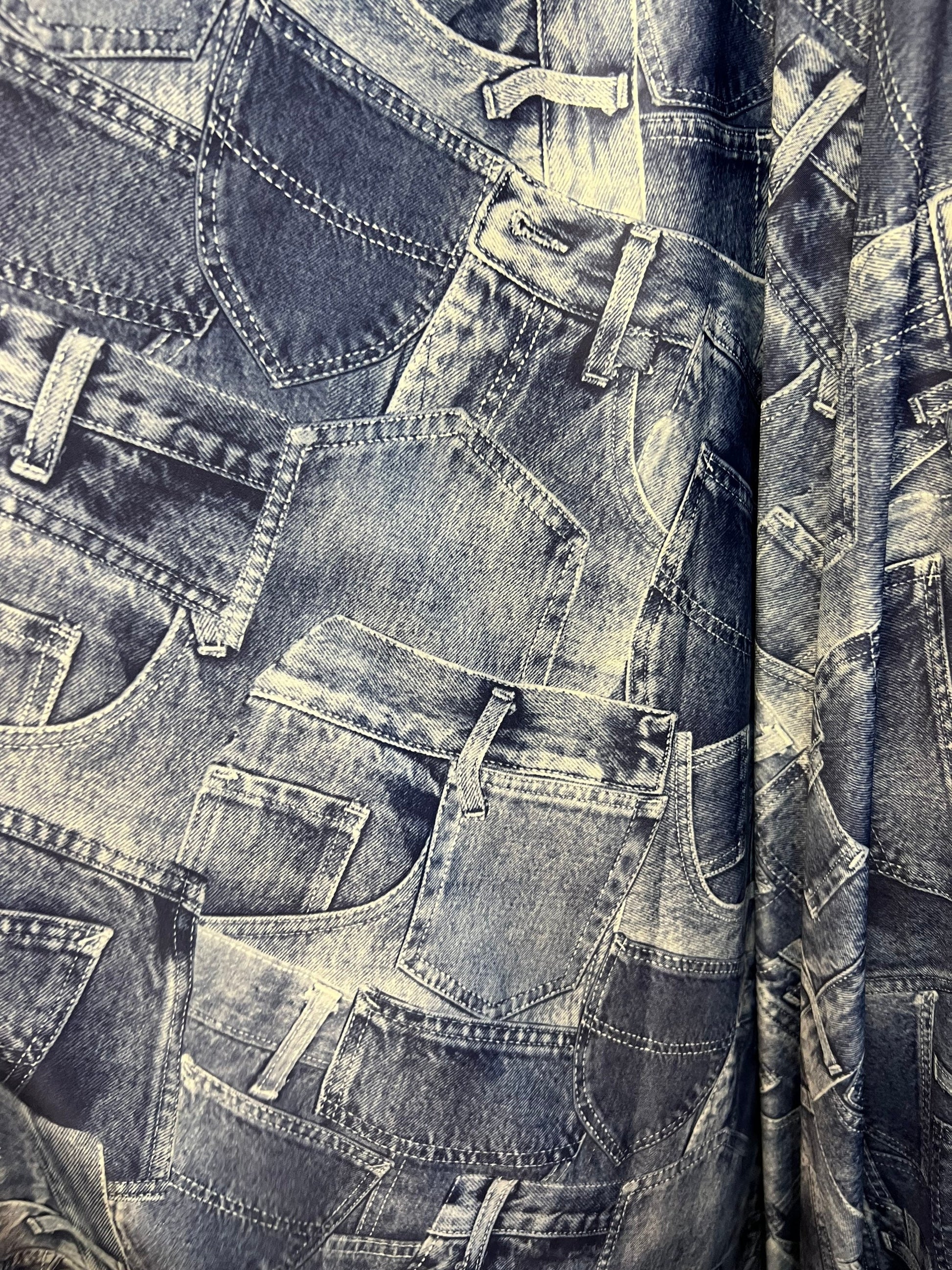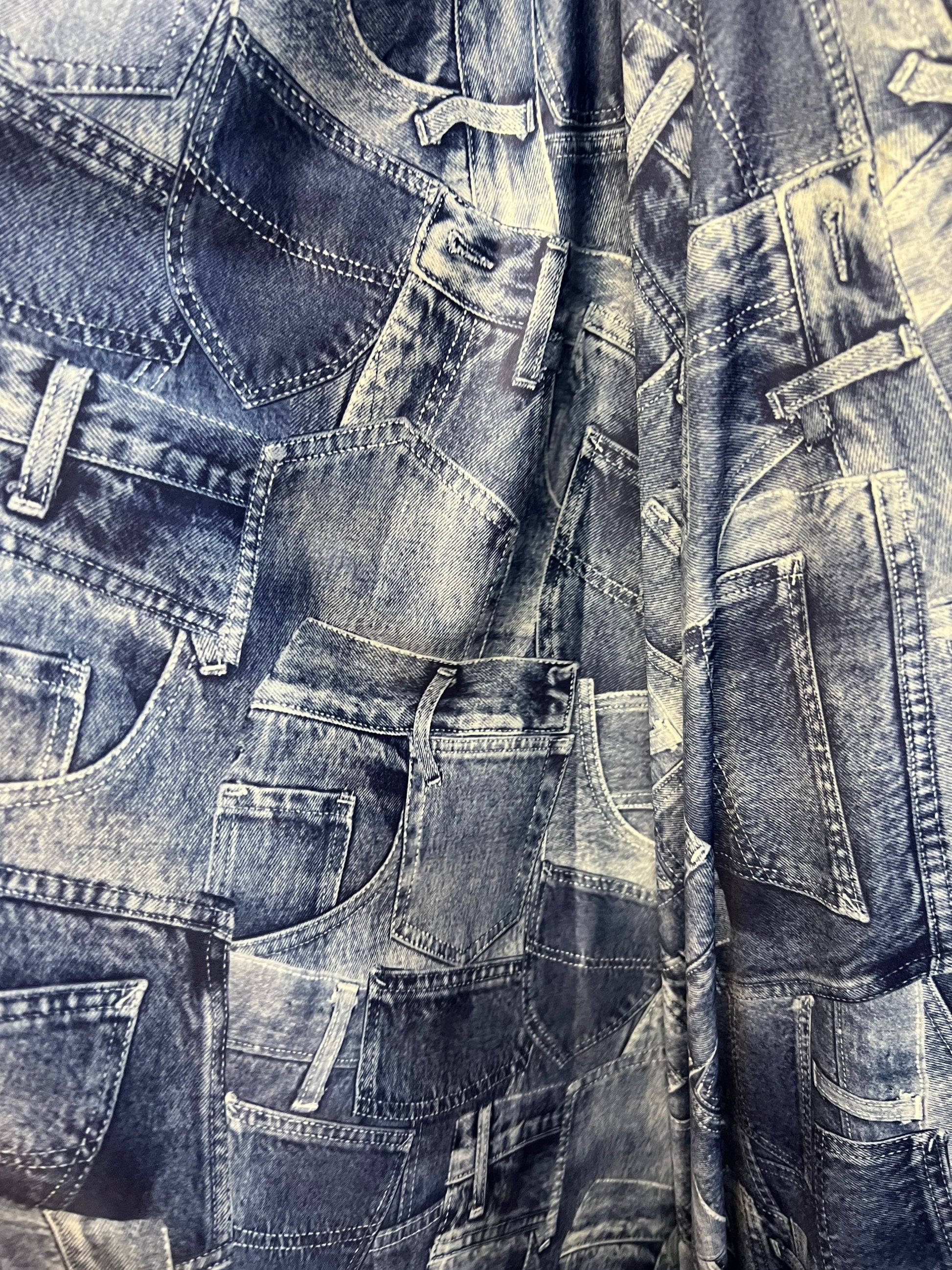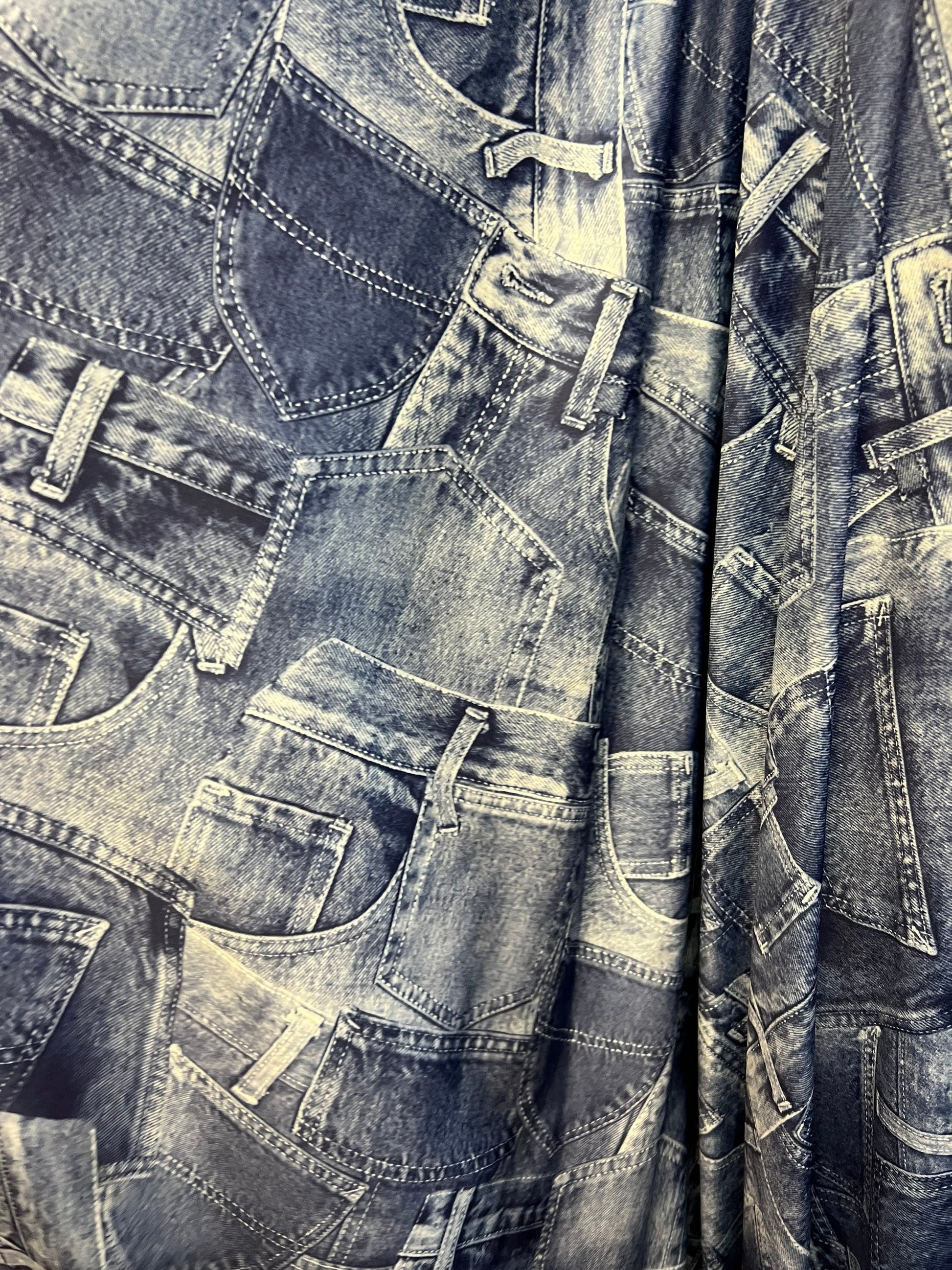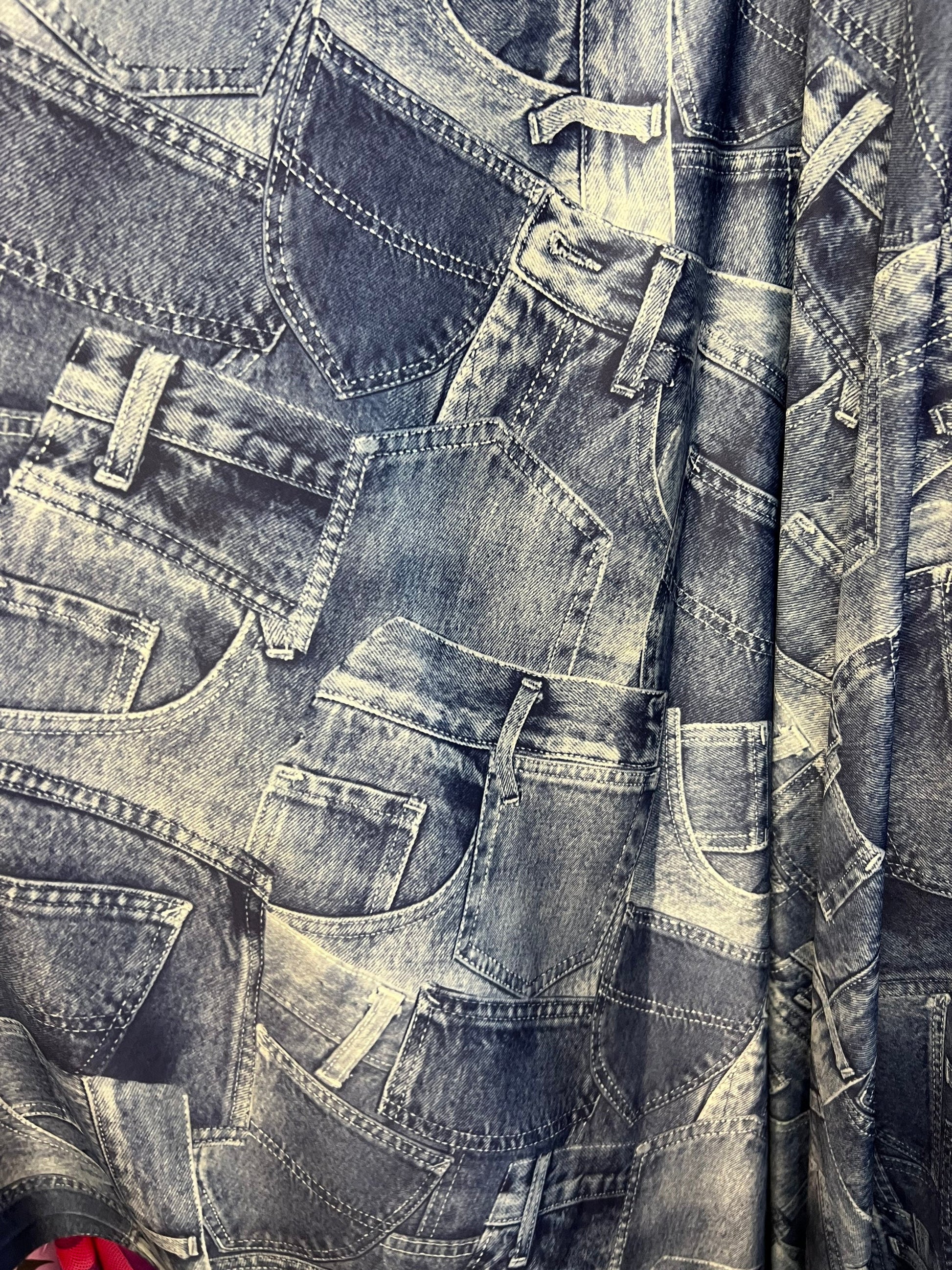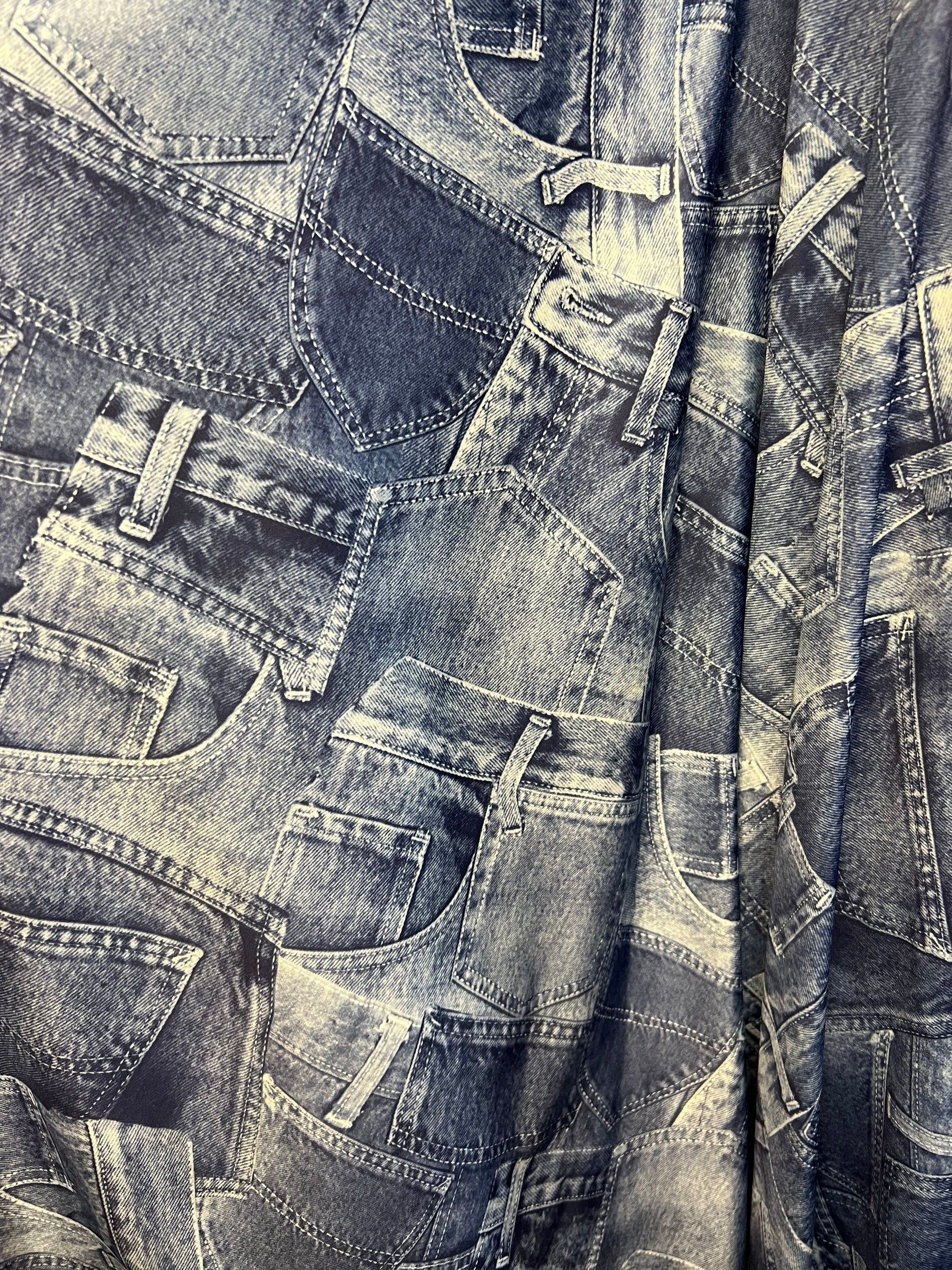 Jeans pocket design print on poly spandex 4-way stretch medium weight 58/60” Sold by the YD. Ships Worldwide from Los Ángeles California USA