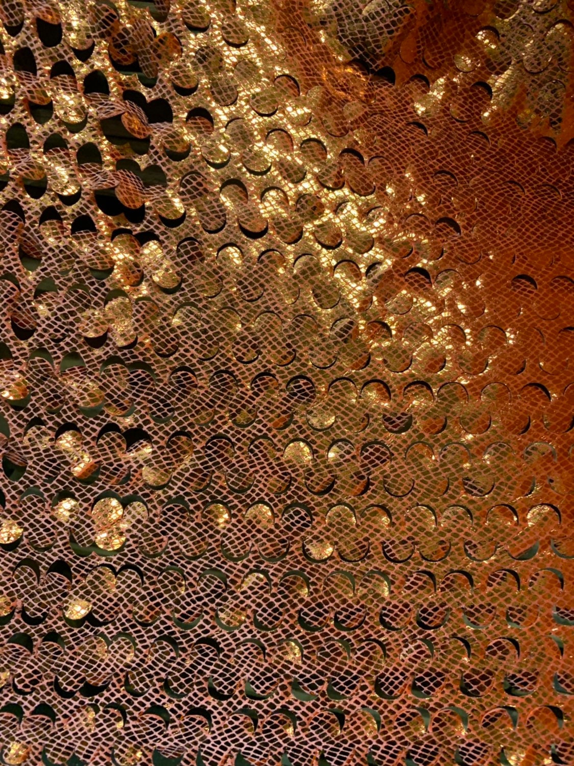 Lacer cut orange/gold stretch velvet with foil 4way stretch 58/60" Sold by the YD. Ships worldwide from Los Angeles California USA.