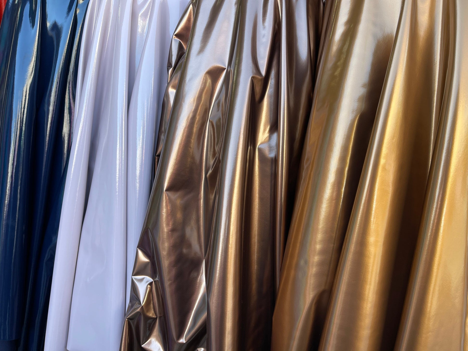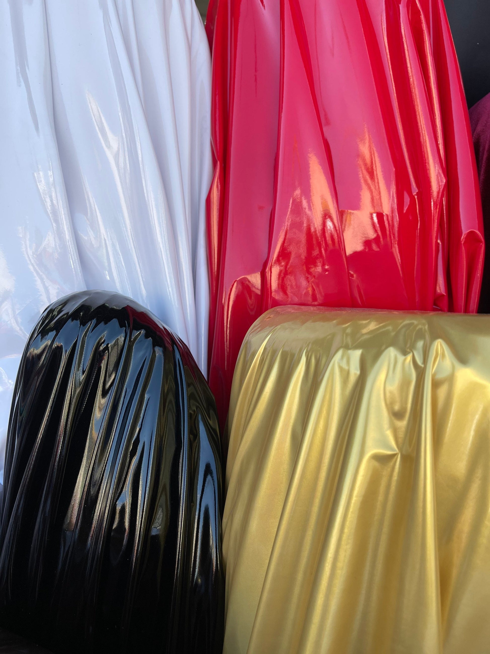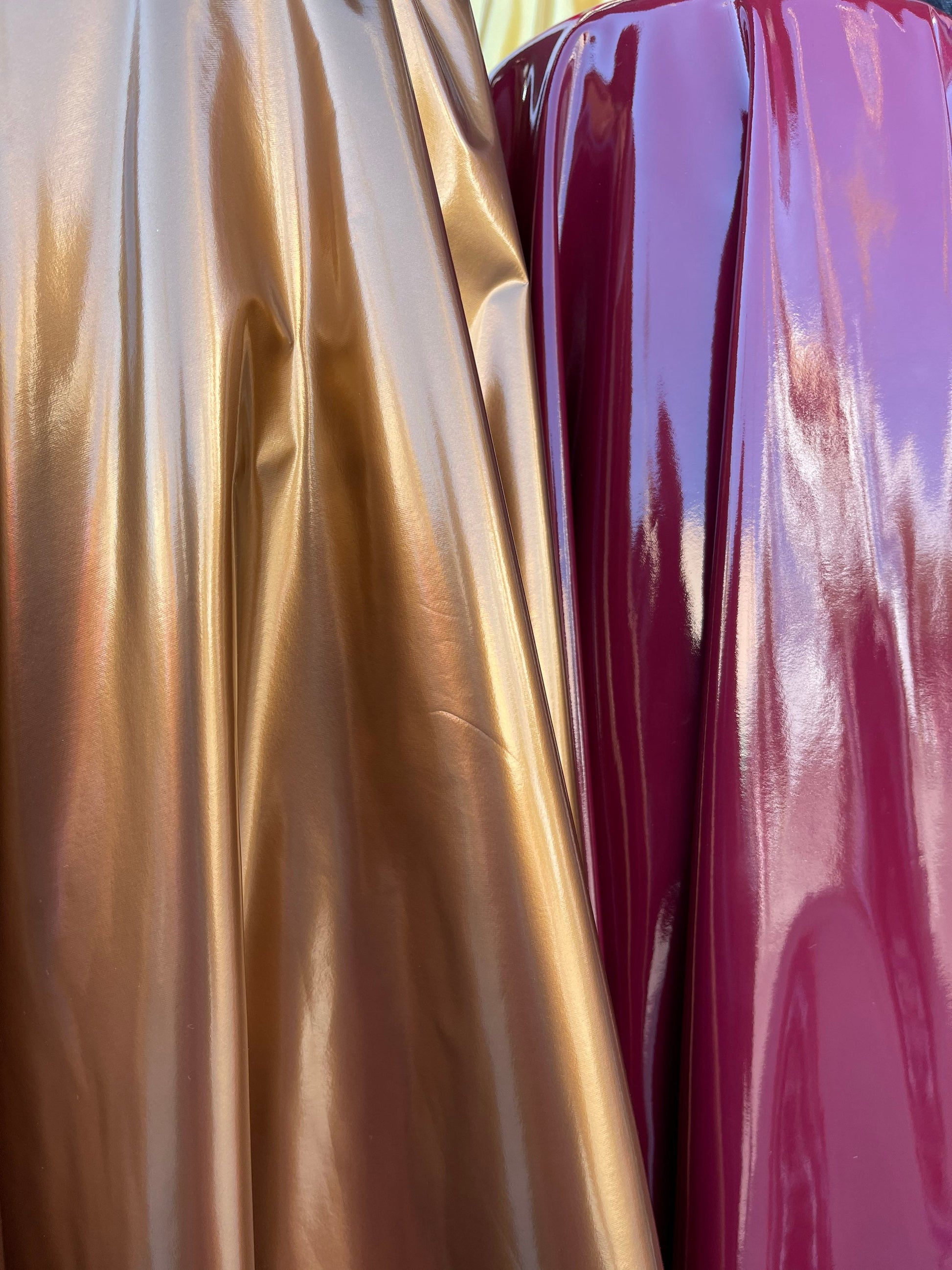 Látex new colors in stock shiny vinyl 4-way stretch 58/60” Sold by the YD. Ships Worldwide from Los Angeles California USA.