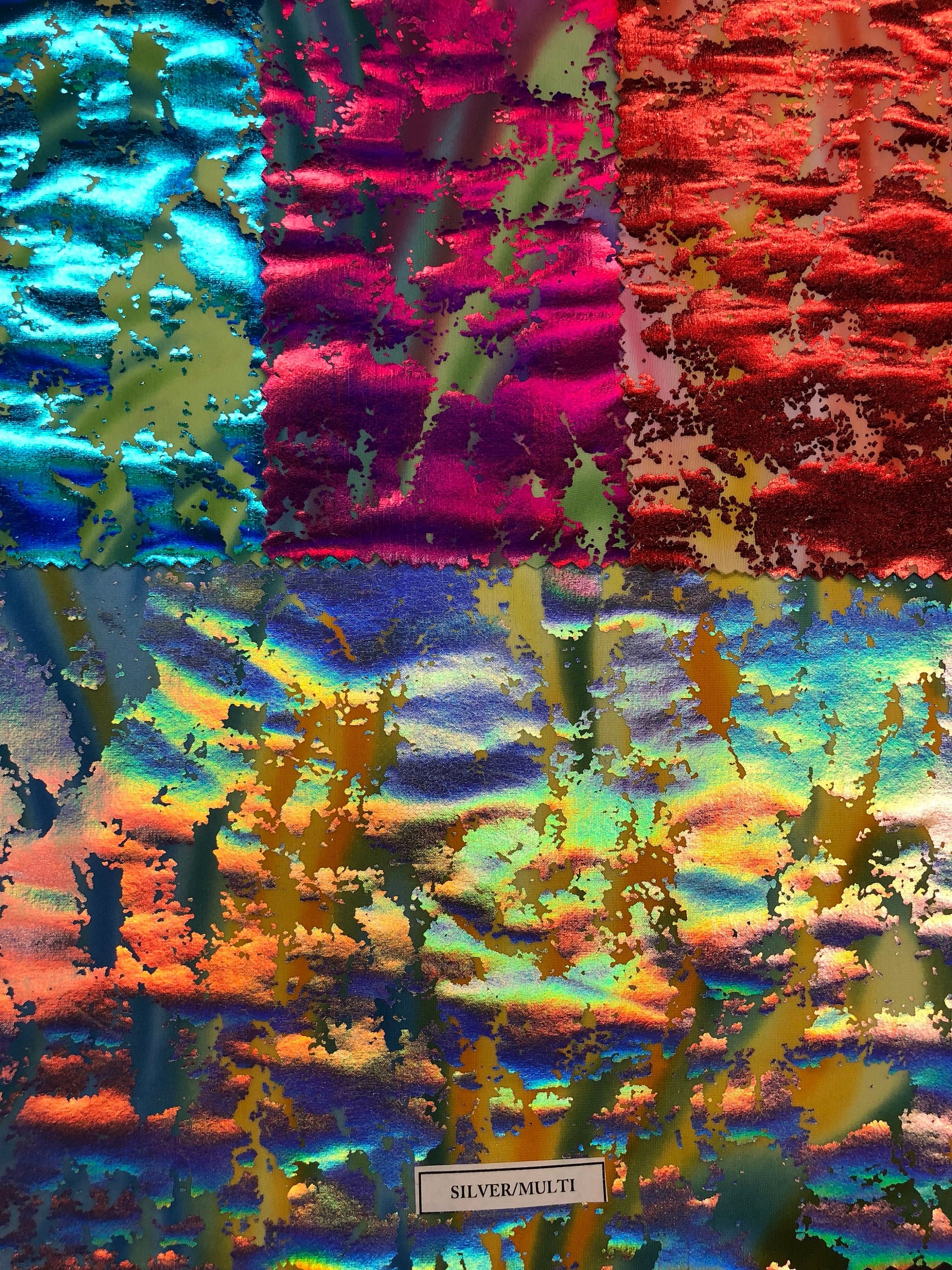 Lava print with iridescent foil on nylon spandex 4way stretch 58/60" Sold by the YD. Ships worldwide from Los Angeles California USA.