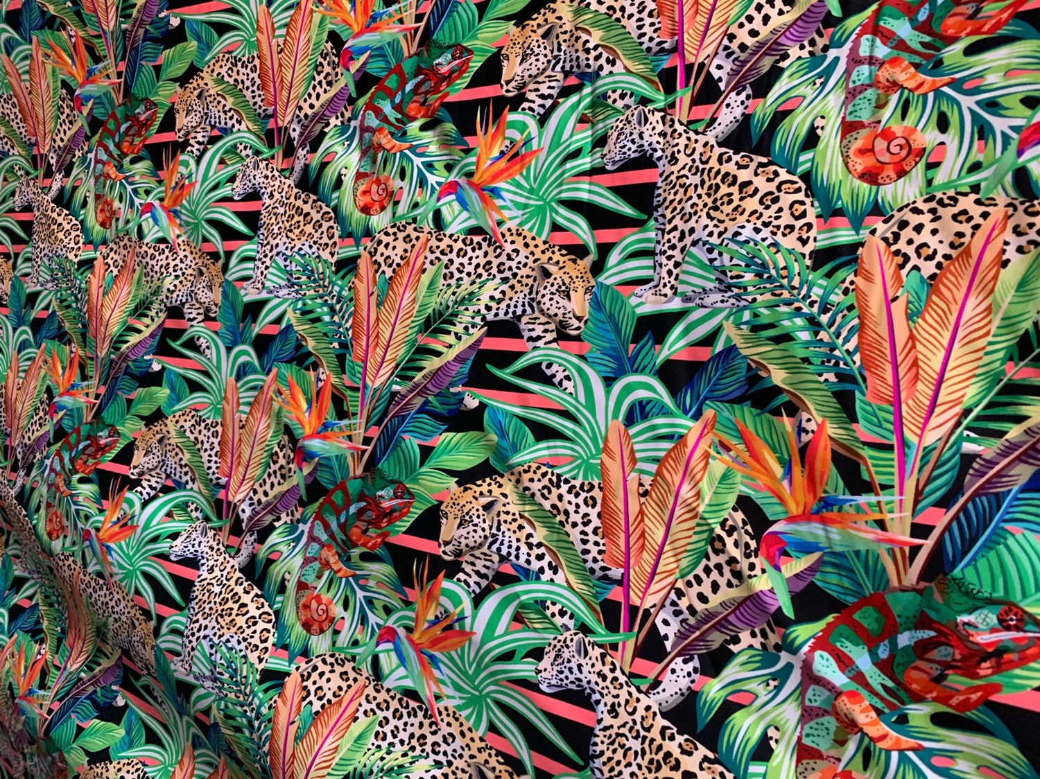 Leopard design print on heavy nylon spandex 4way stretch 58/60" Sold by the YD. Ships worldwide from Los Angeles California USA.