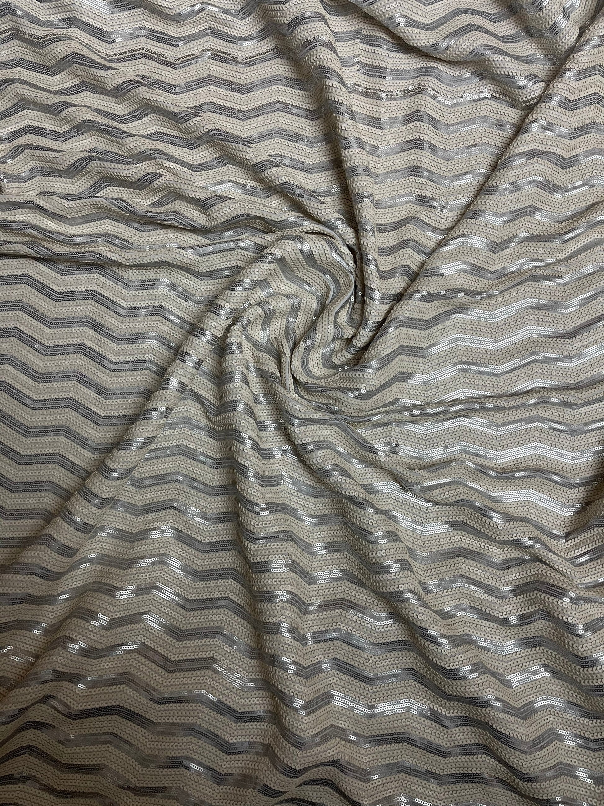 Luxury Chevron design embroidered on spandex base 2-way stretch silver/pearl white sequins 58/60” Sold by the YD. Ships Worldwide from Los Angeles California USA.