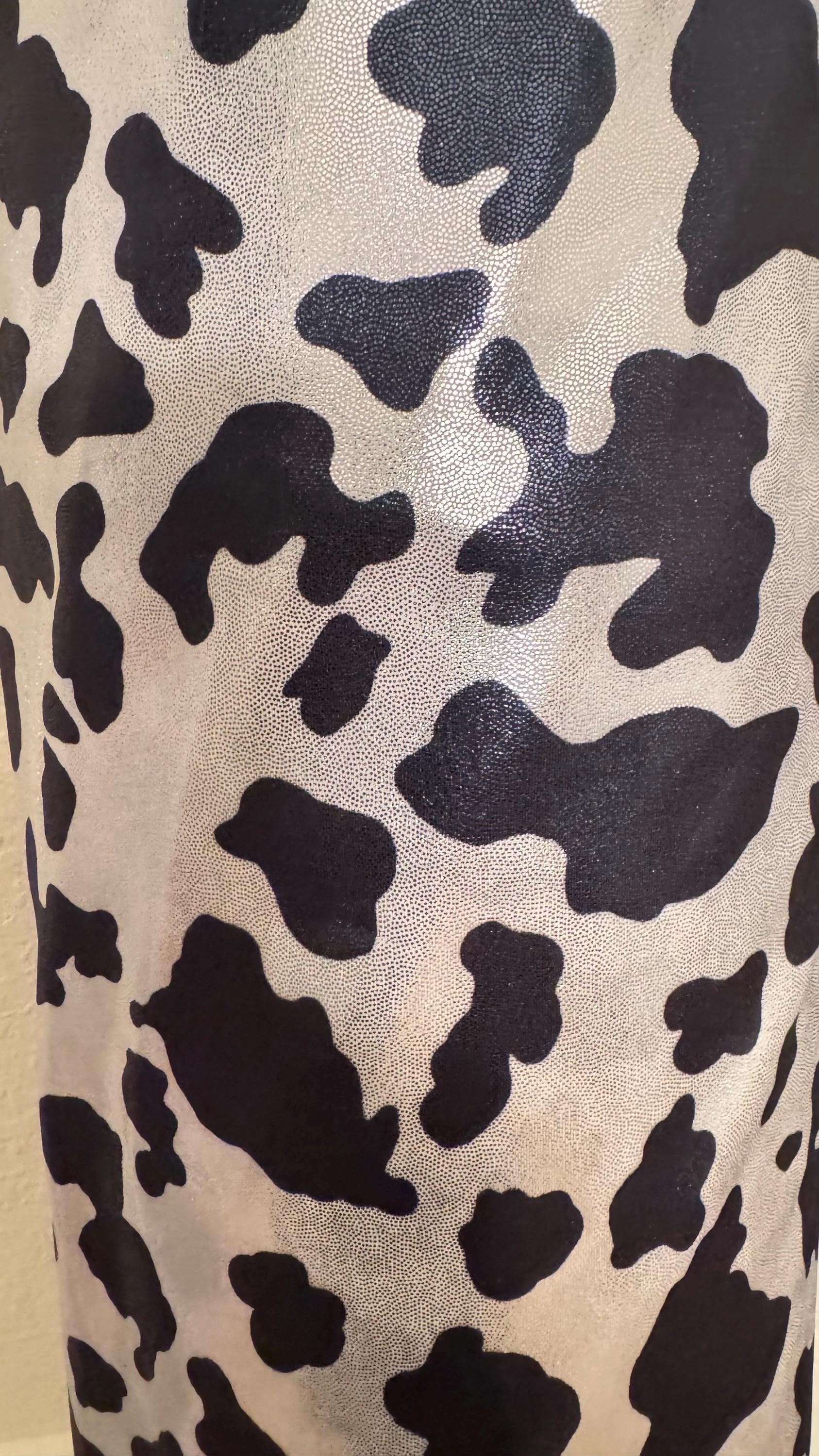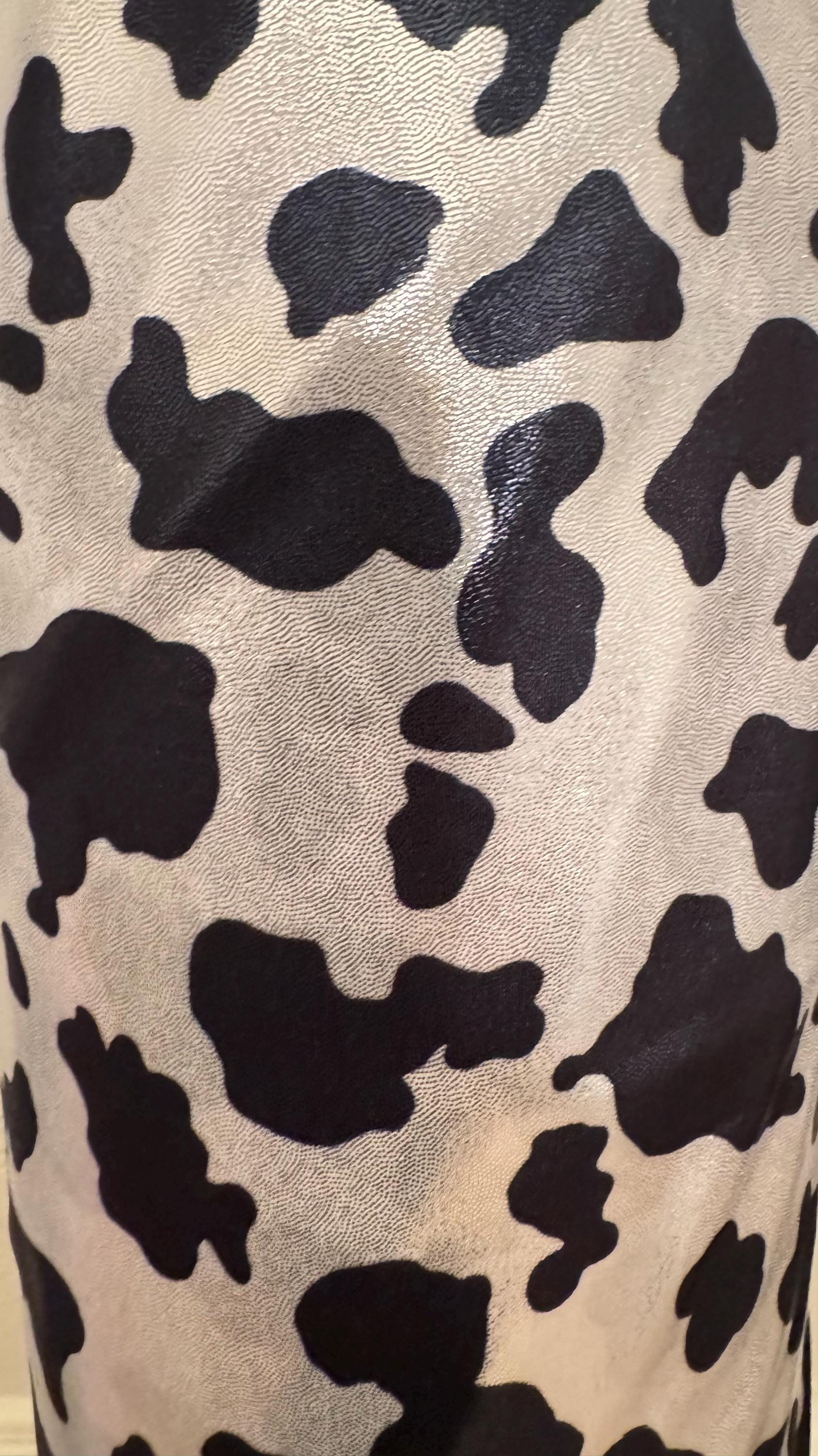 Luxury Cow design on shiny metallic nylon spandex with foggy foil 4-way stretch 58/60” High quality fabrics by AlexLAFabrics Sold by the YD. Ships worldwide from Los Angeles California USA
