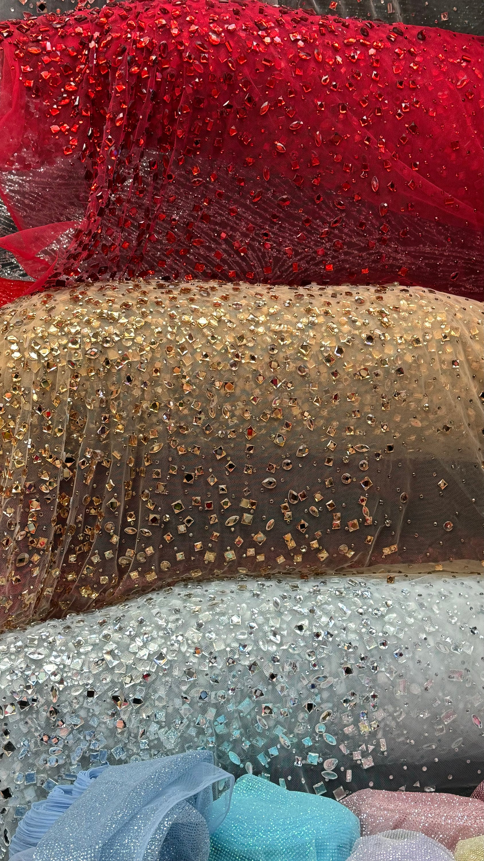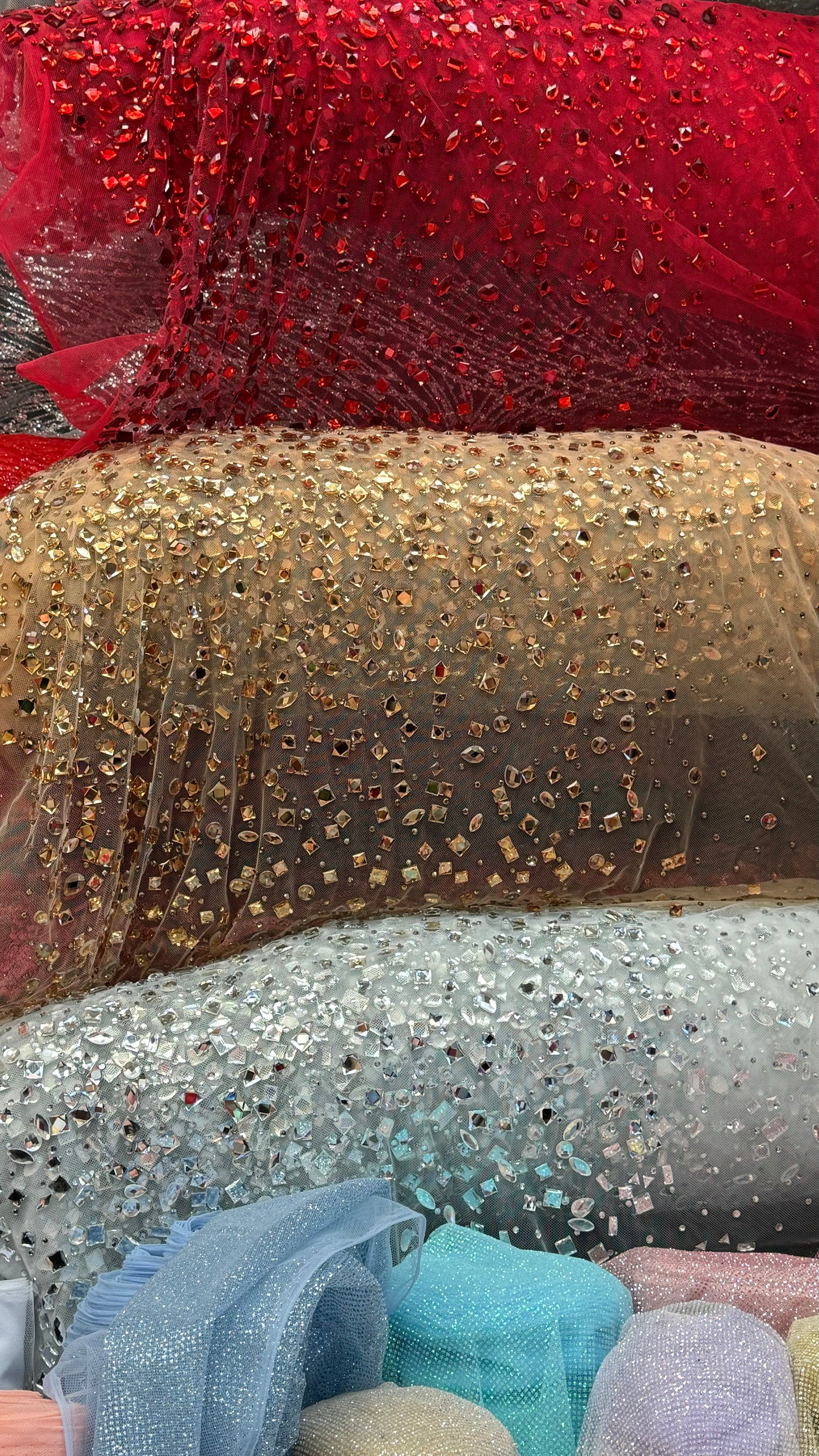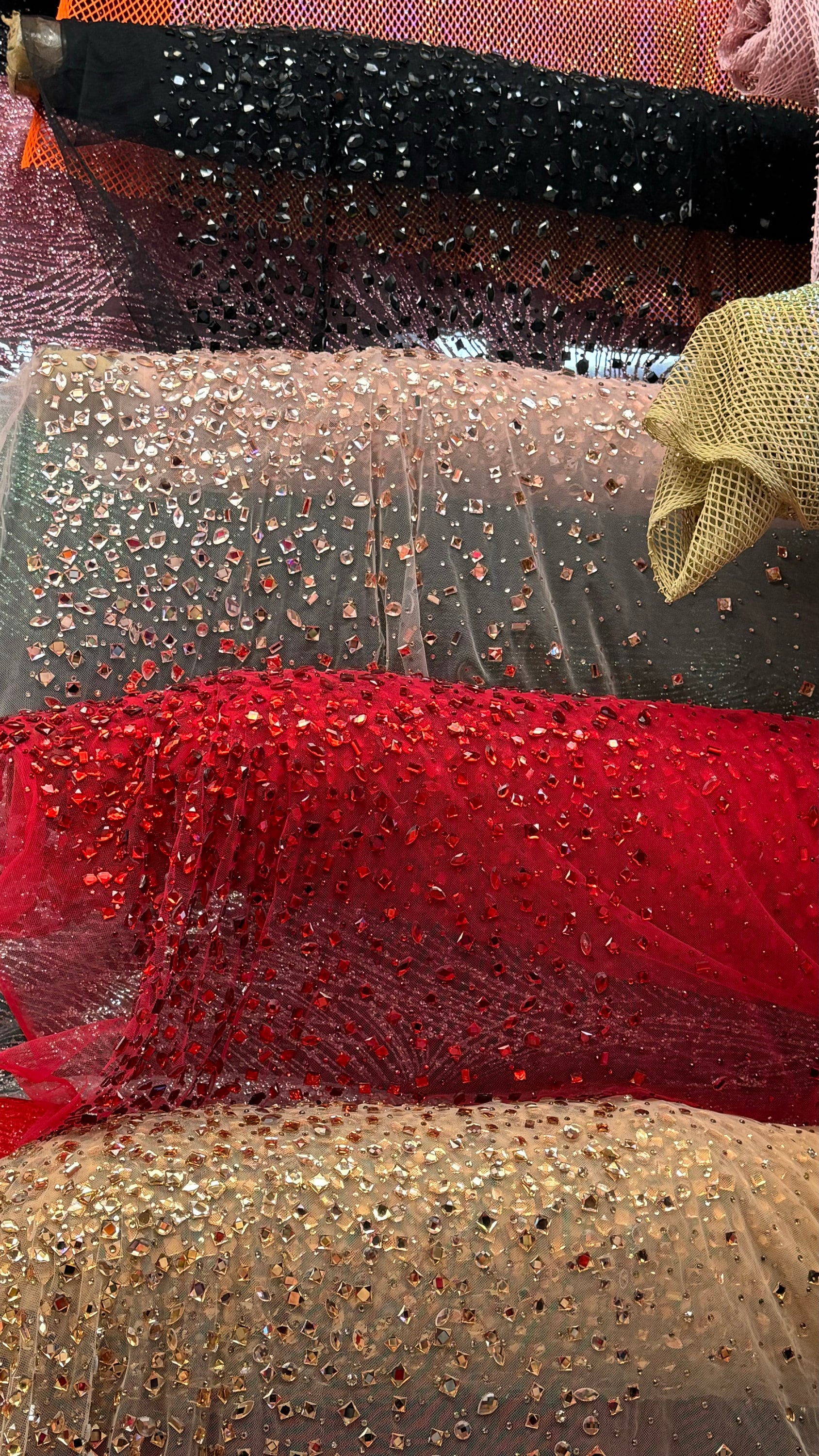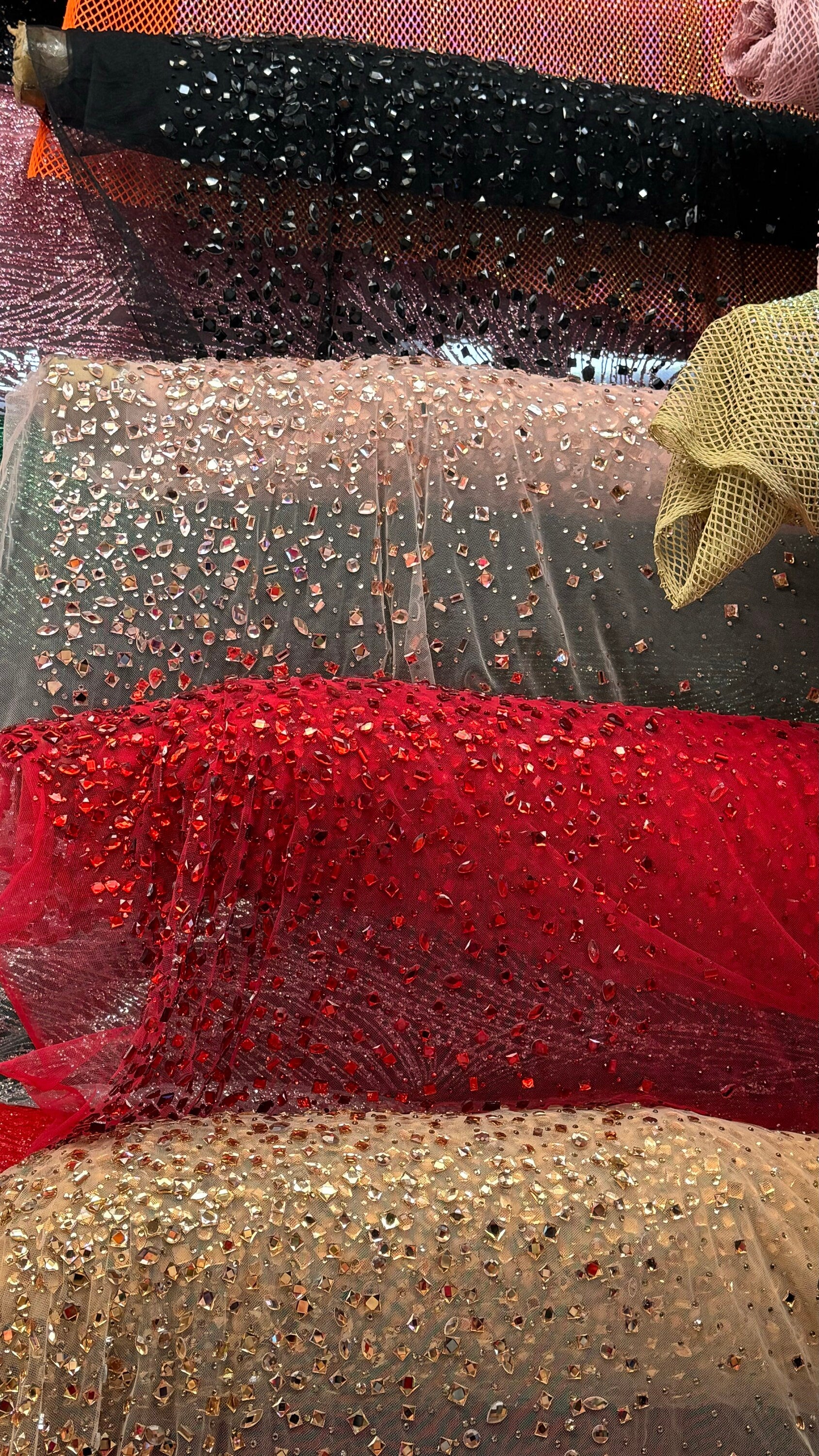 Luxury Diamond Rhinestone geometric design on stretch power mesh 4-way stretch 58/60” Sold by the YD. Ships Worldwide from Los Angeles California USA