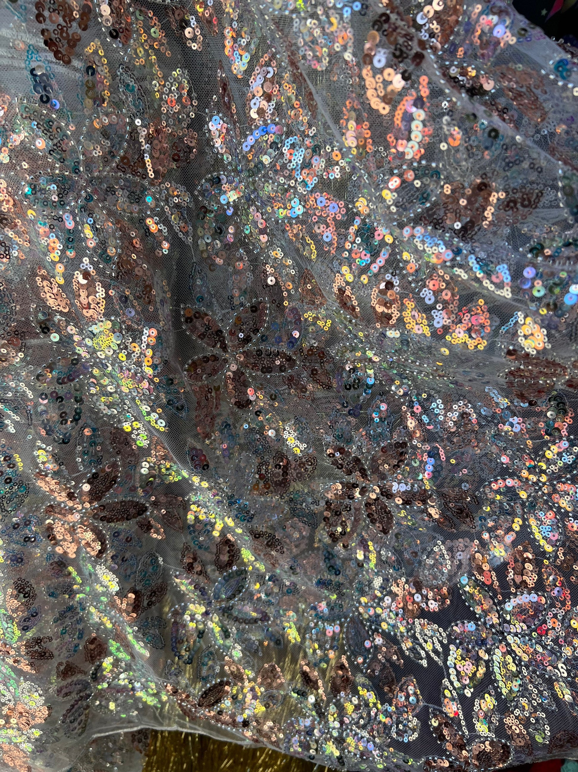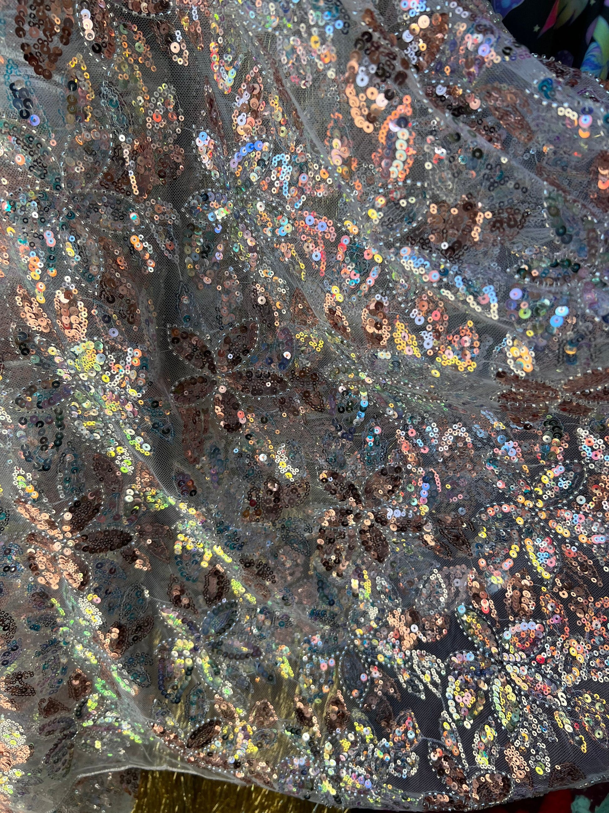 Luxury flower design embroidered and heavily beaded with Beads and Iridescent Sequins lace fabric 2-way Stretch 55/57” Sold by the YD. Ships Worldwide from Los Angeles California USA.