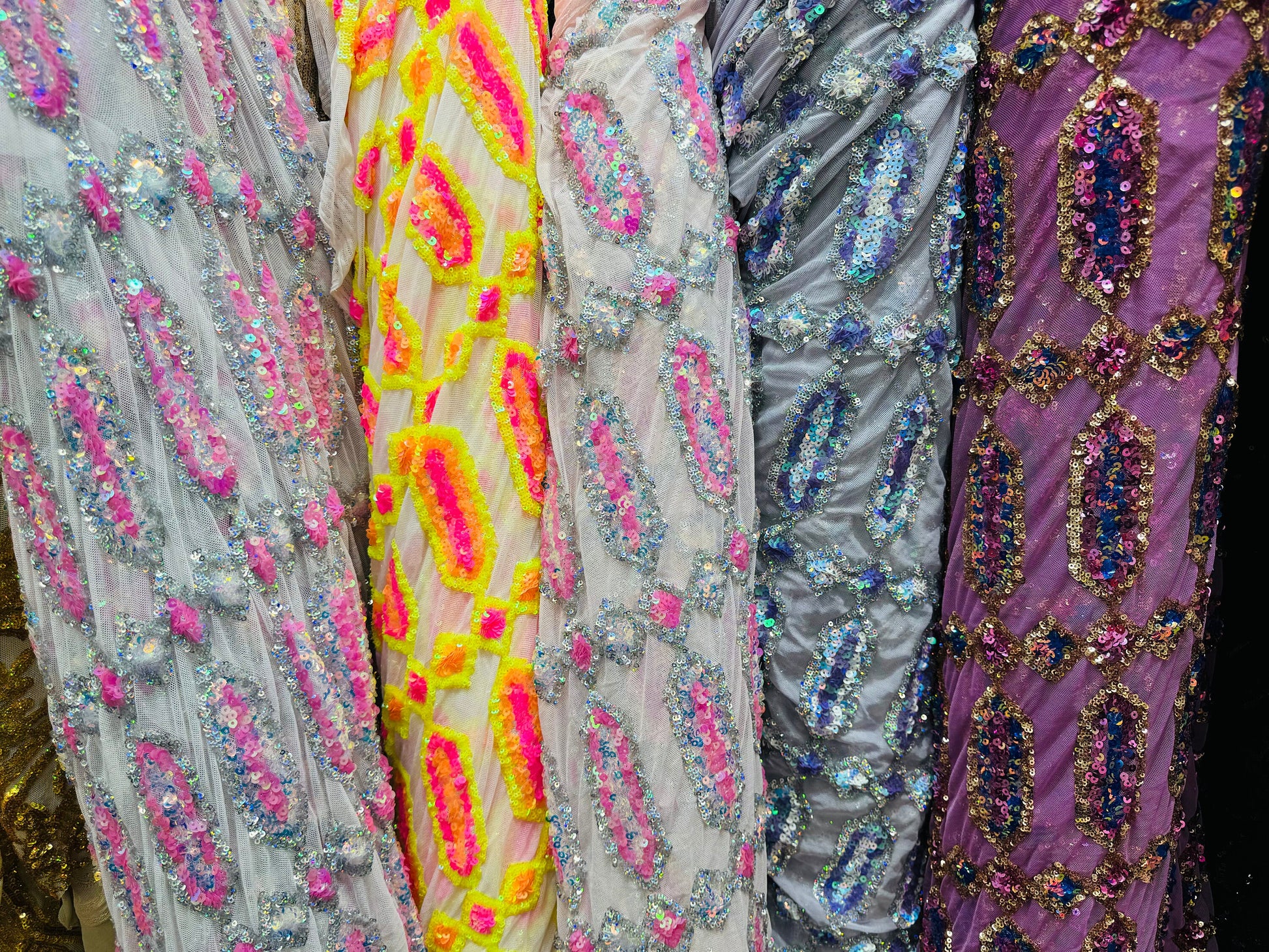 Luxury Geometric Avatar iridescent sequins on stretch power mesh 4-way 50/52” Sold by the YD. Ships worldwide from Los Angeles California