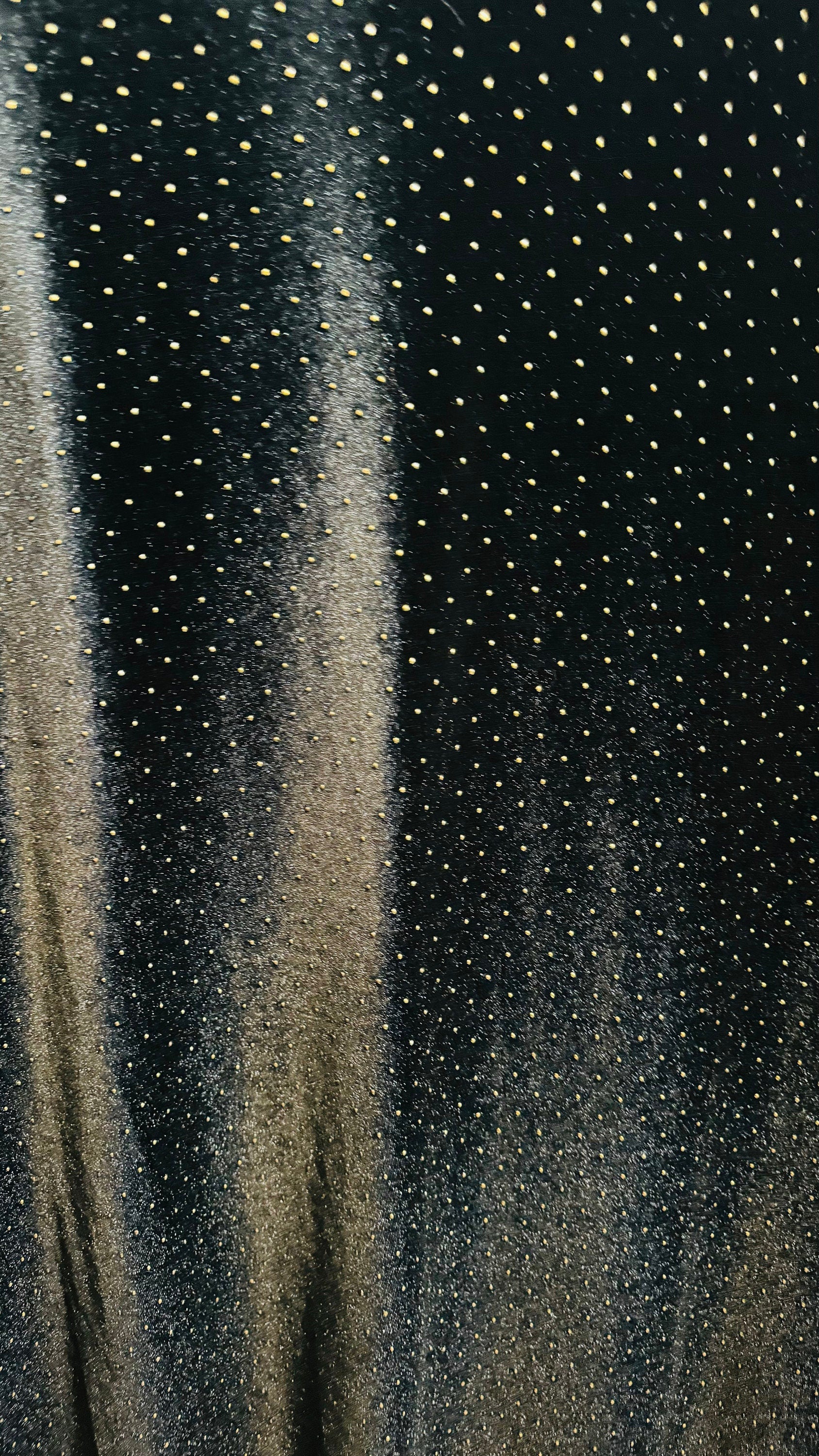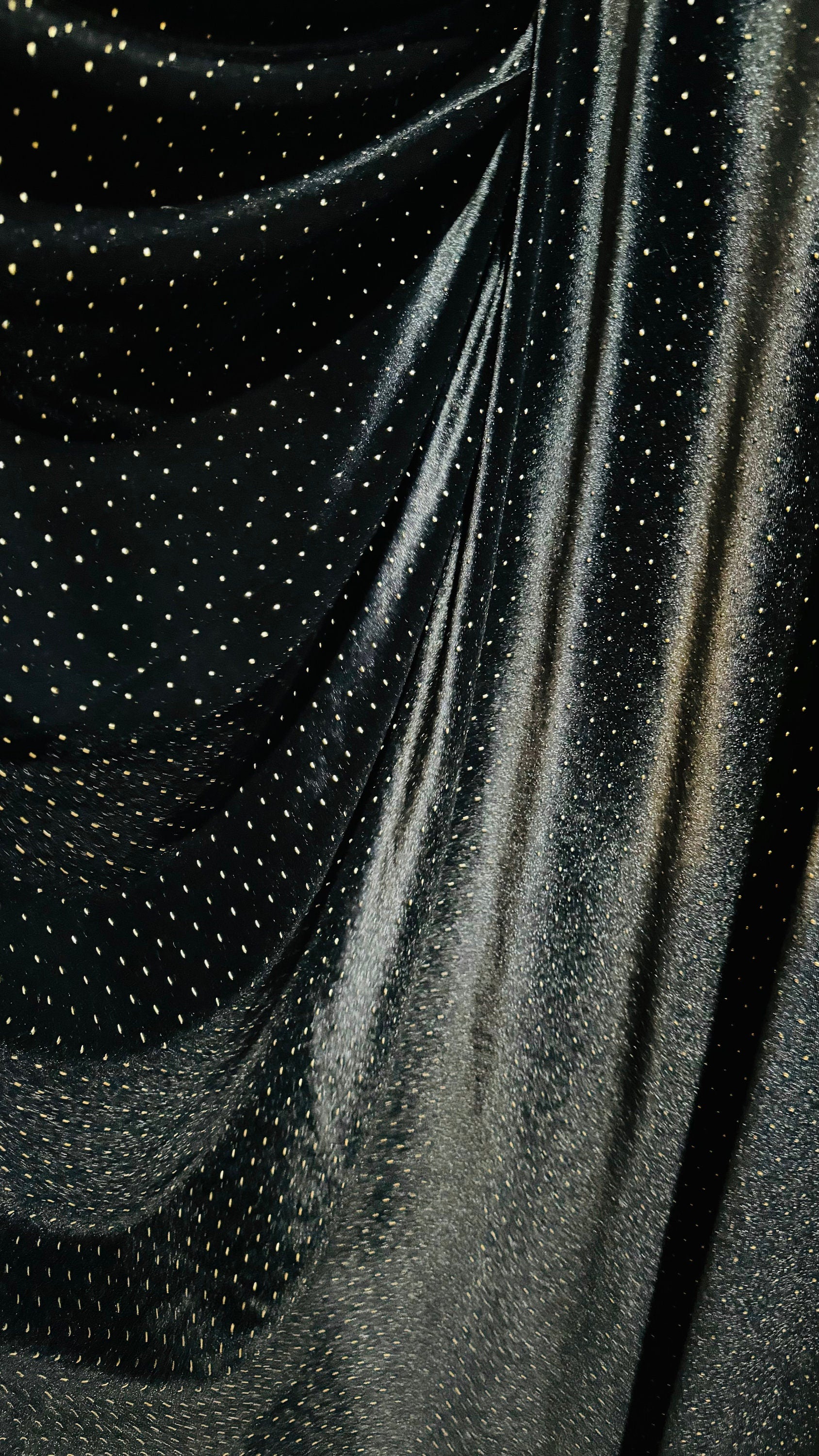 Luxury Gladiator stretch velvet with metallic dots Black/Gold 4-way stretch 58/60” Sold by the YD. Ships Worldwide from Los Angeles California USA.