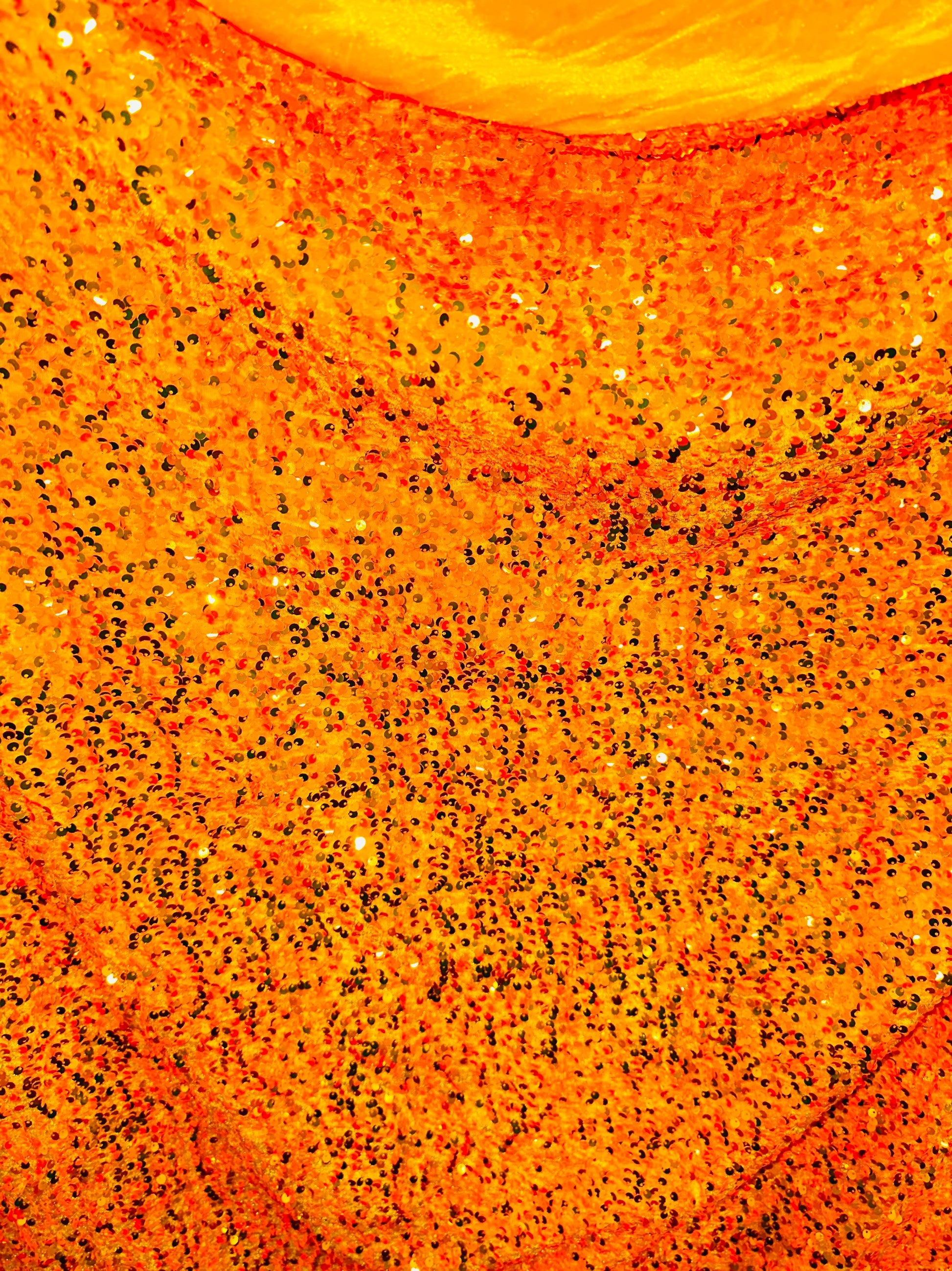 Luxury Iridescent sequins neon orange embroidered on stretch velvet 4-way stretch 58/60” Sold by the YD. Ships worldwide from Los Angeles California USA