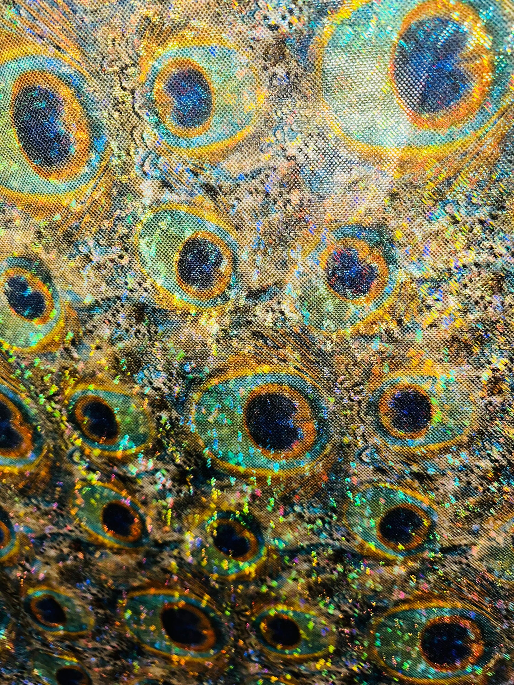 Luxury Peacock design on hologram shattered glass metallic nylon spandex 4-way stretch 58-60” Sold by the YD. Ships worldwide from Los Angeles California USA