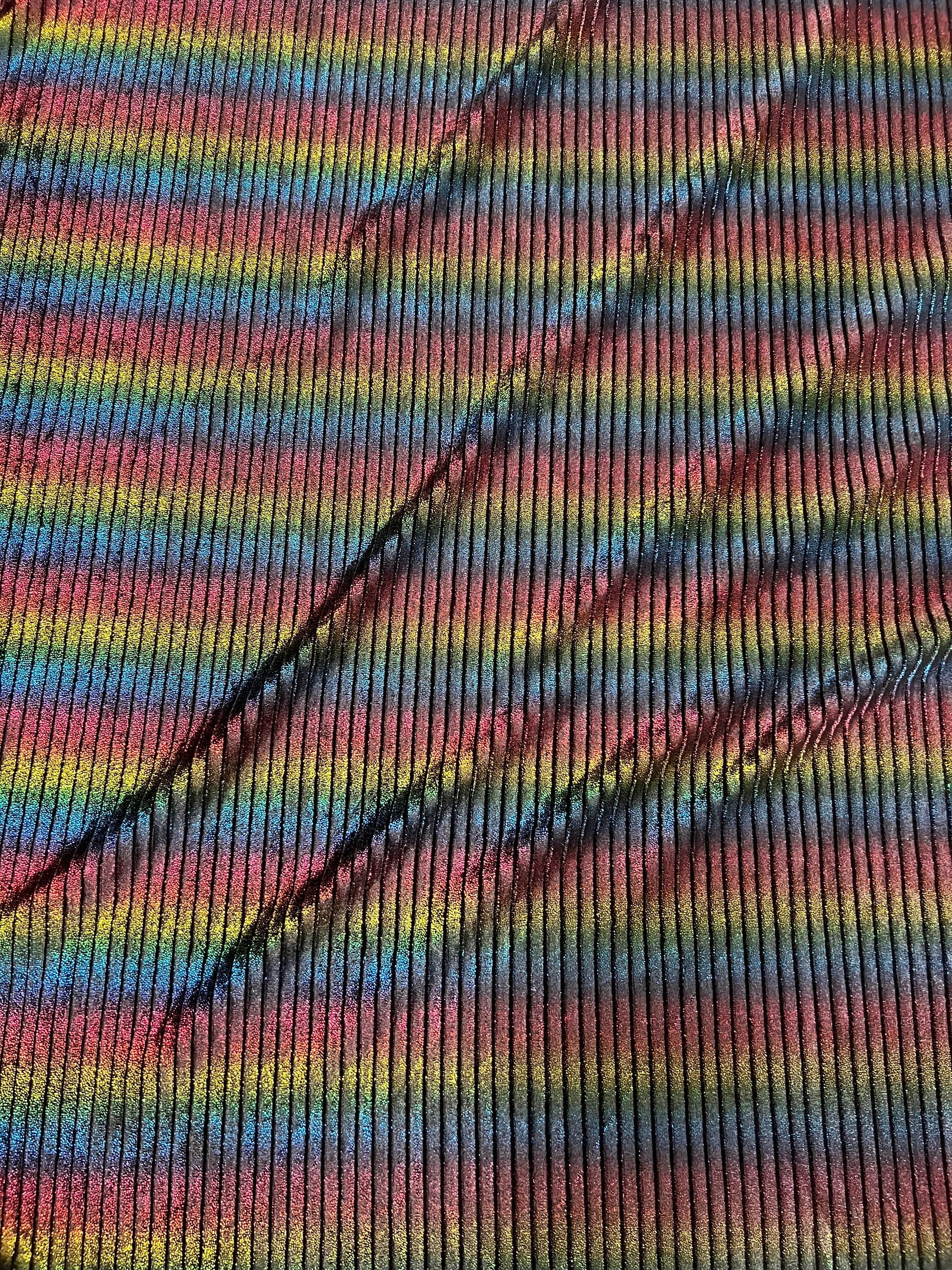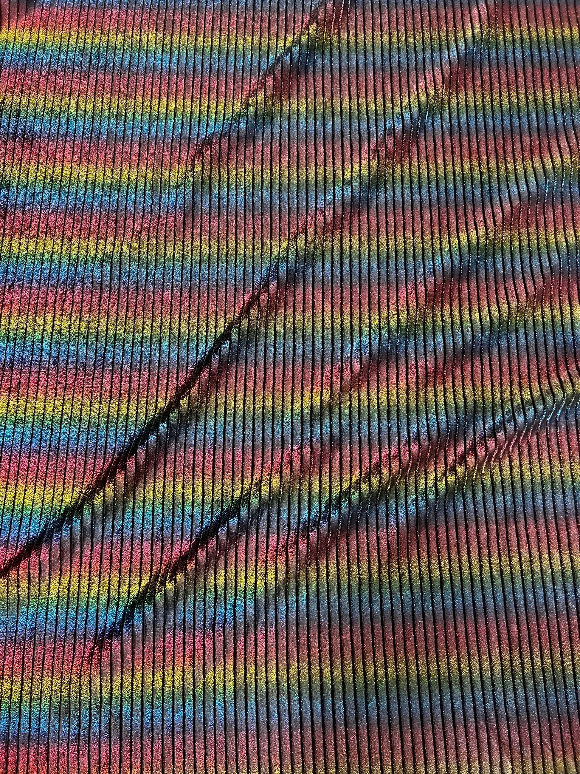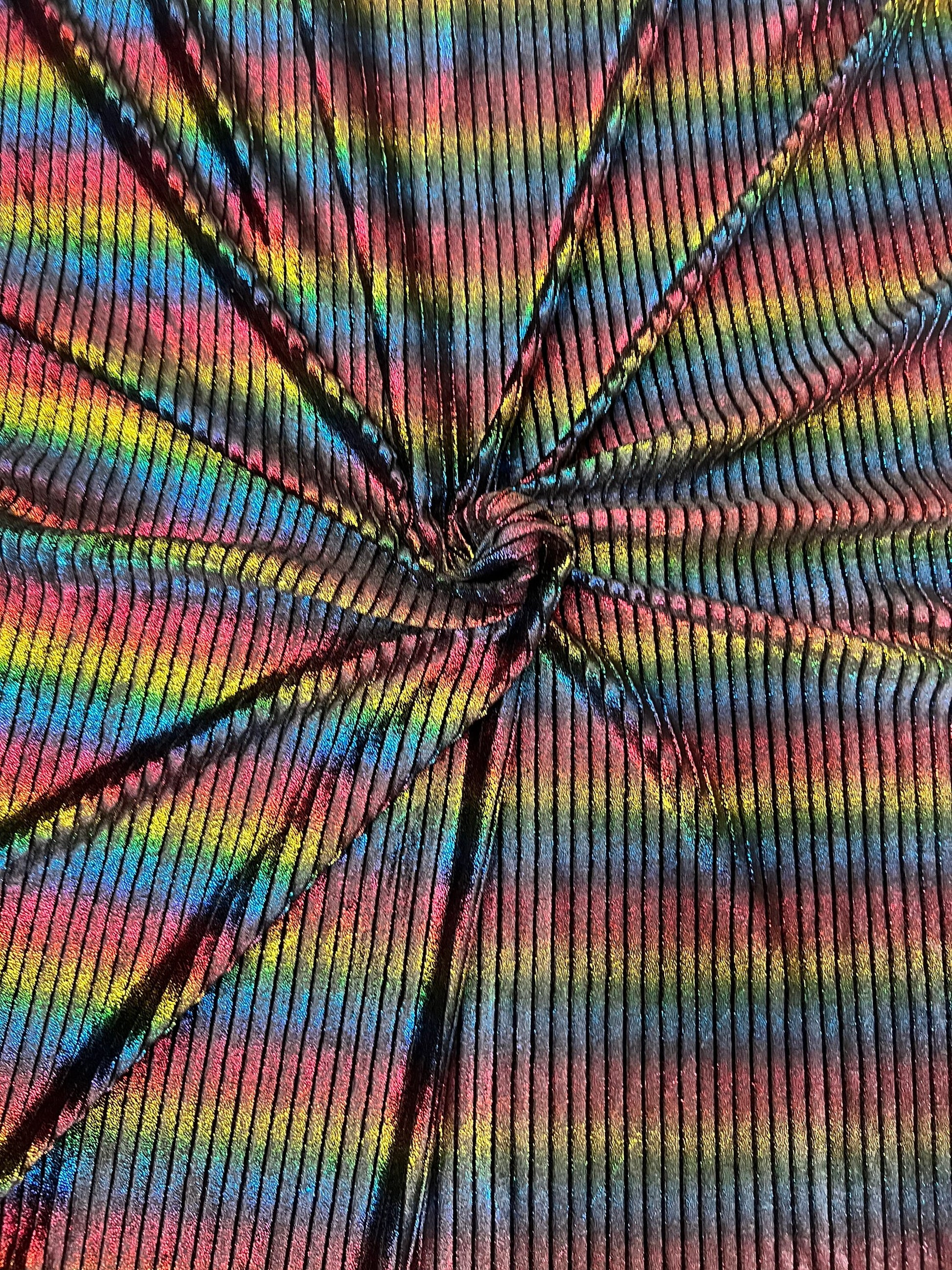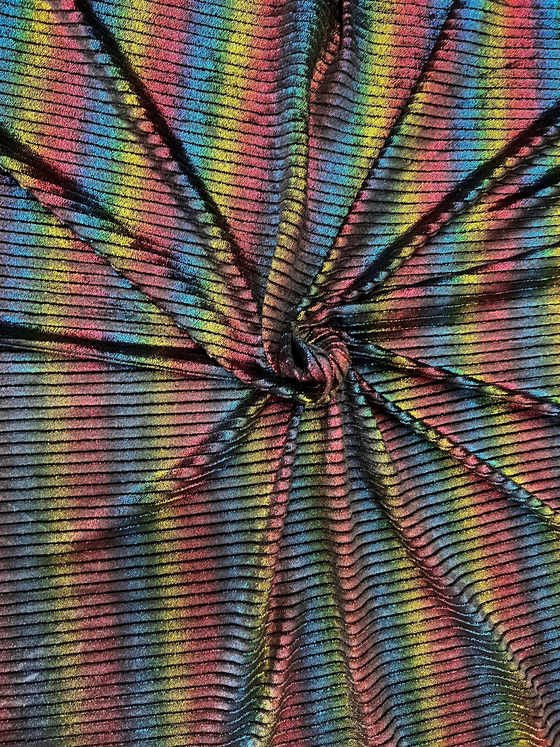 Luxury Pleated stretch velvet with foil Black/Rainbow 2-way stretch 58/60” Sold by the YD. Ships Worldwide from Los Angeles California USA