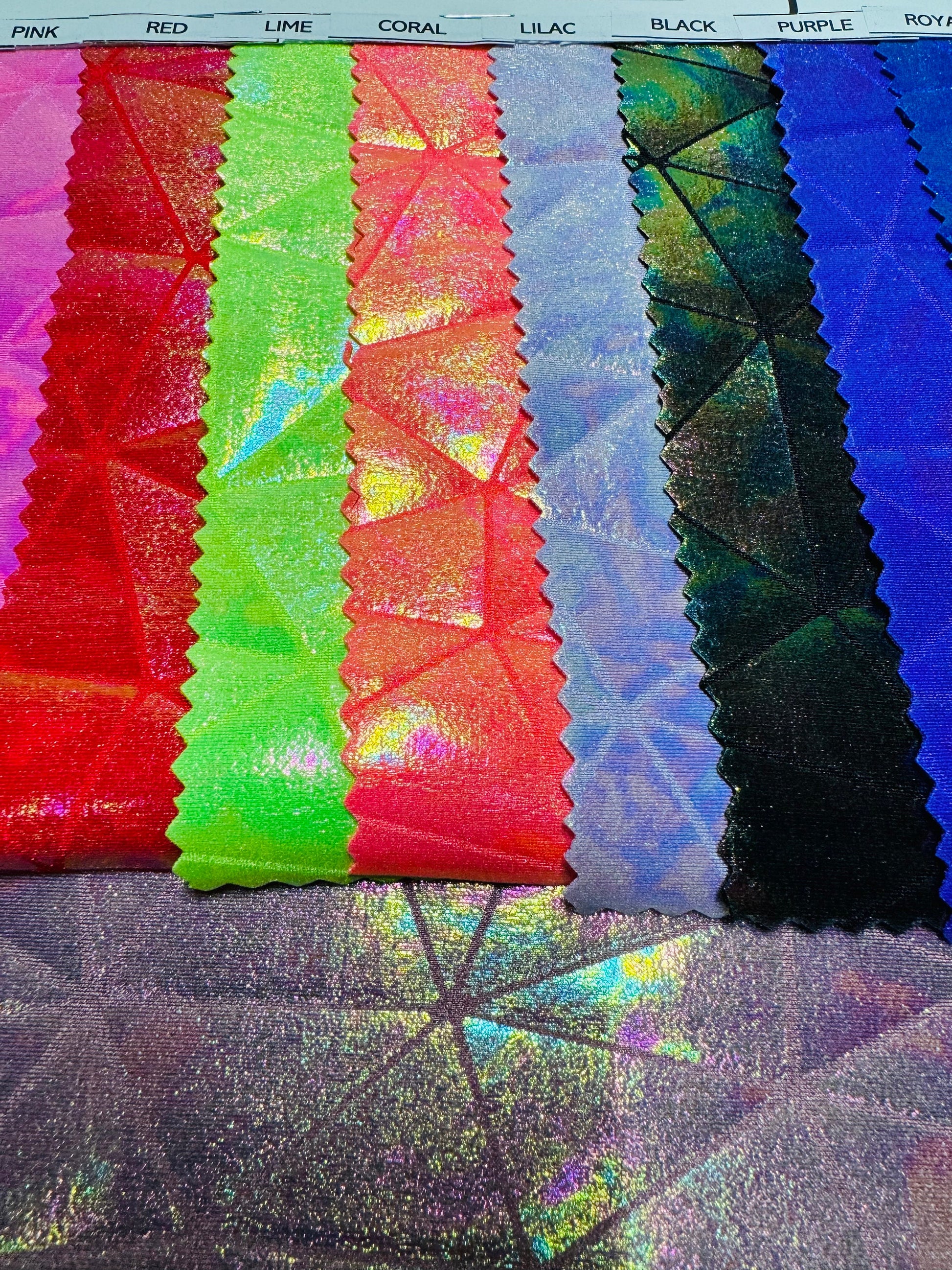 Luxury shattered glass design iridescent all over foil on nylon spandex 4-way stretch 58/60” Sold by the YD. Ships worldwide from Los Angeles California USA.