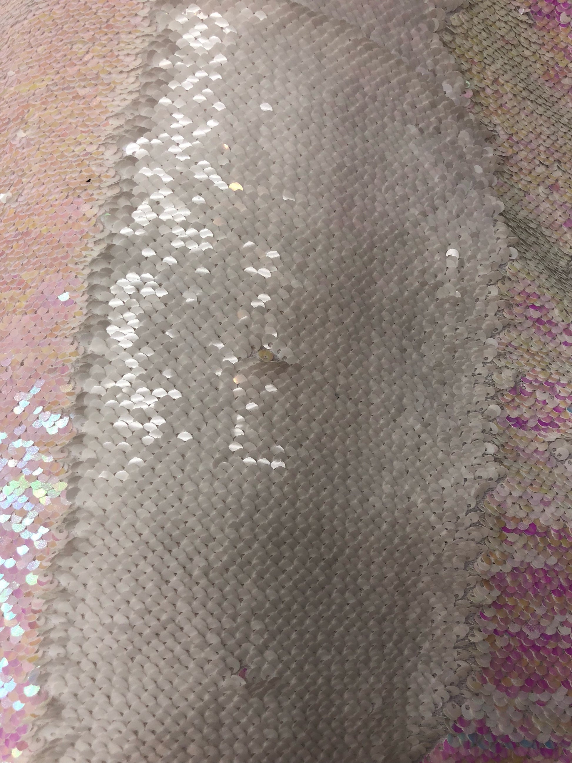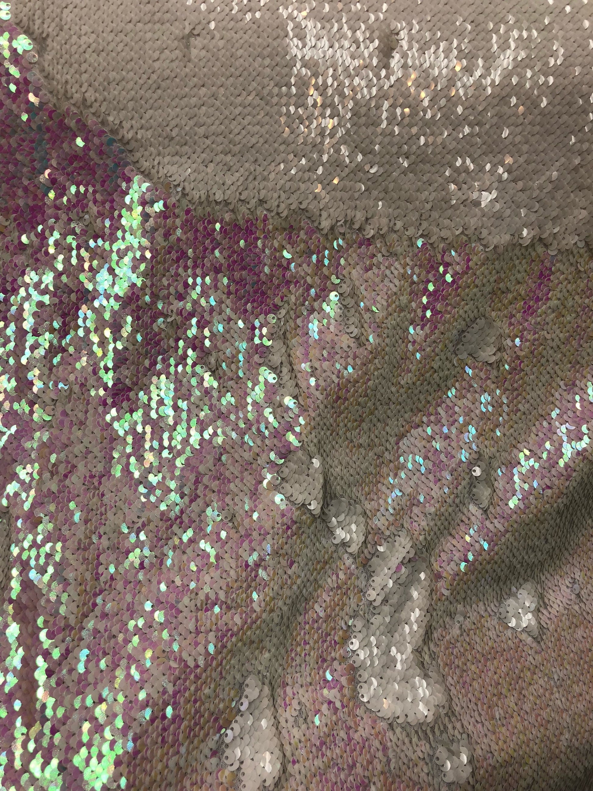 Mermaid sequins iridescent white 2tone with spandex base 2 way Stretch 58/60" Sold by the YD. Ships worldwide from Los Angeles California.