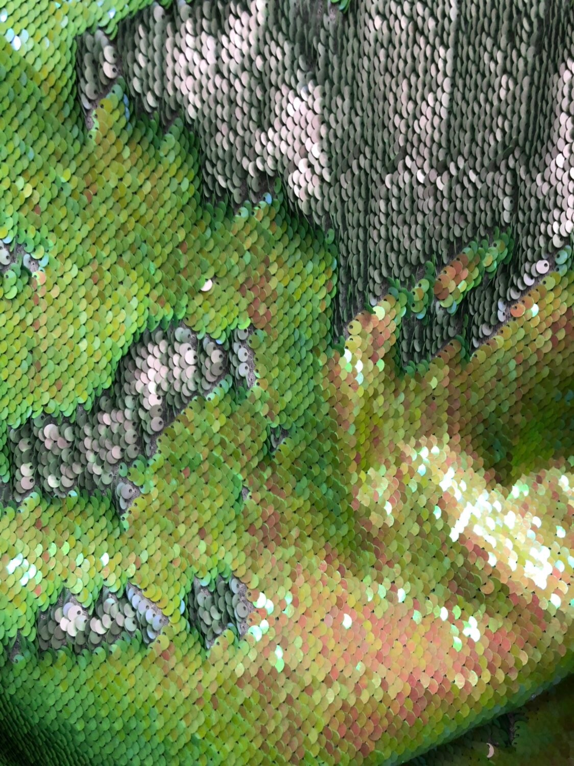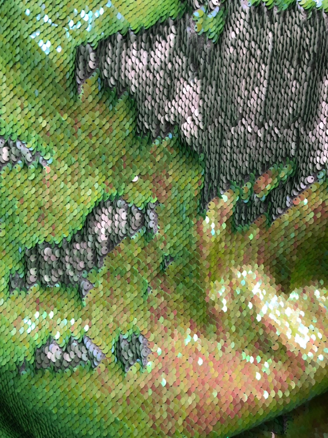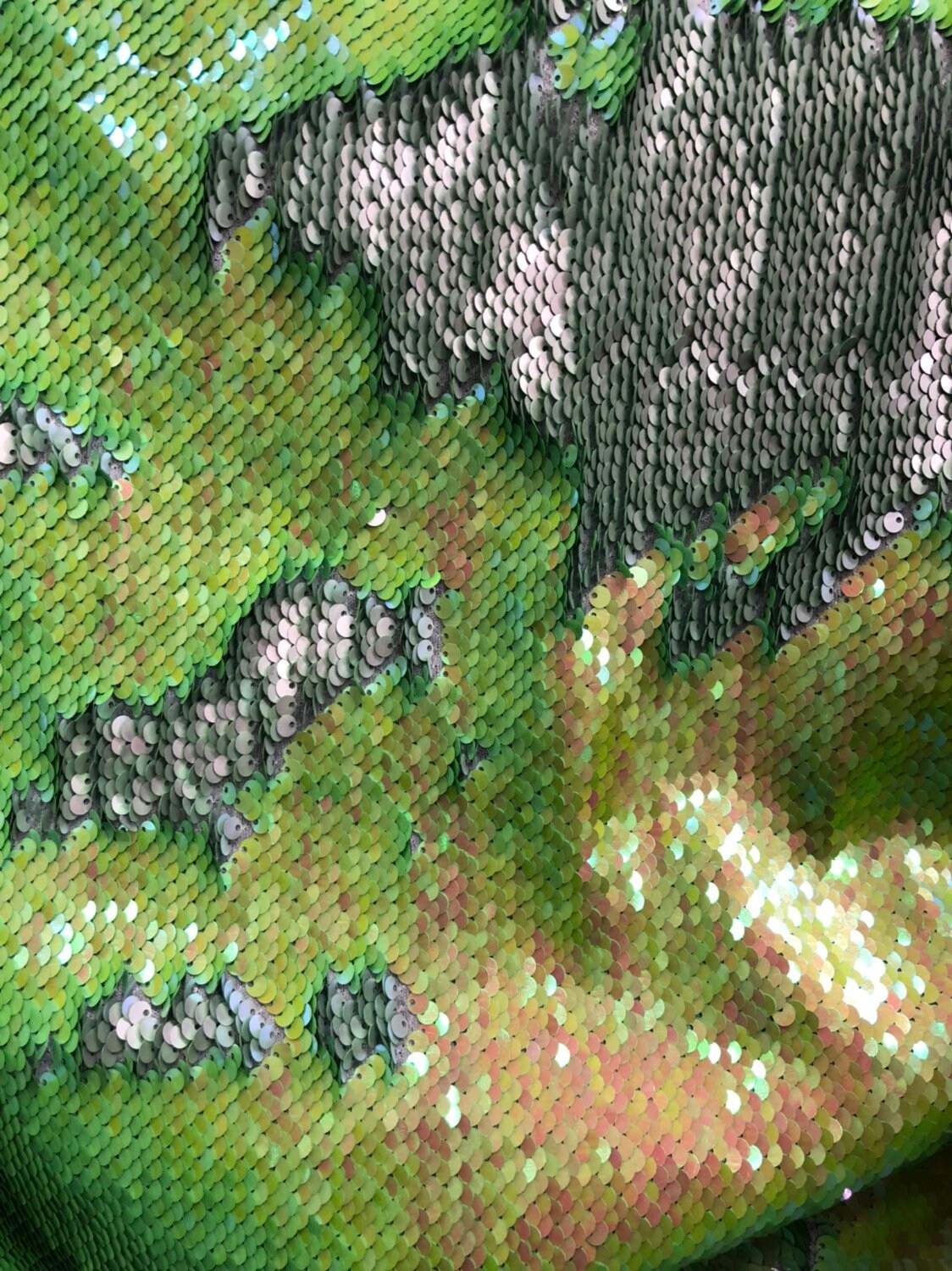 Mermaid sequins Iridescent lime/silver reversible 2tone sequins on stretch base 2way 58/60" Sold by the YD. Ships worldwide from Los Angeles California USA.
