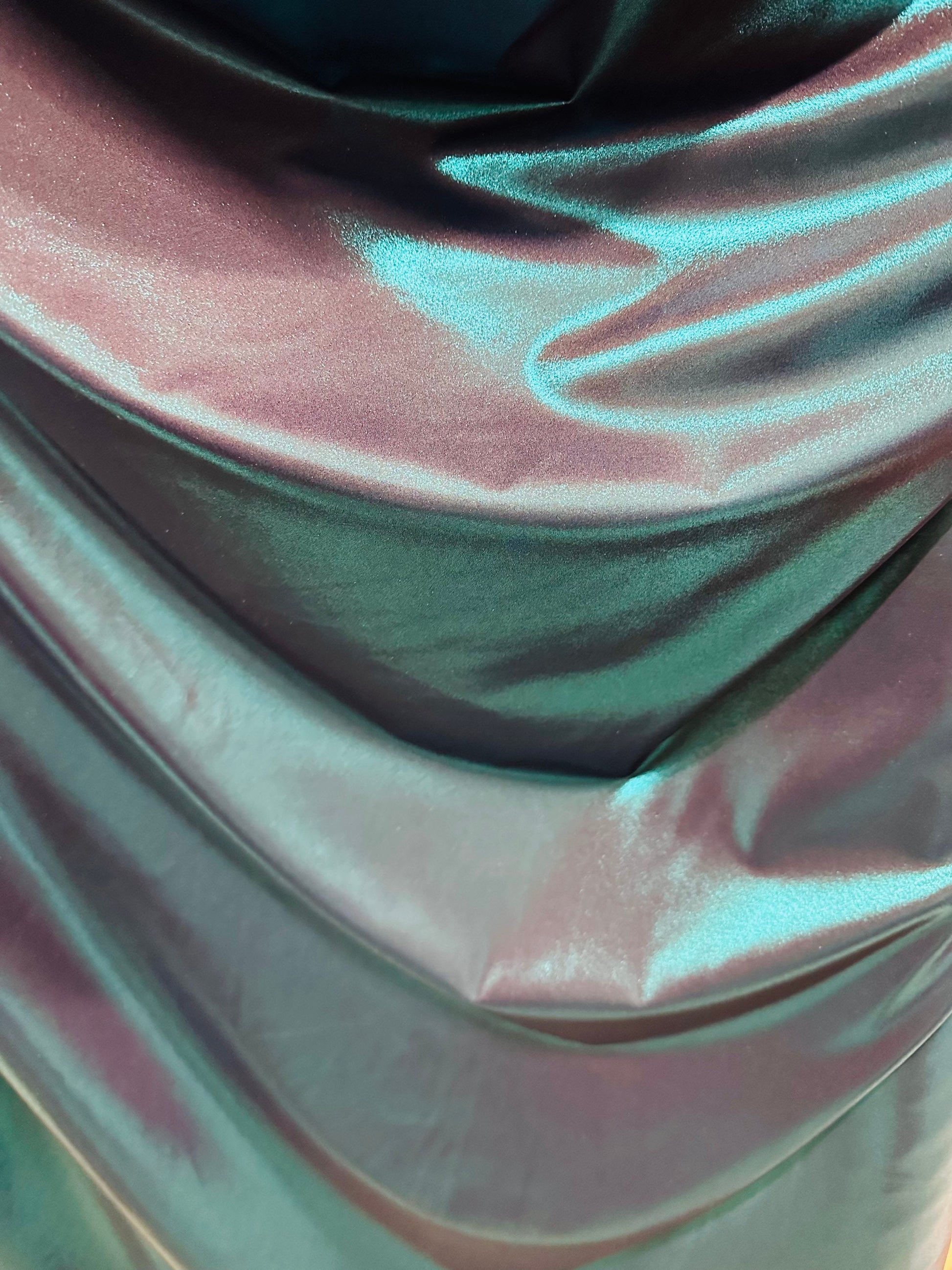 Metallic nylon spandex with foggy foil Navy/Teal iridescent foil 4-way stretch 58/60” Sold by the YD. Ships worldwide