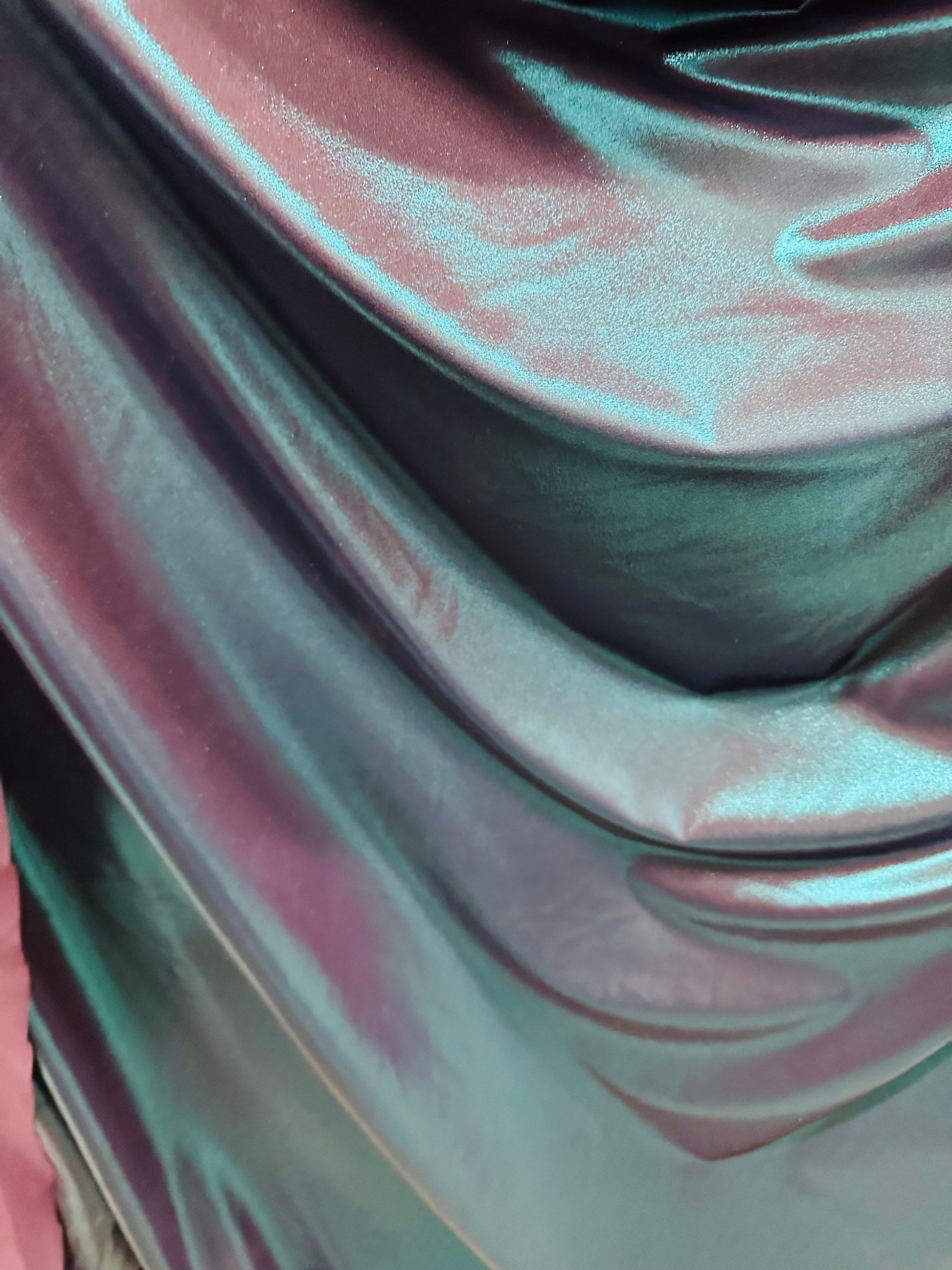 Metallic nylon spandex with foggy foil Navy/Teal iridescent foil 4-way stretch 58/60” Sold by the YD. Ships worldwide from Los Angeles California USA