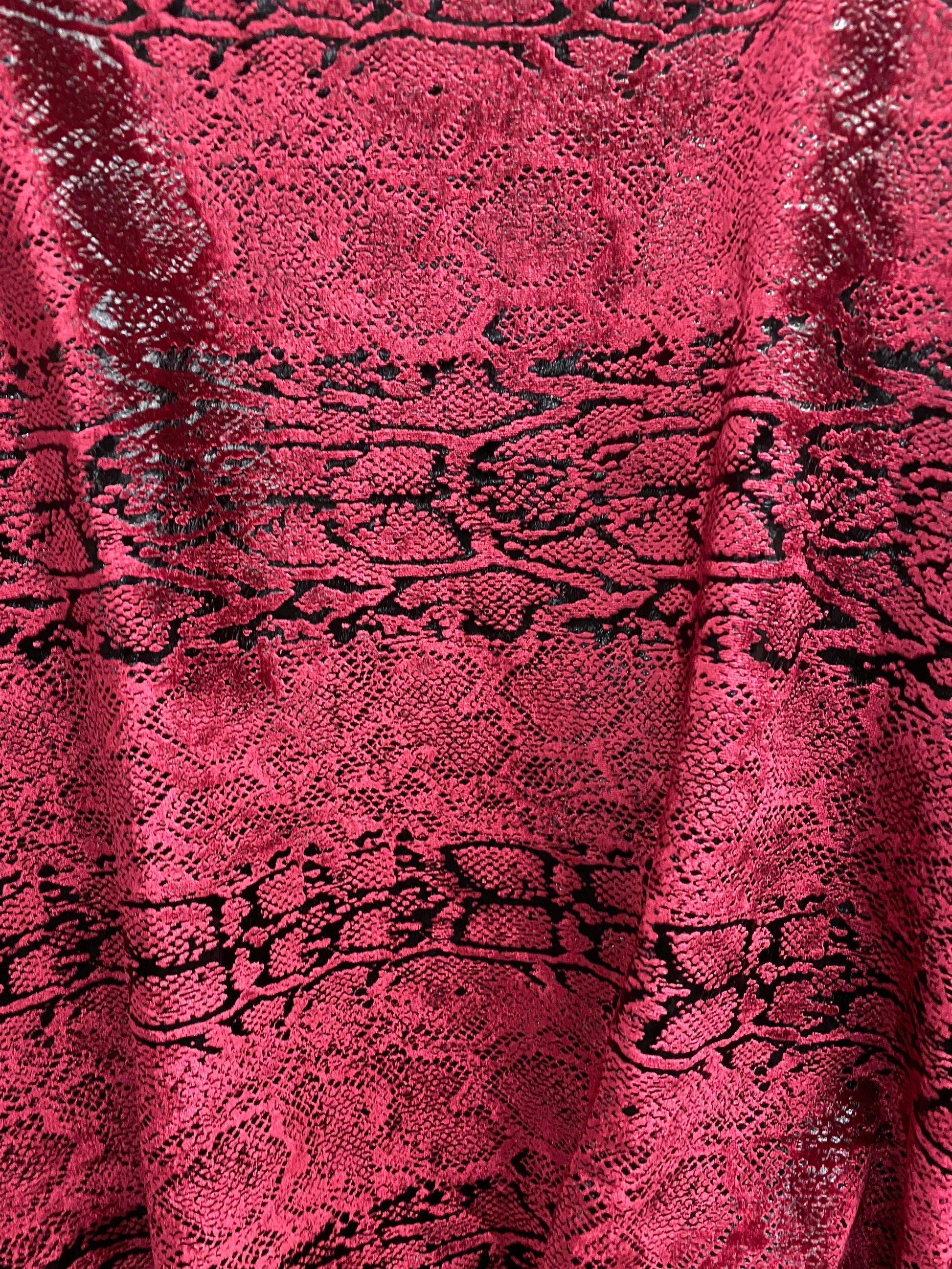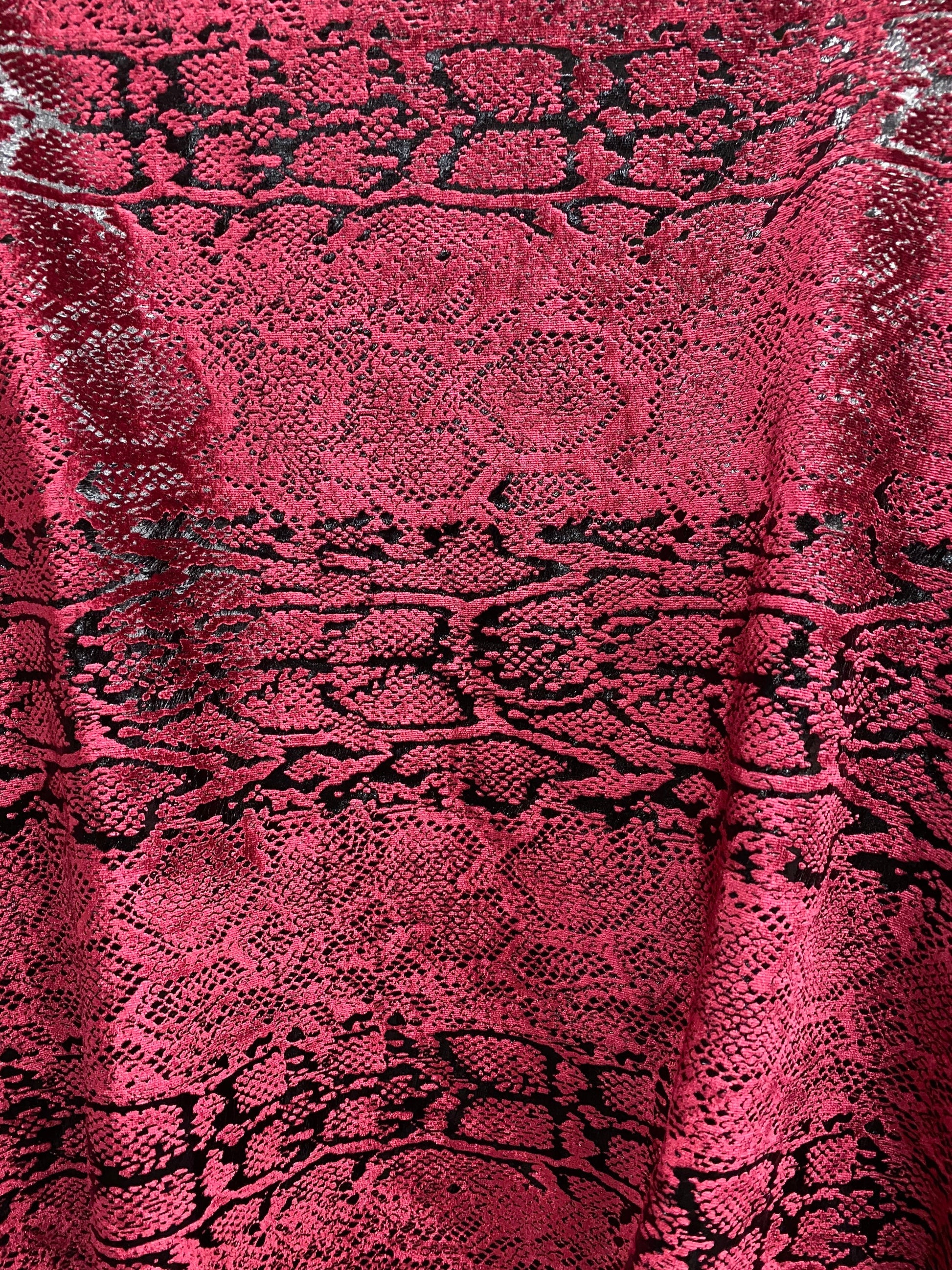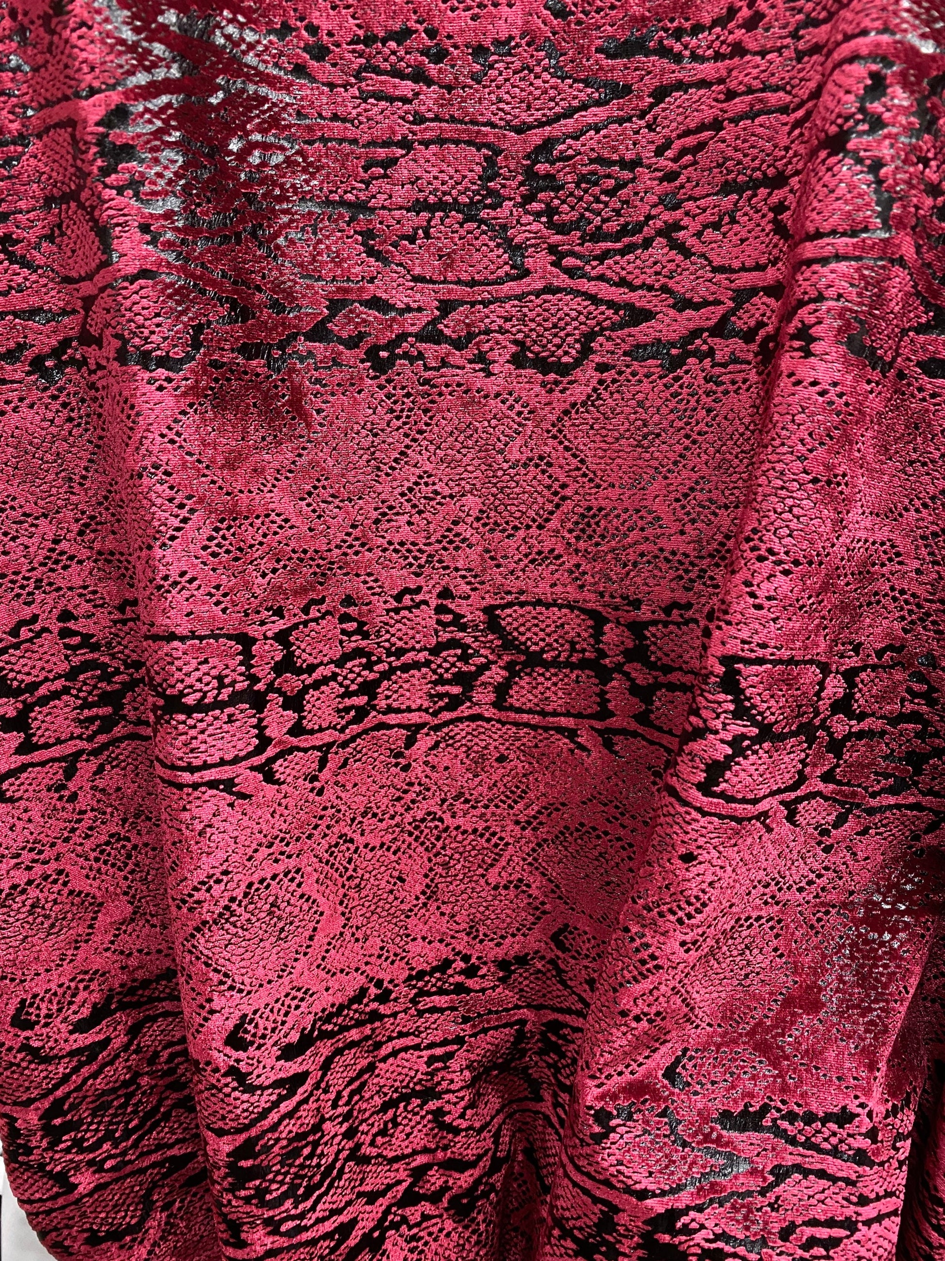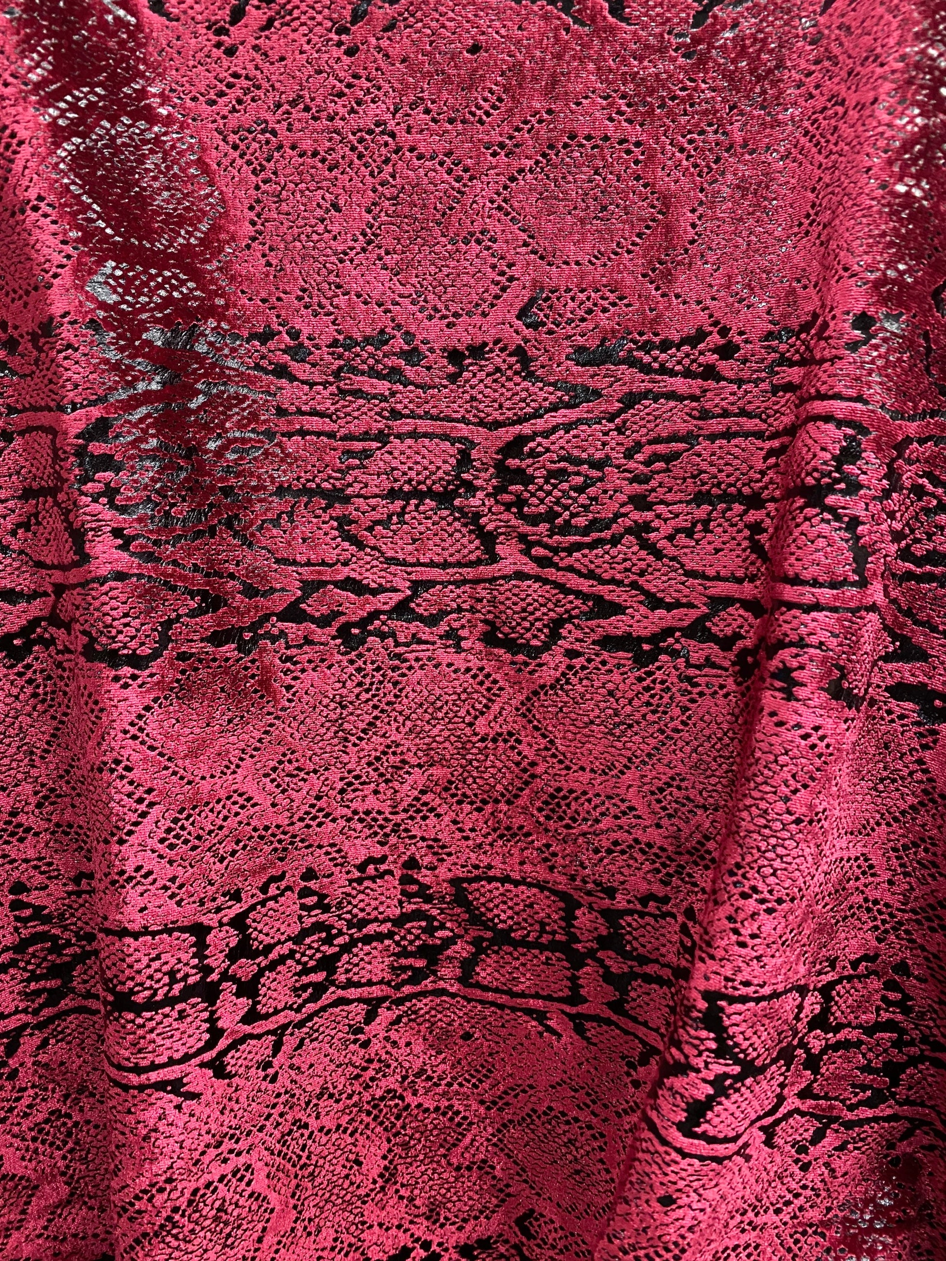 Metallic Stretch velvet snake design burgundy/black 2-way stretch 58/60” Sold by the YD. Ships worldwide from Los Angeles California USA.