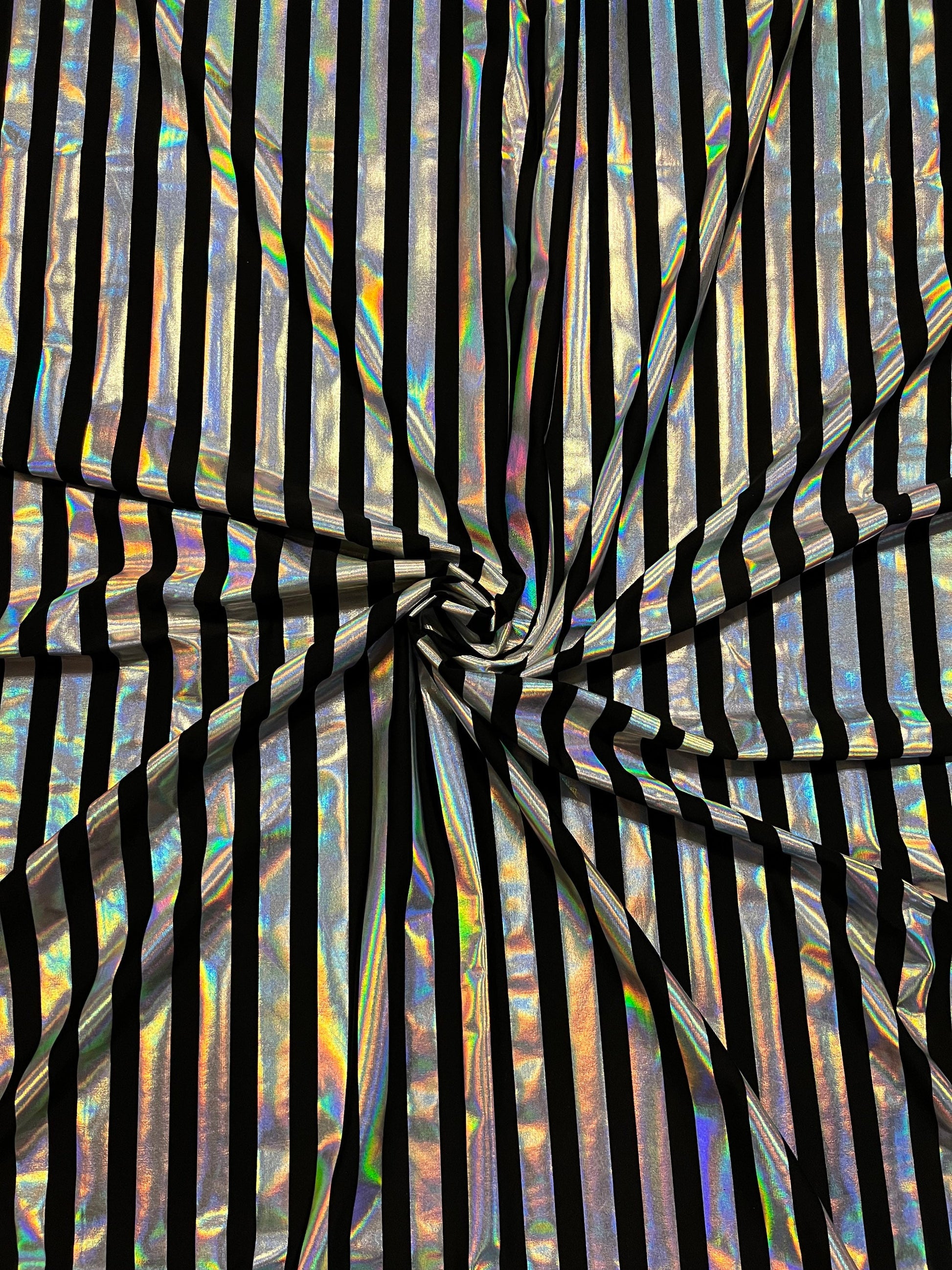 Metallic stripe design black/iridescent silver poly spandex 2-way stretch with lacer foil 58/60” Sold by the YD. Ships Worldwide from Los Angeles California USA.