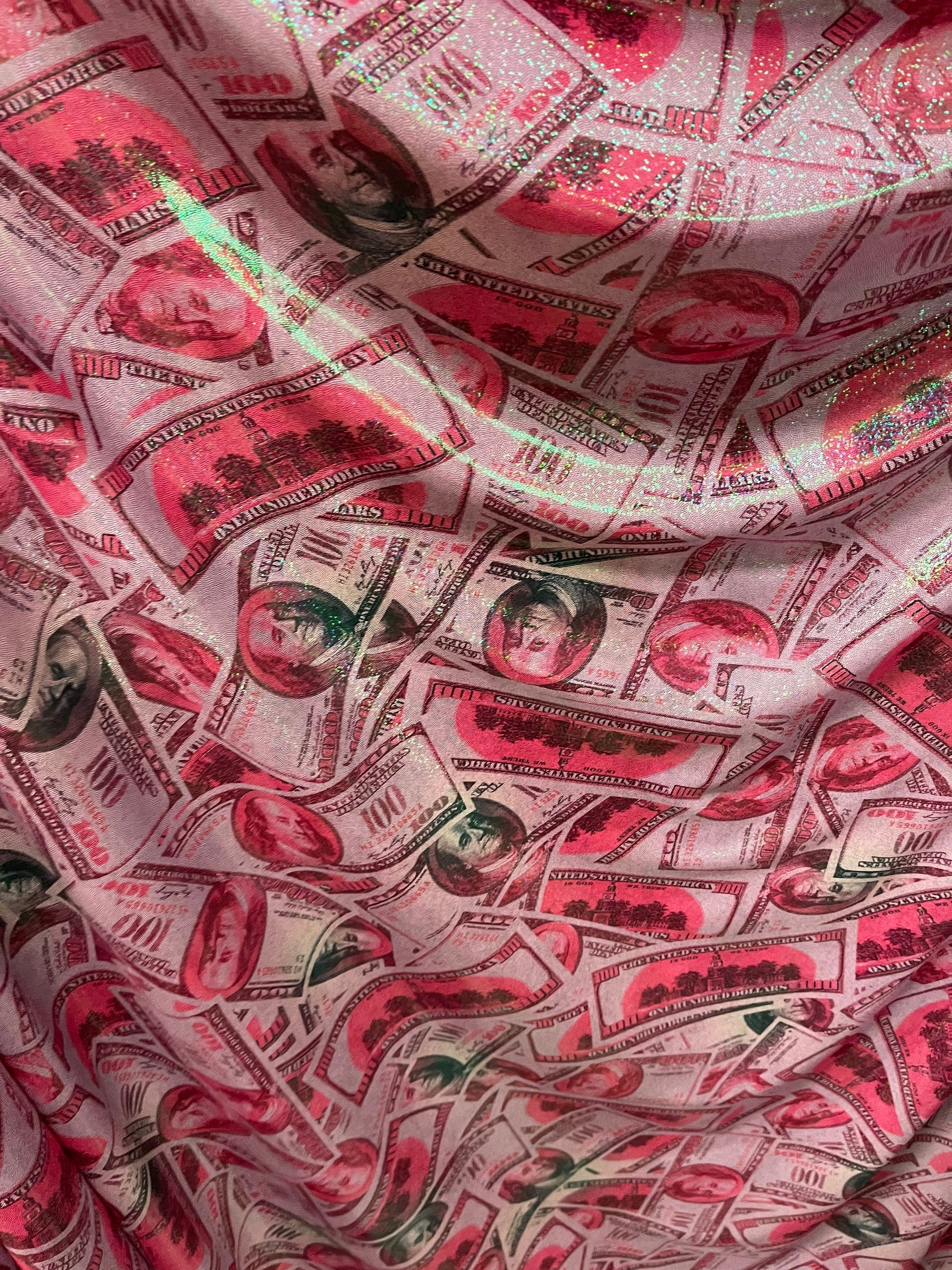 Money design 100 dollars bill print on metallic nylon spandex 4-way stretch 58/60” Sold by the YD. Ships Worldwide from Los Angeles cali.