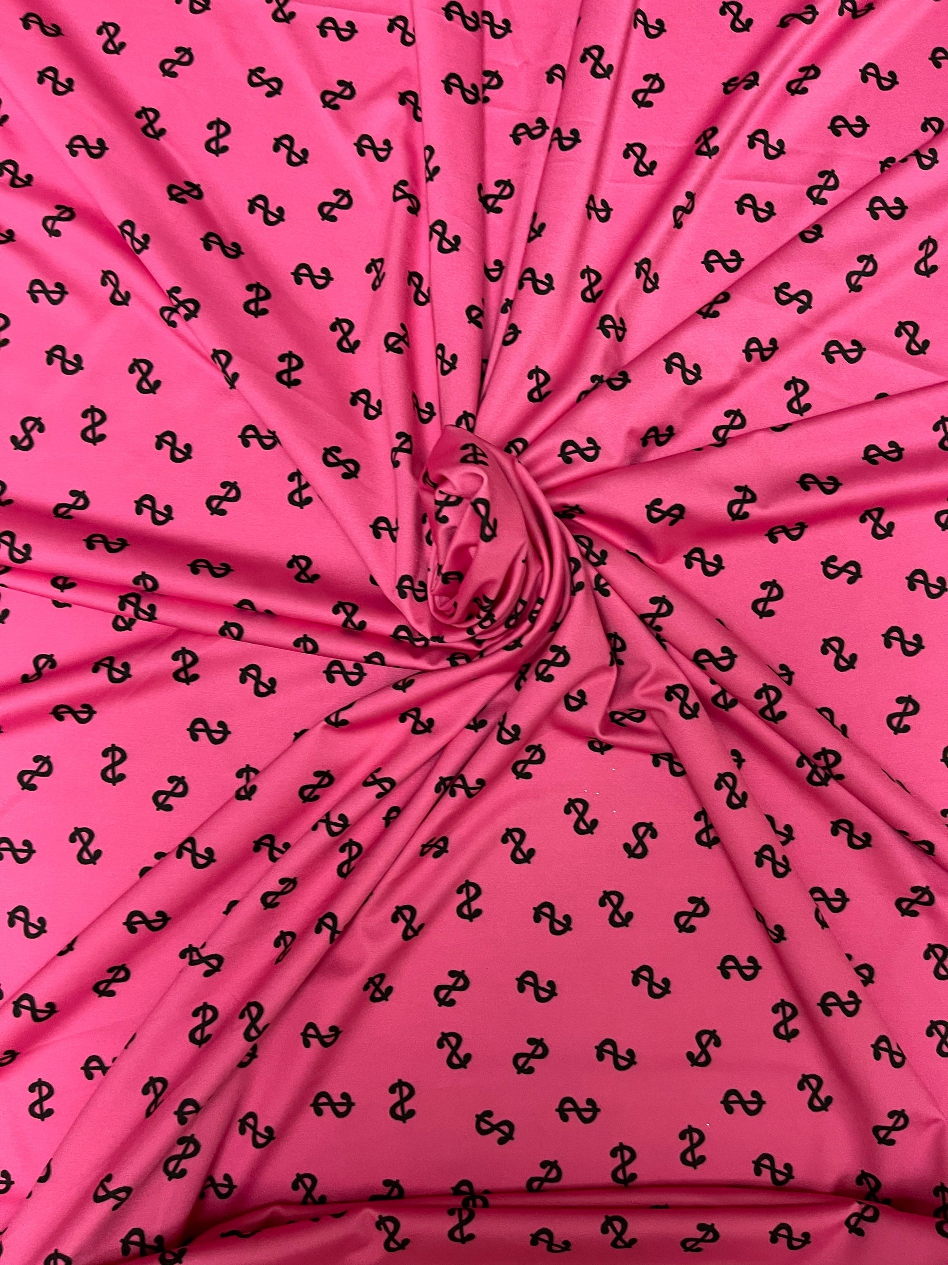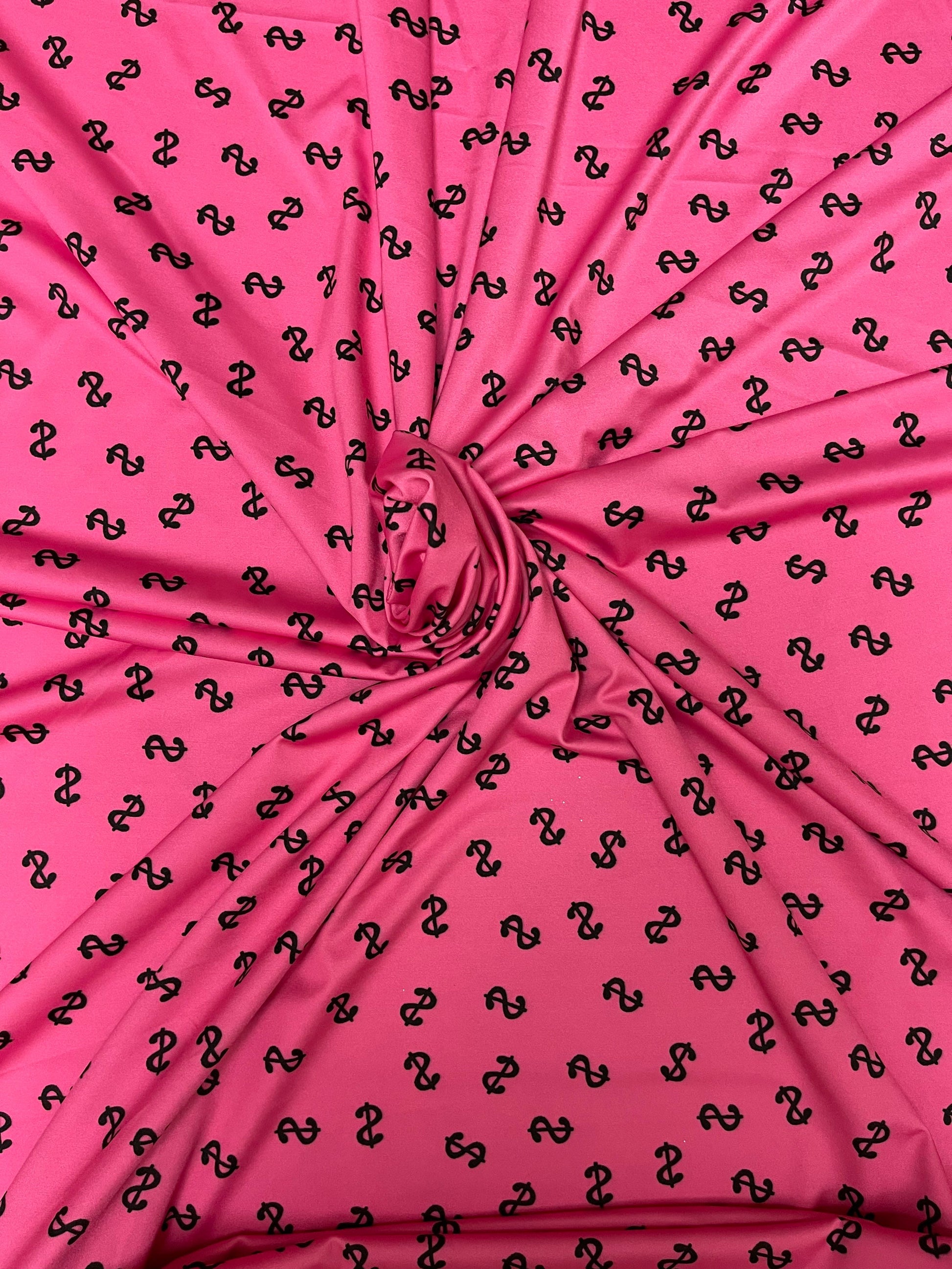 Money symbol design pink/black print on best quality of nylon spandex 4-way stretch 58/60” Sold by the YD. Ships Worldwide from Los Angeles California USA.