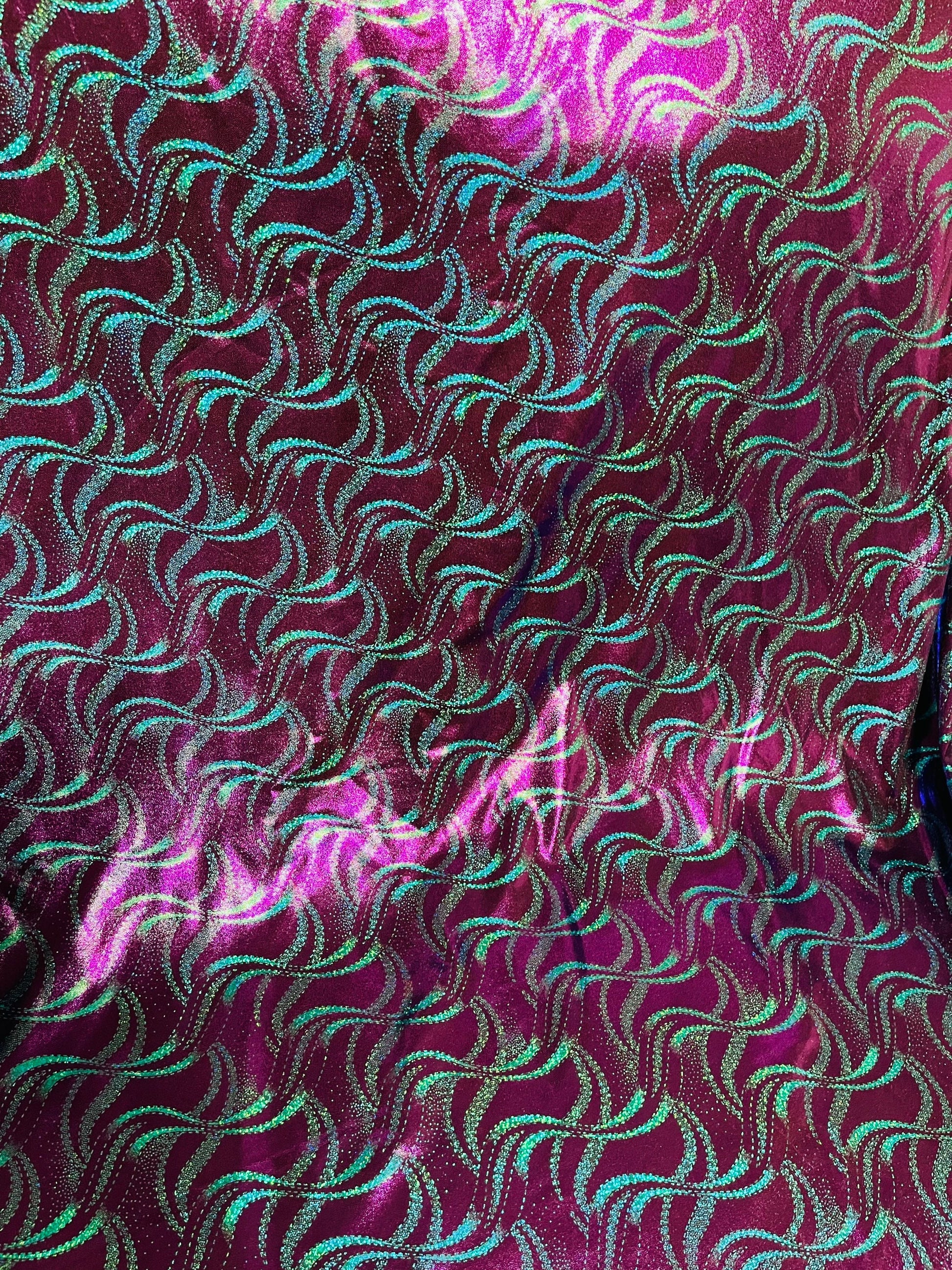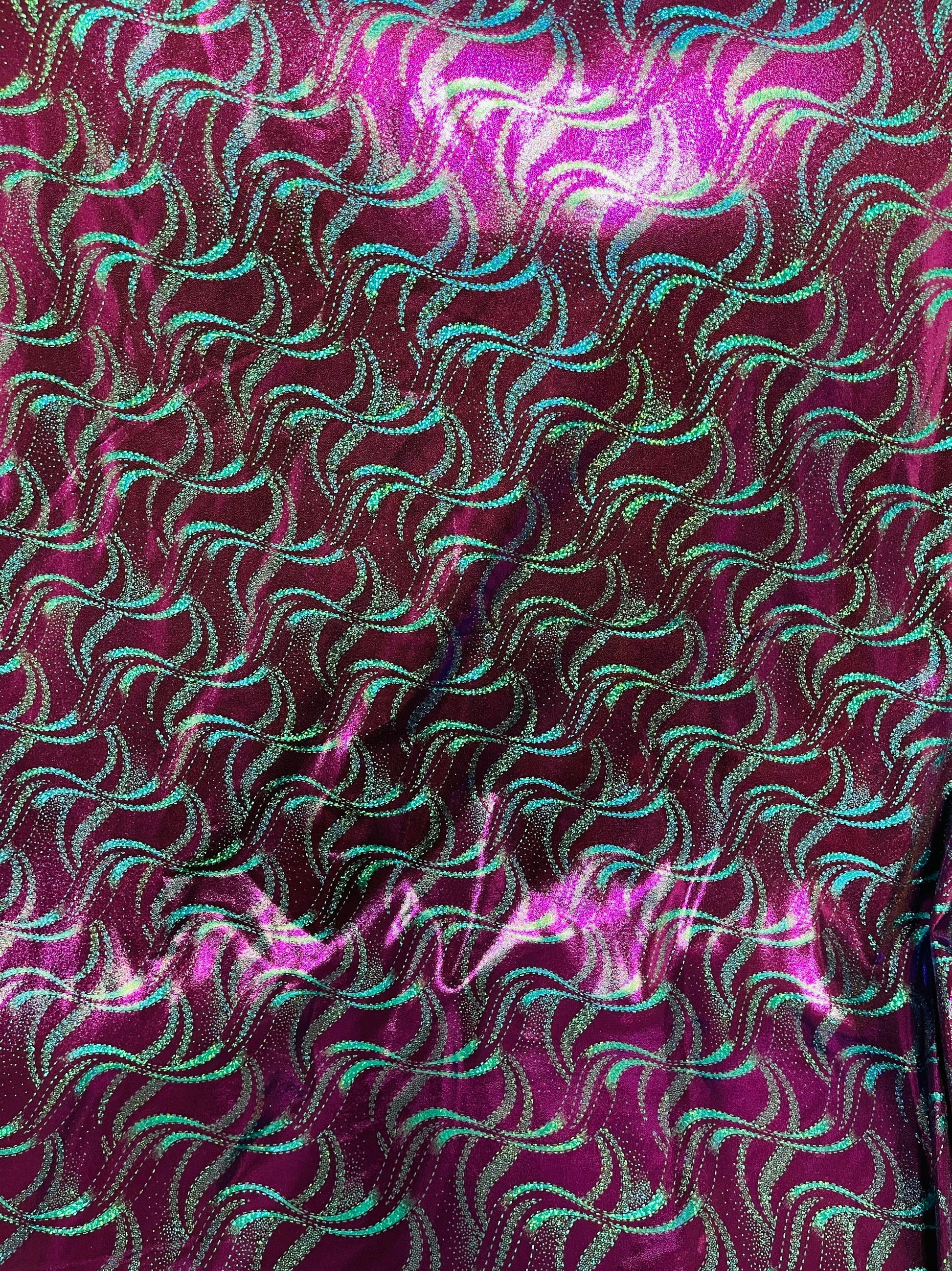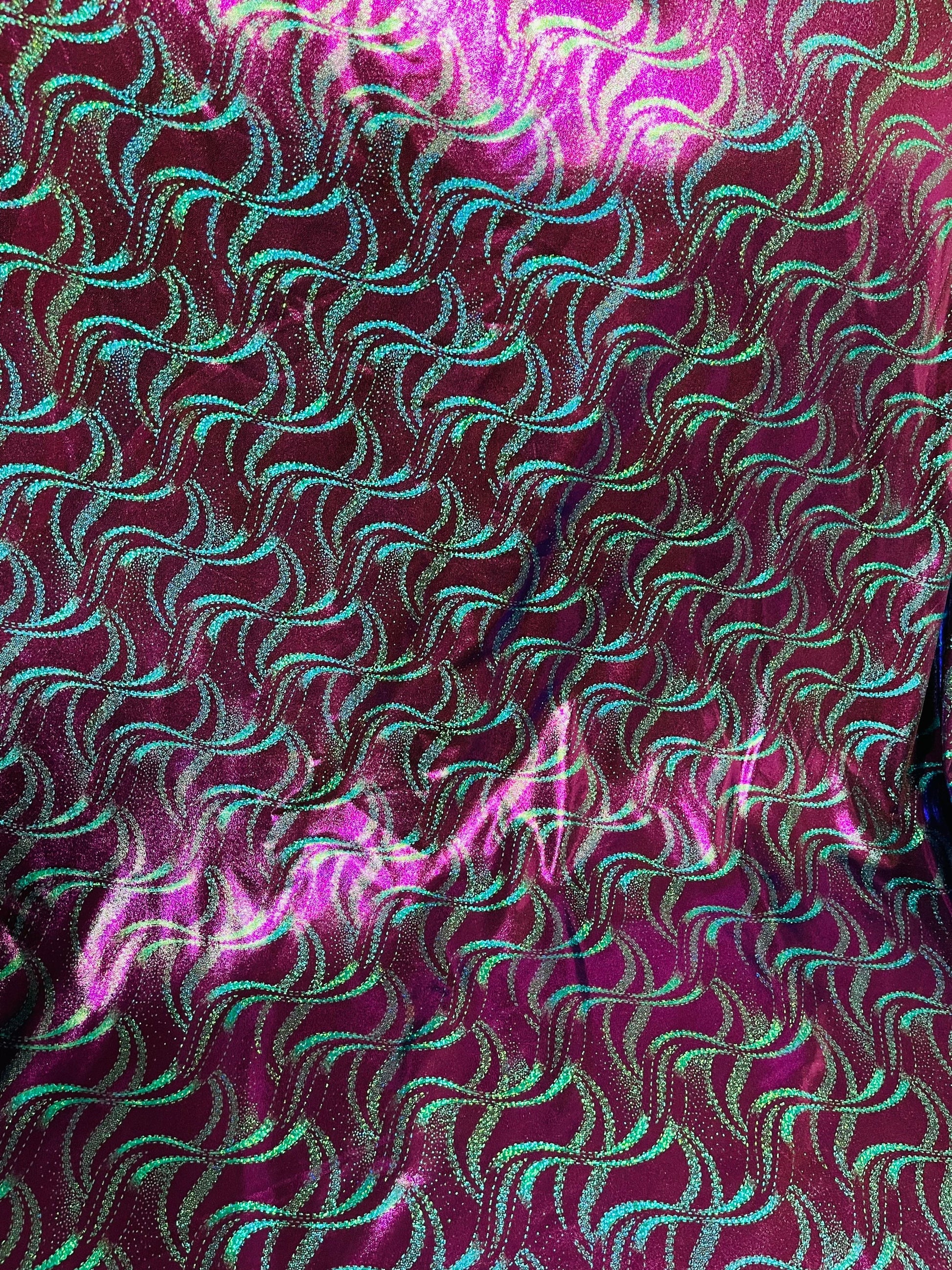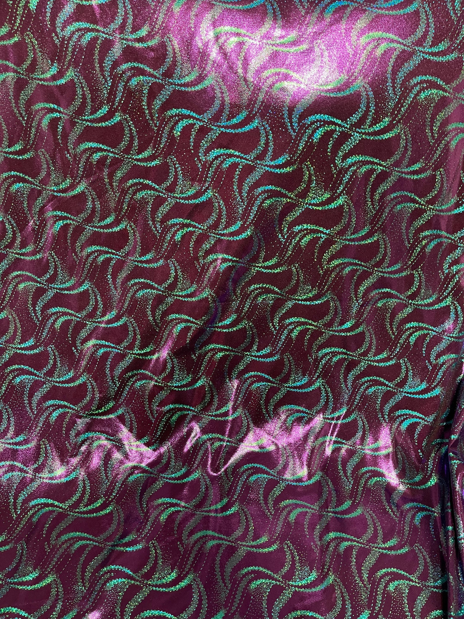 New abstract design Eggplant/green hologram nylon spandex 4-way stretch 58/60” Sold by the YD. Ships Worldwide from Los Angeles California USA.
