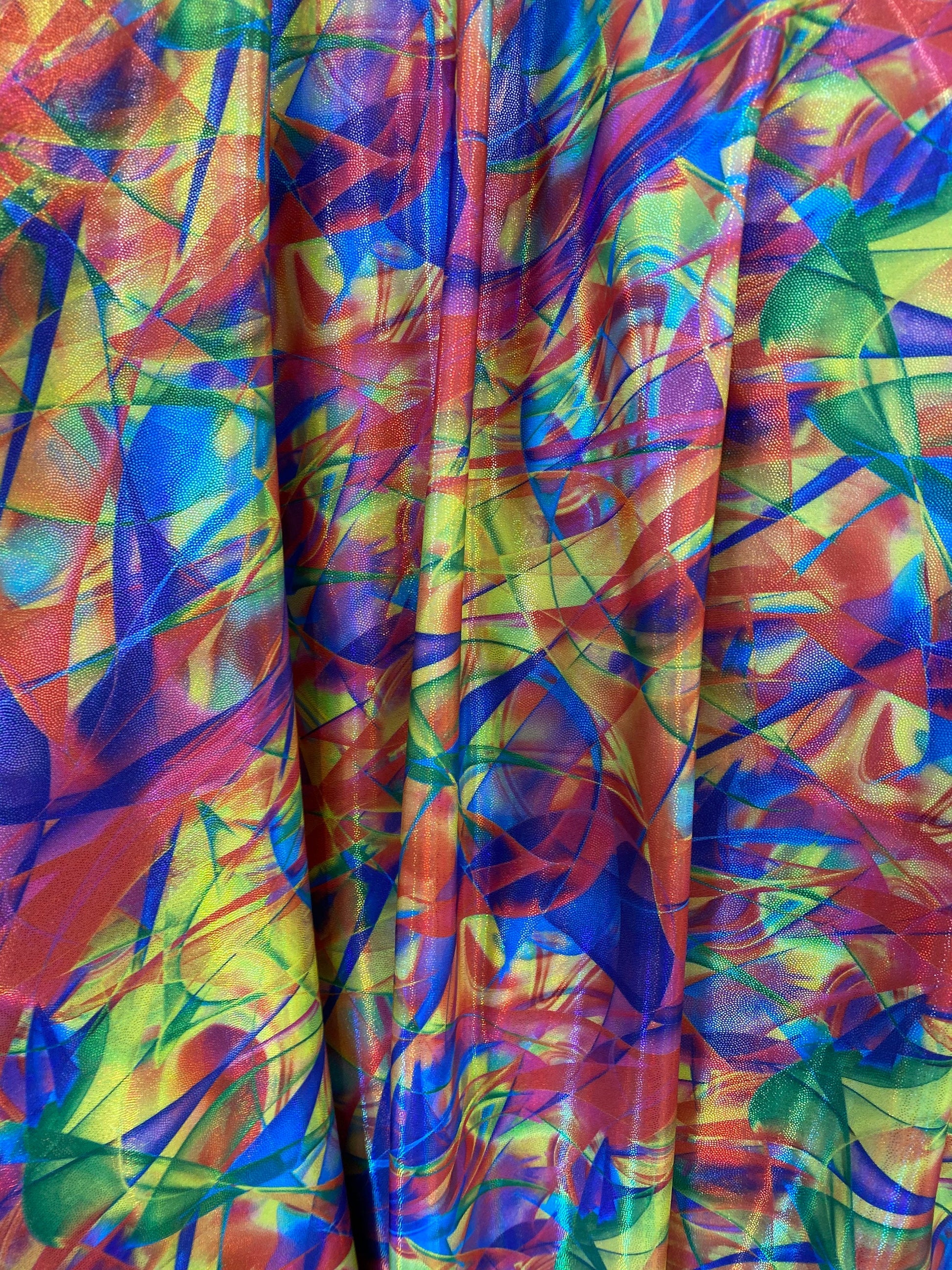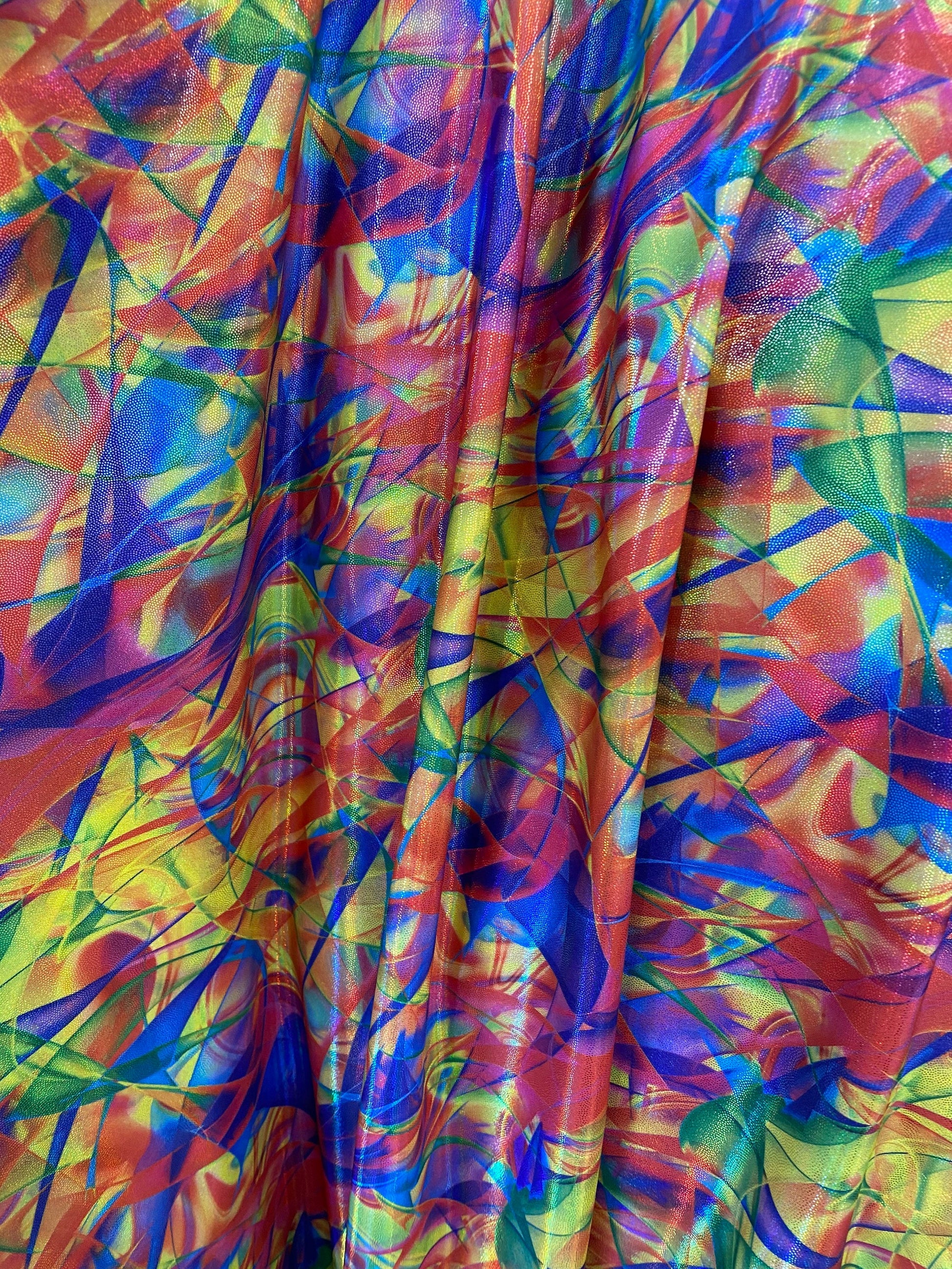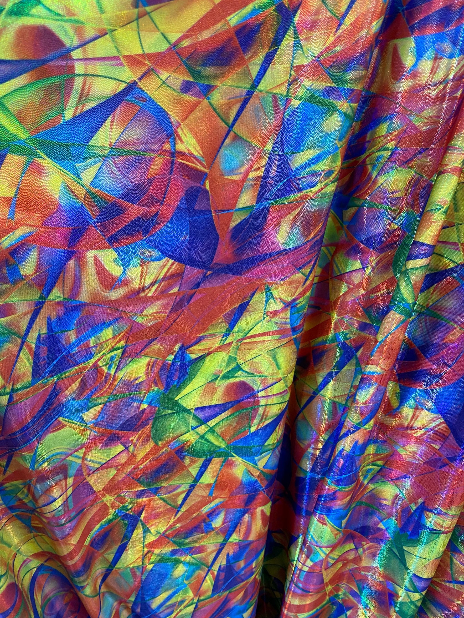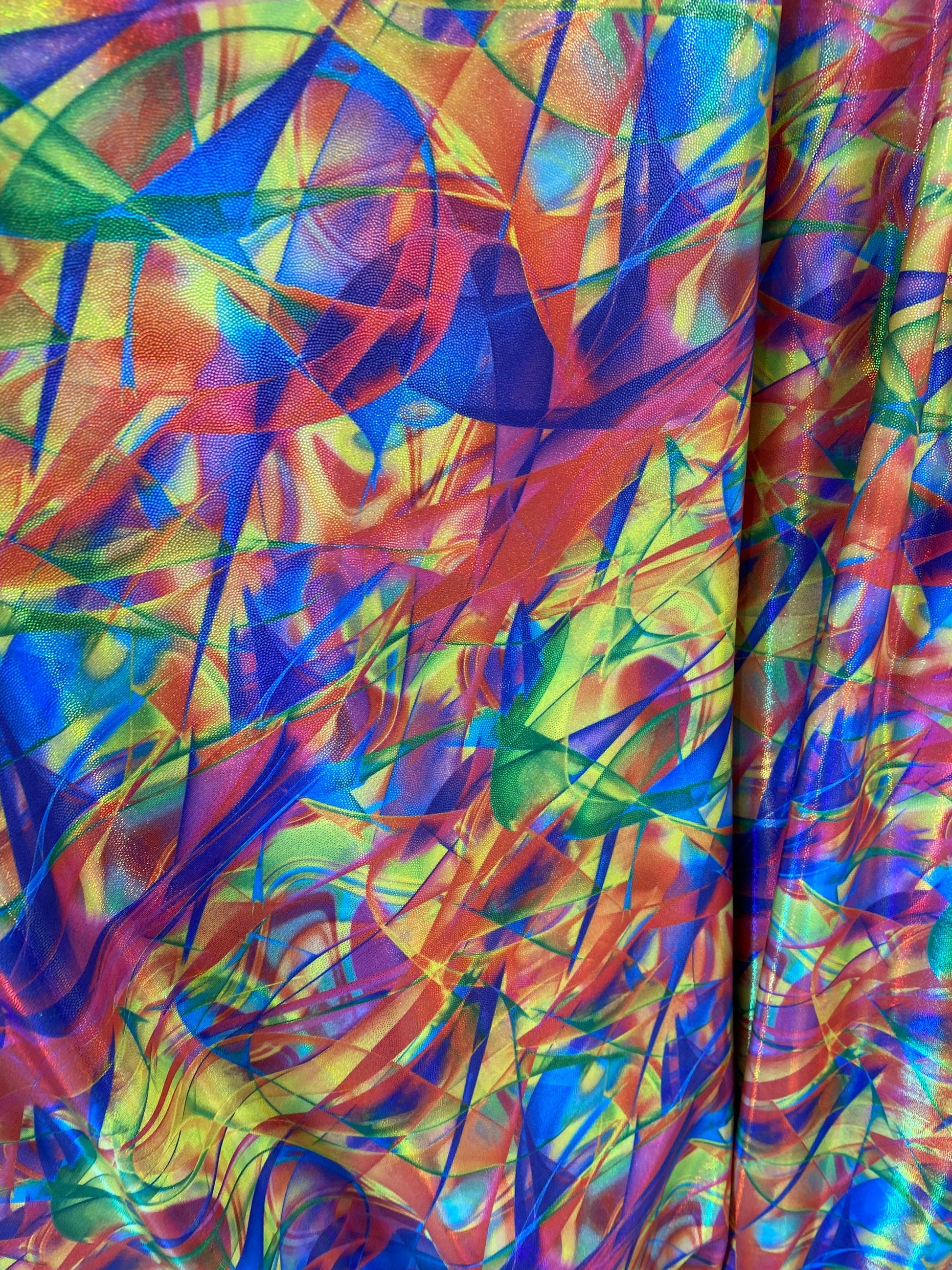 New abstract pollock painting inspired design digital foil print lacer hologram metallic nylon spandex 4-way stretch 58/60” Sold by the YD.