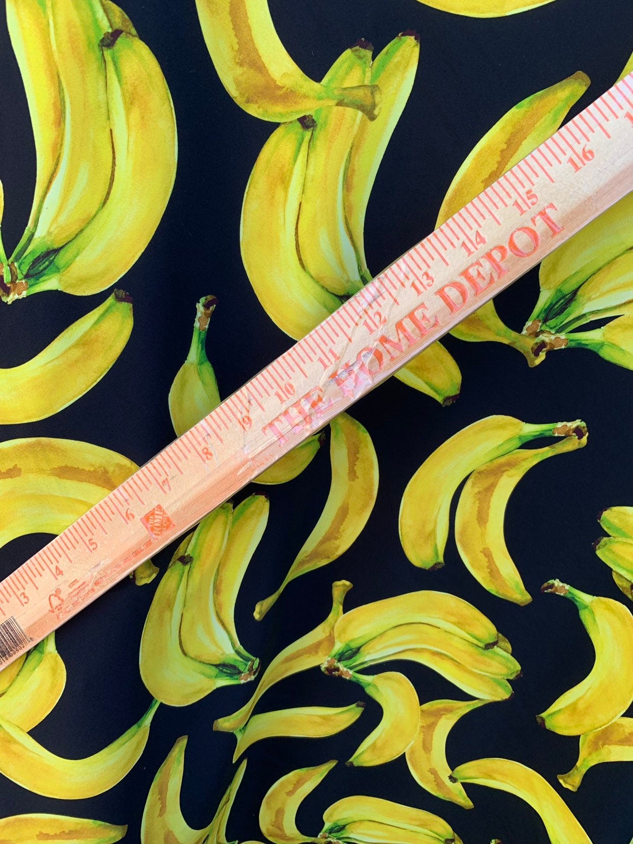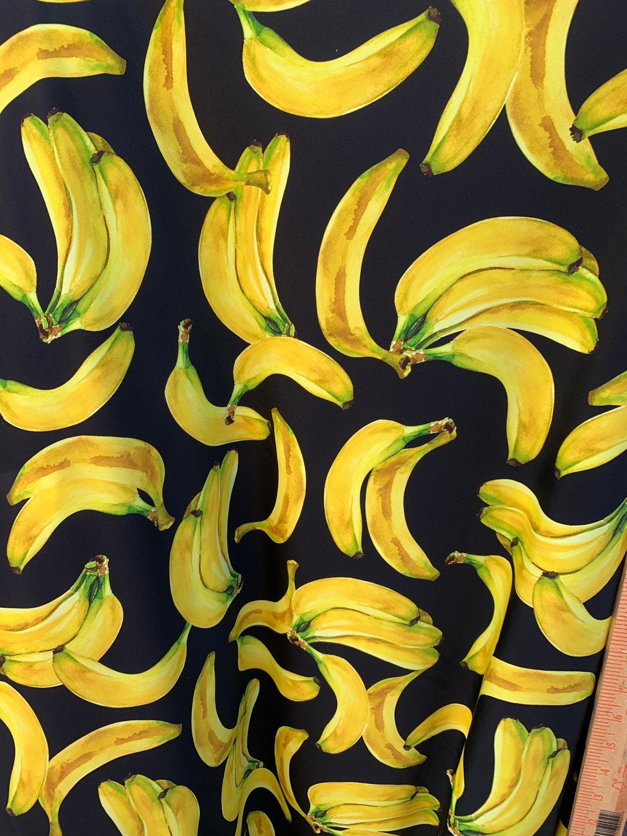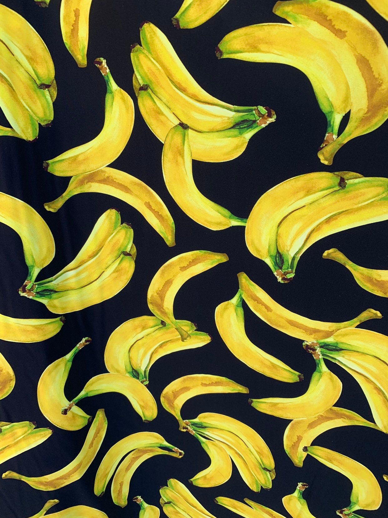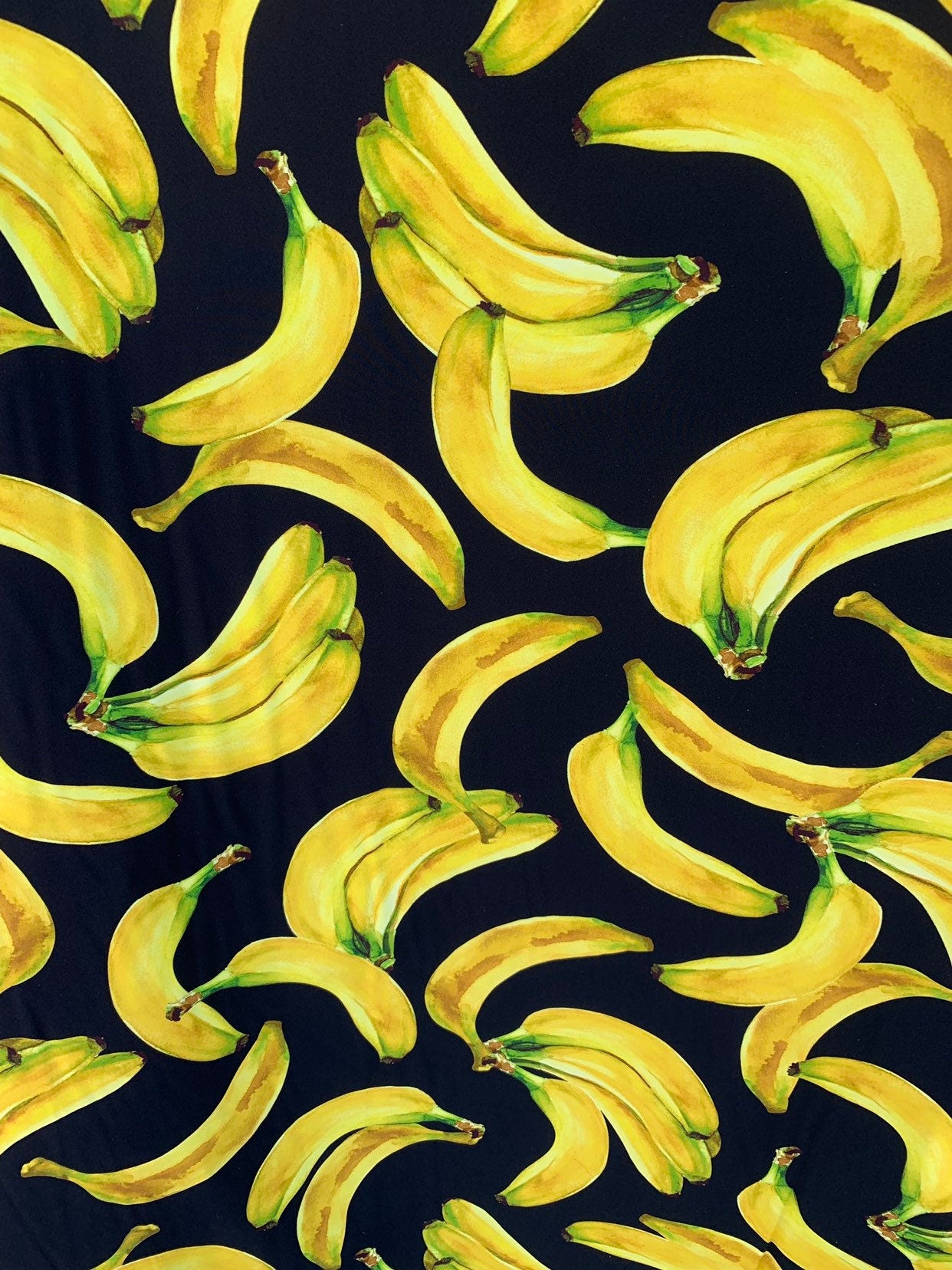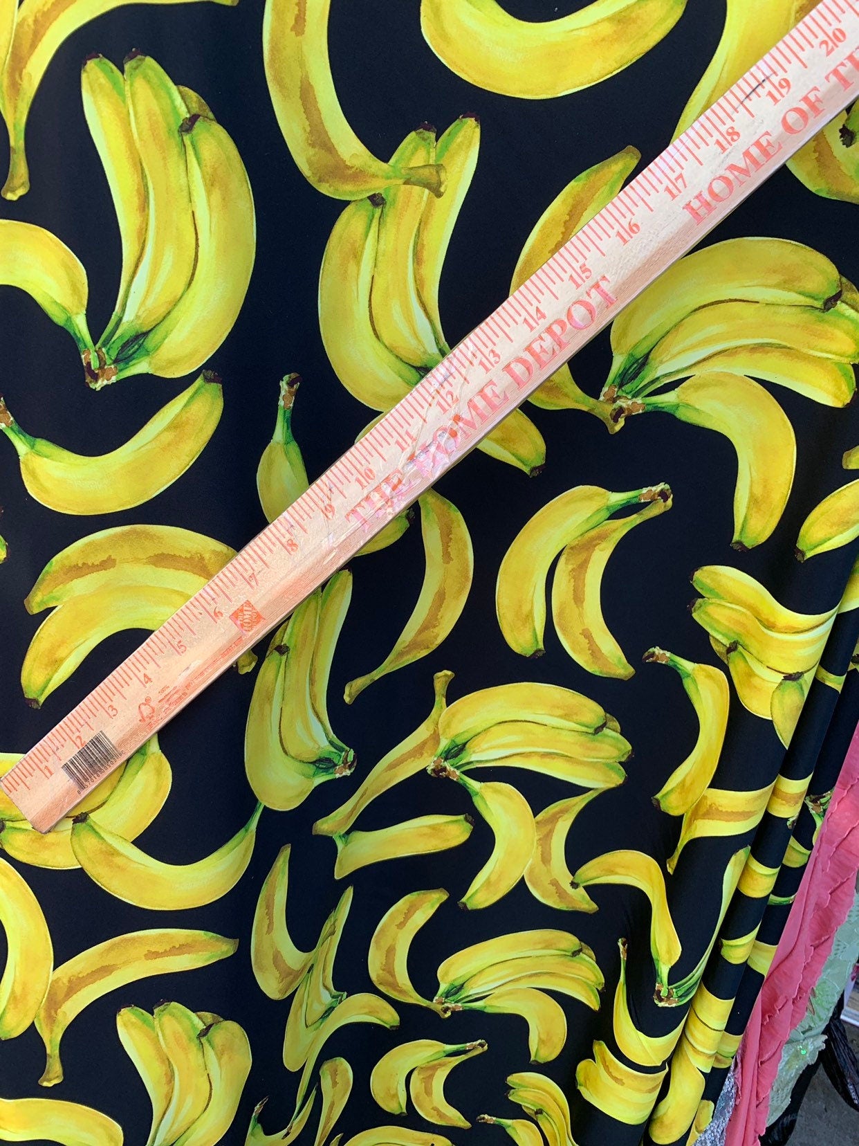 New bananas design black/yellow print on nylon spandex 4way stretch 58/60" Sold by the YD. Ships worldwide from Los Angeles California USA.