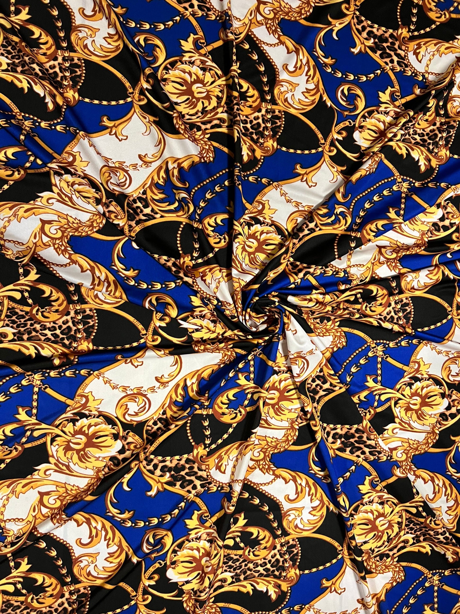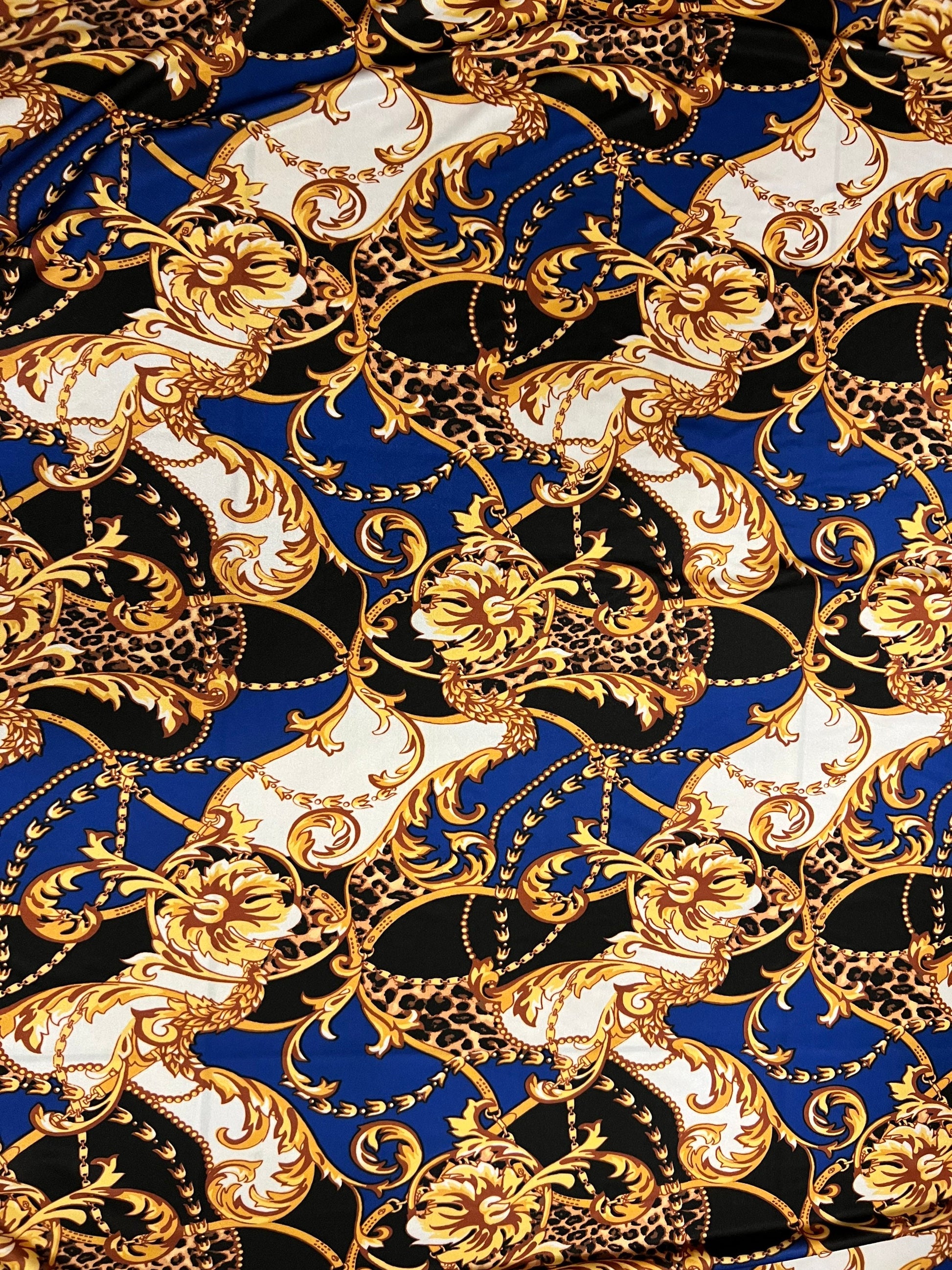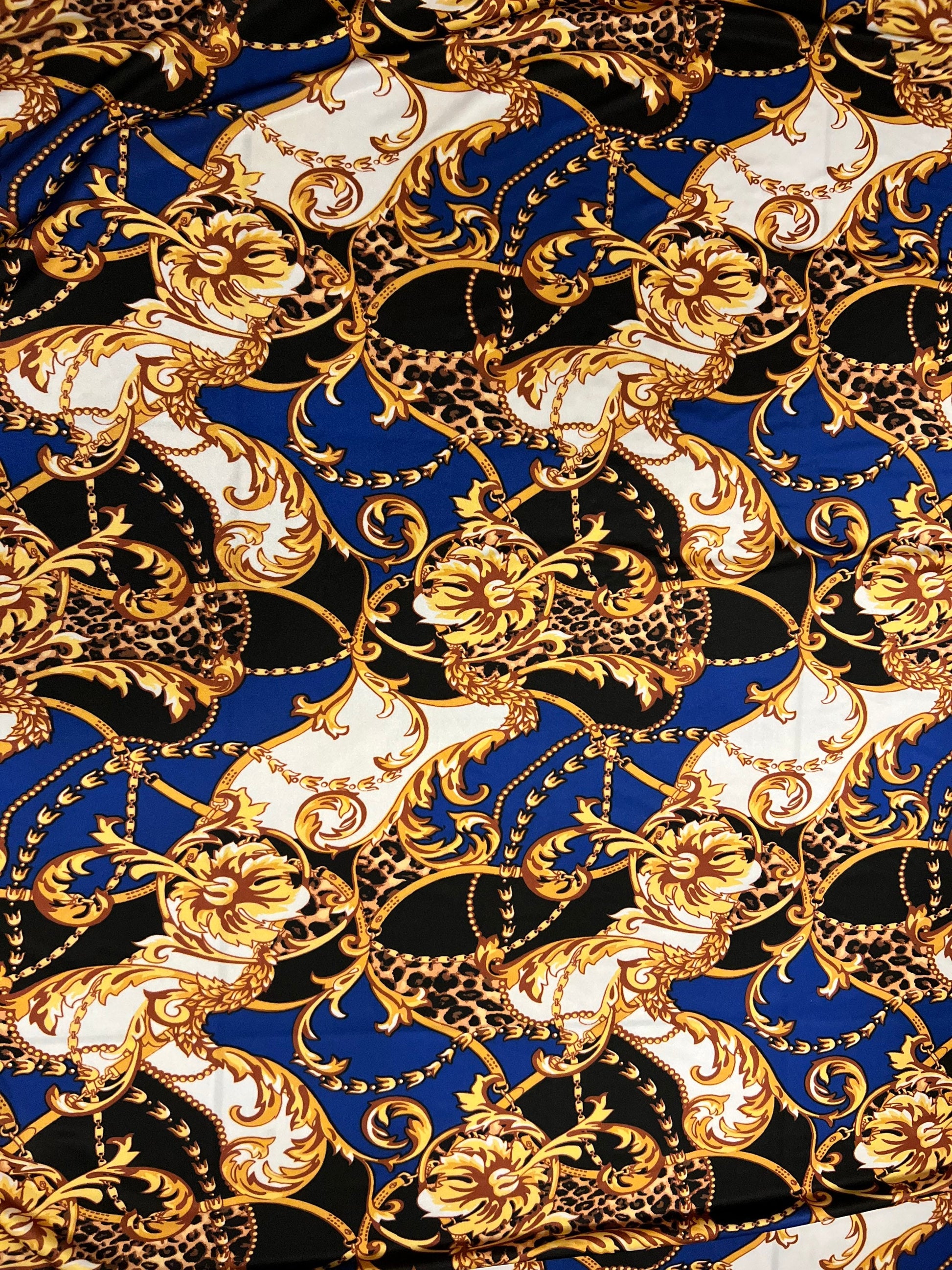 New Brand fashion design sapphire/gold print on great quality of nylon spandex 4-way stretch 58/60” Sold by the YD. Ships Worldwide From Los Angeles California USA.