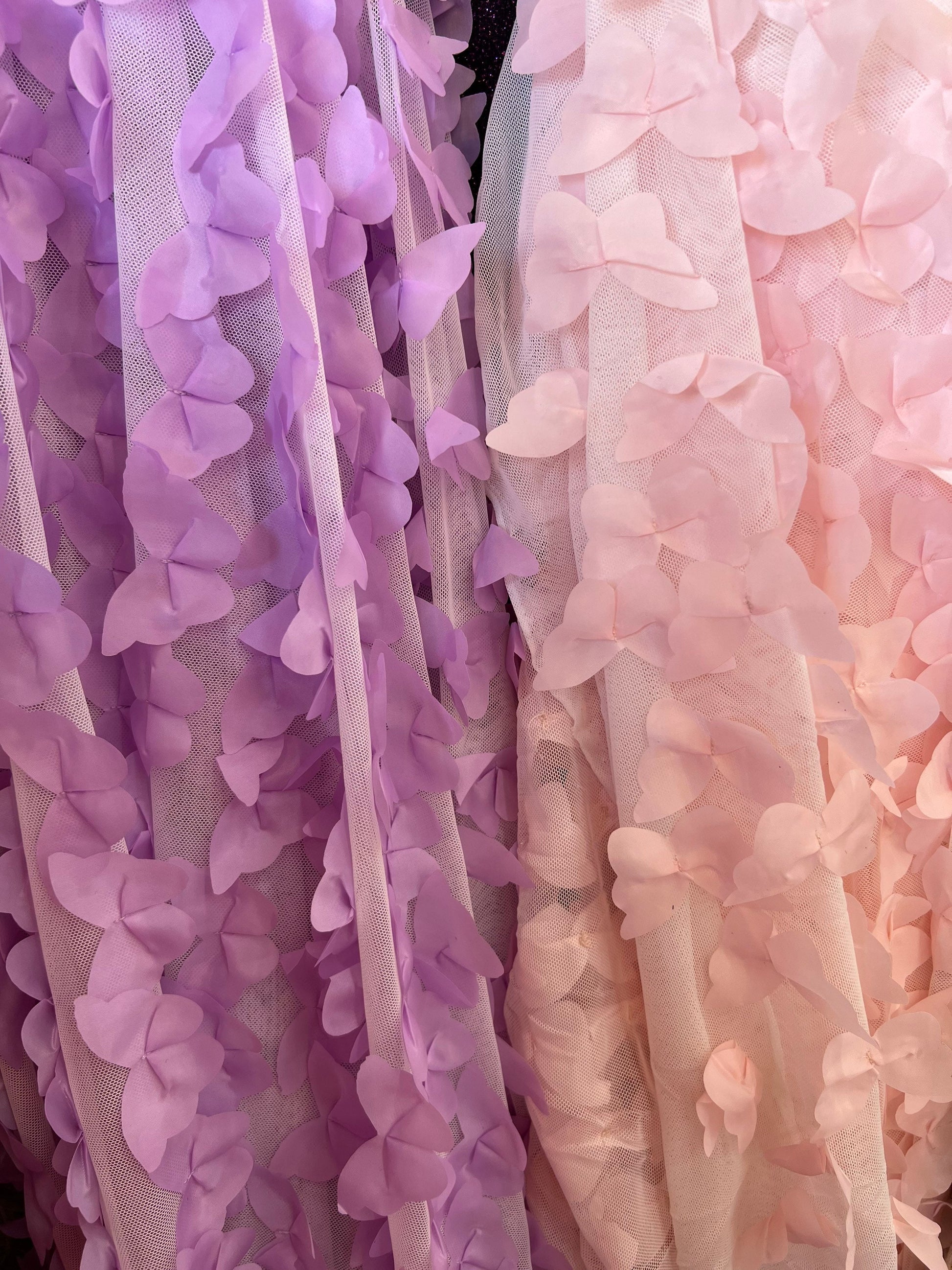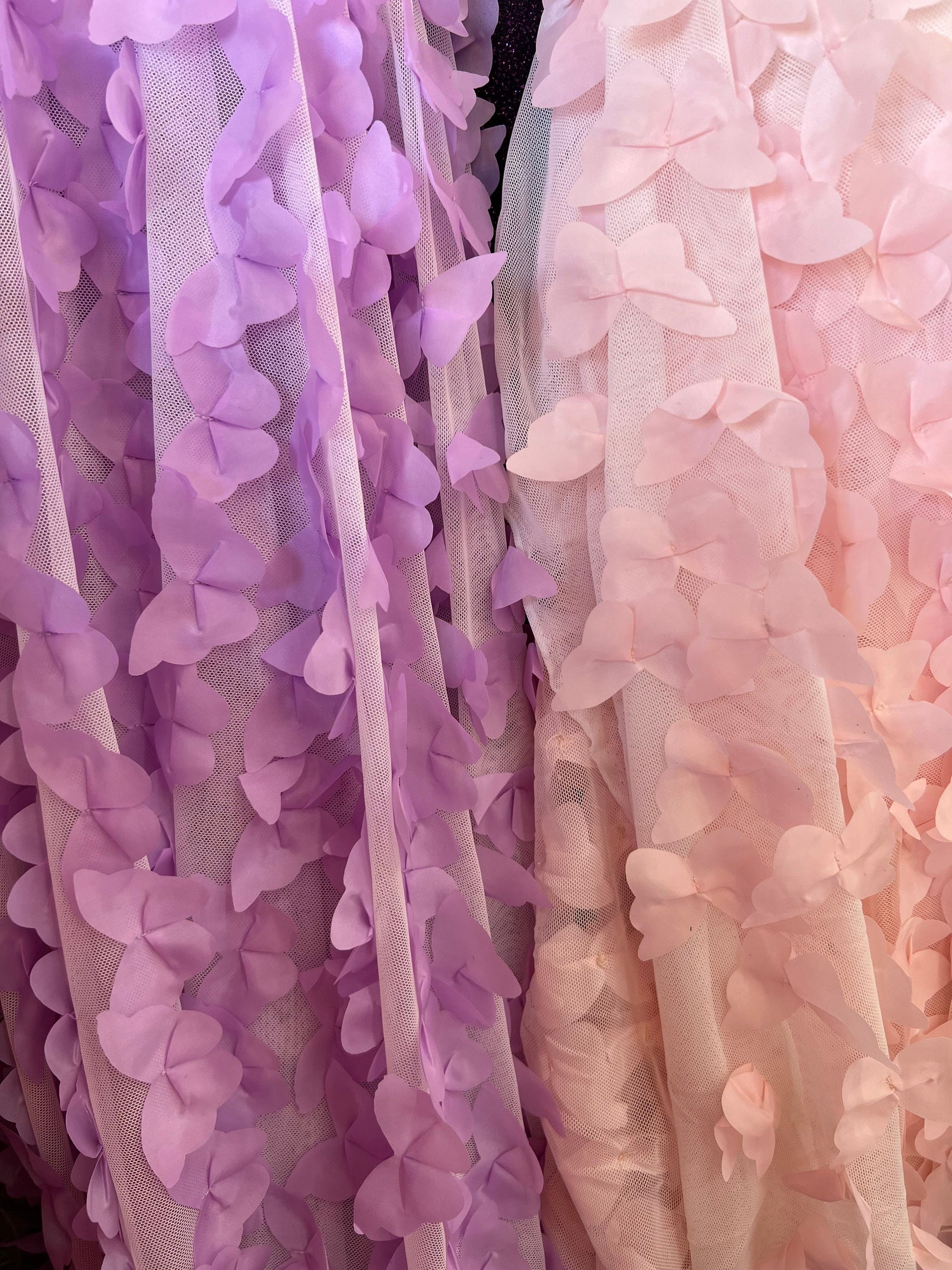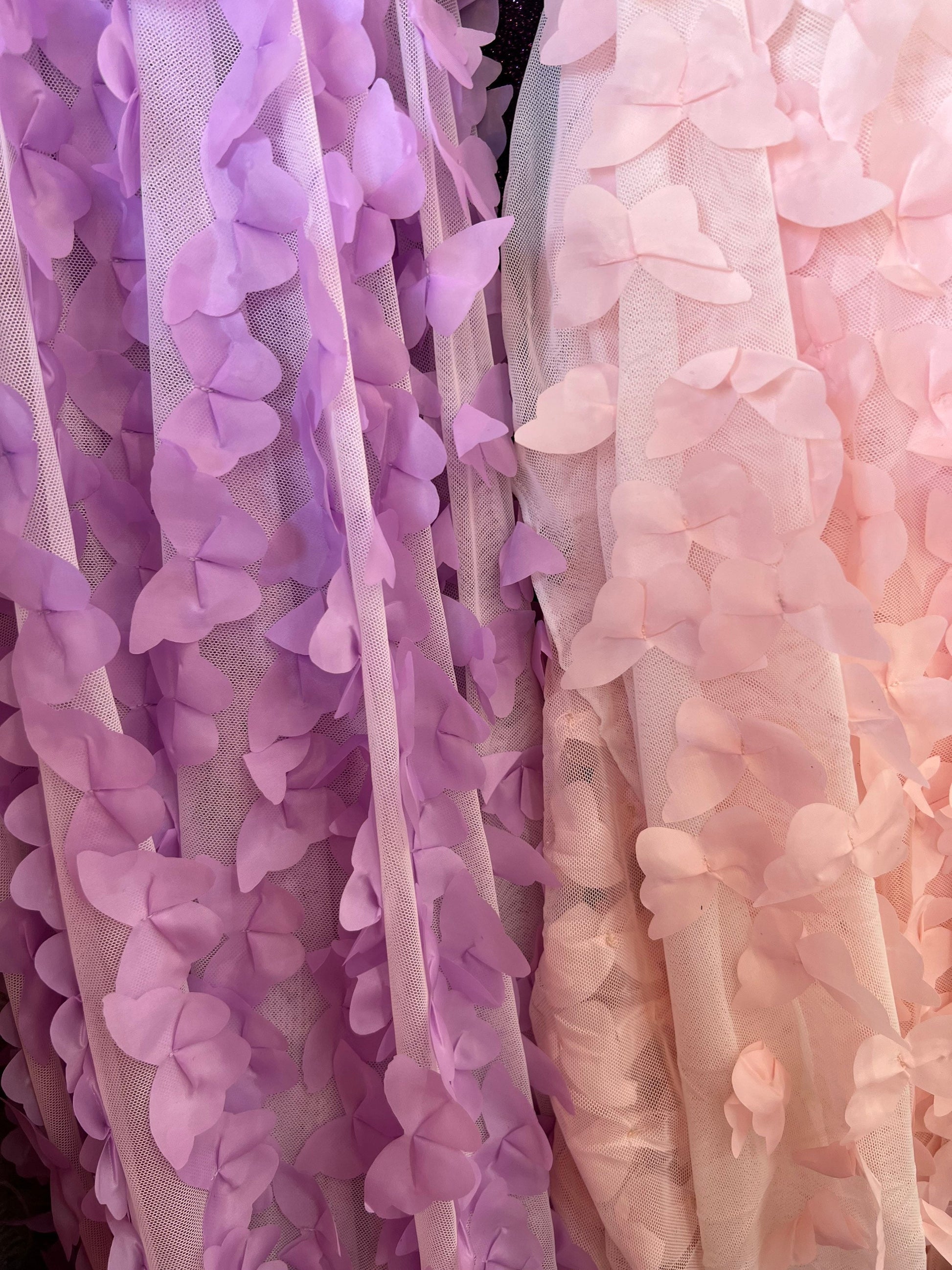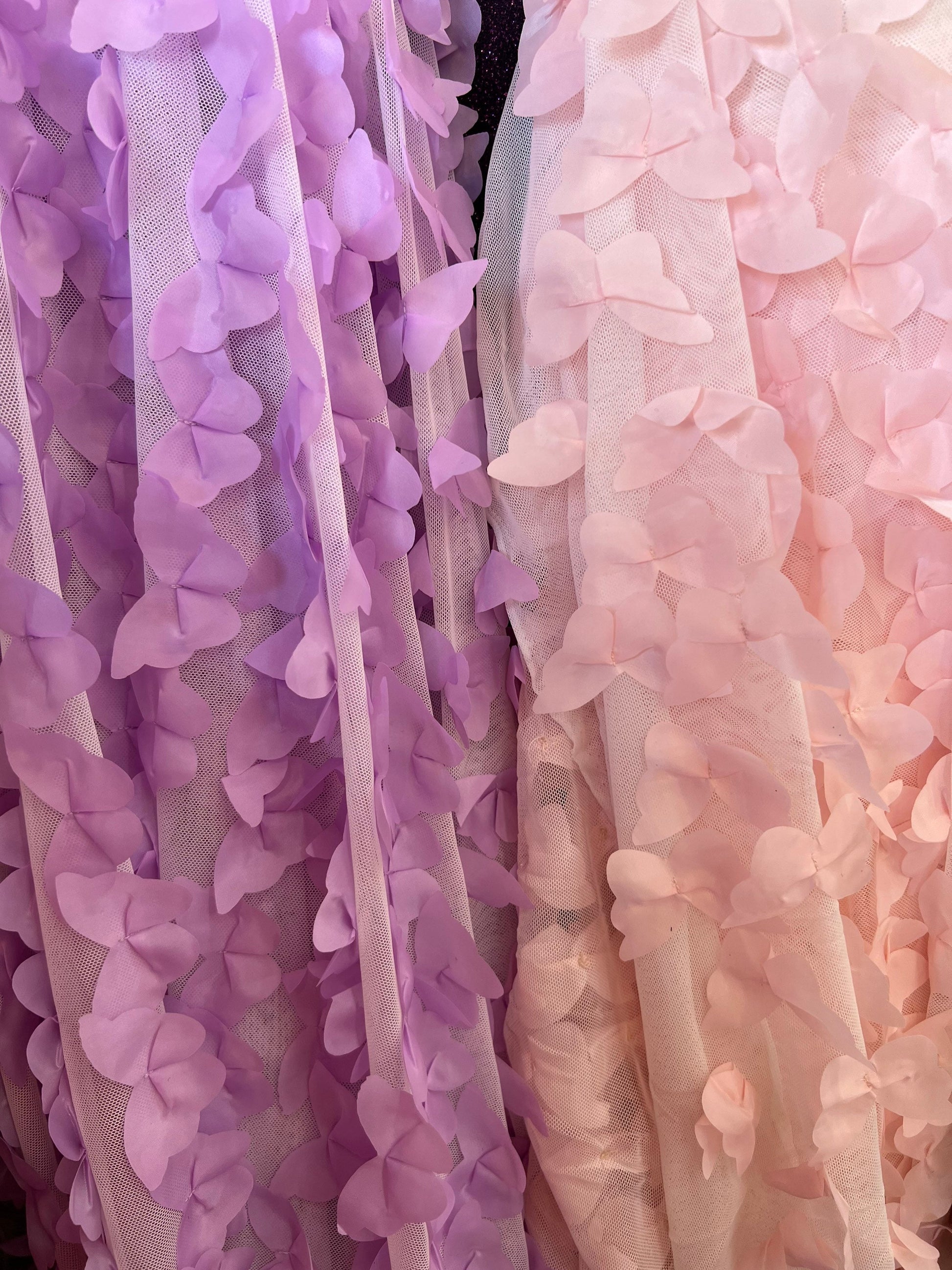 New Butterfly design embroidered on stretch mesh 4-way stretch 58/60” Lavender & Pink pastel colors.