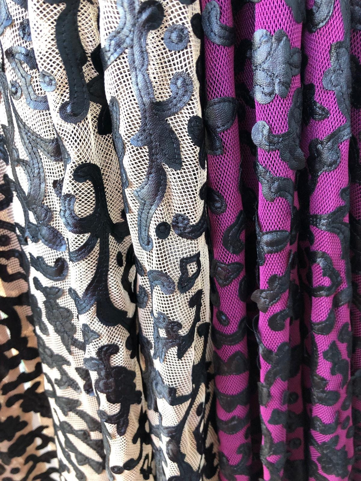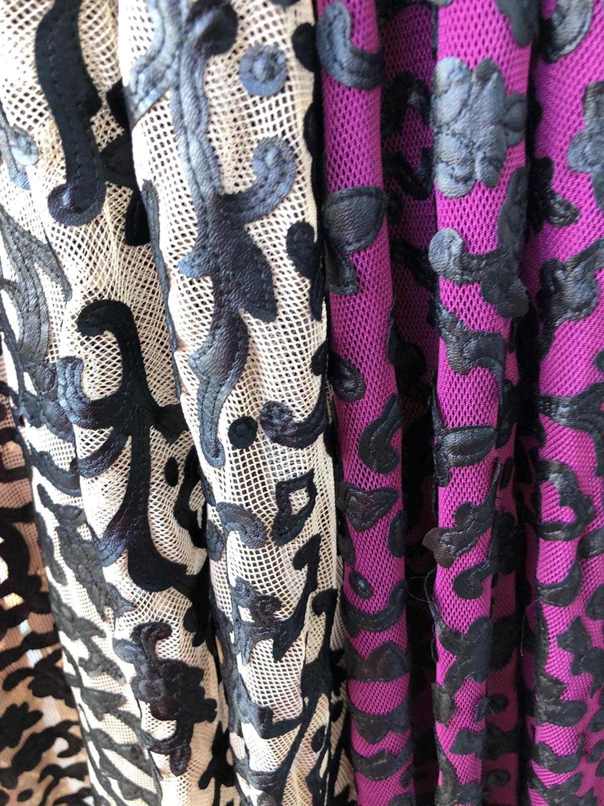 New diamond mesh with black leather vinyl Victoria design 4way stretch 58/60" Sold by the YD. Ships worldwide from Los Angeles California USA.
