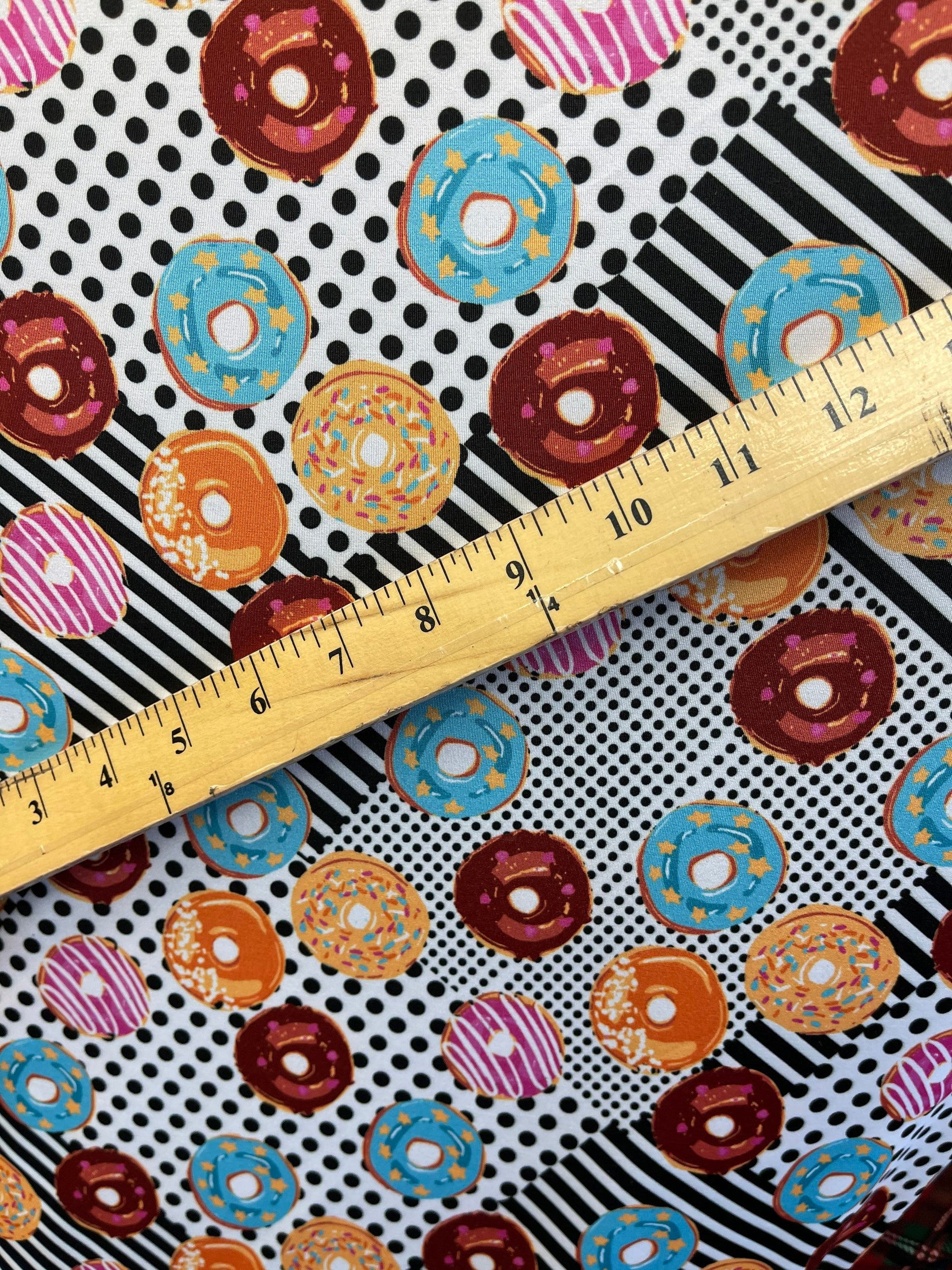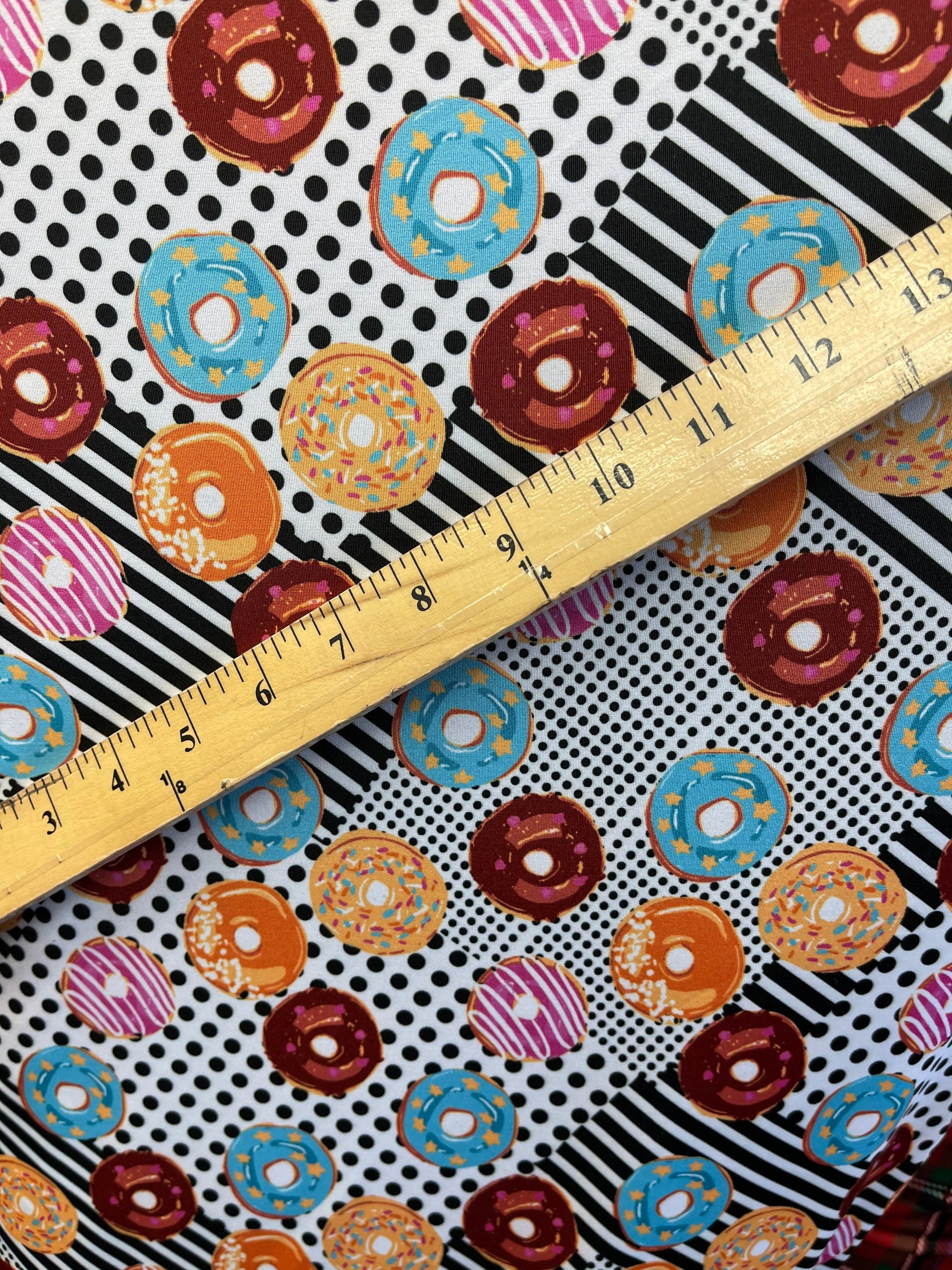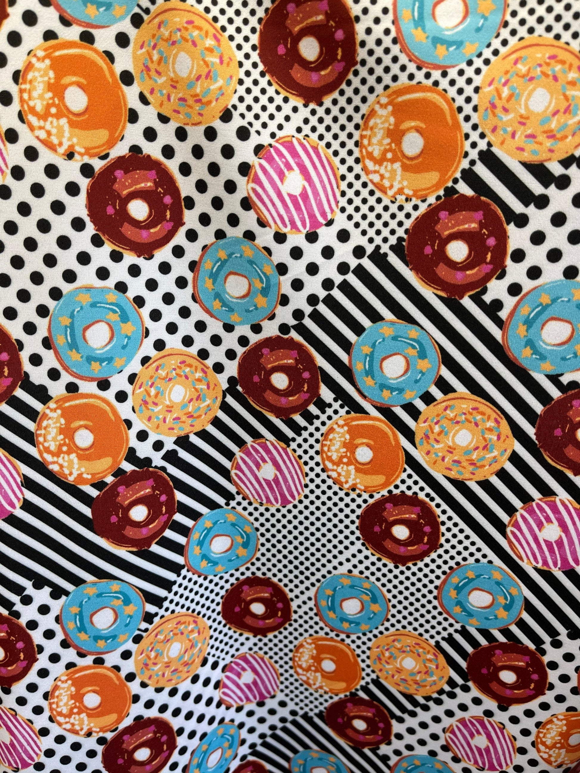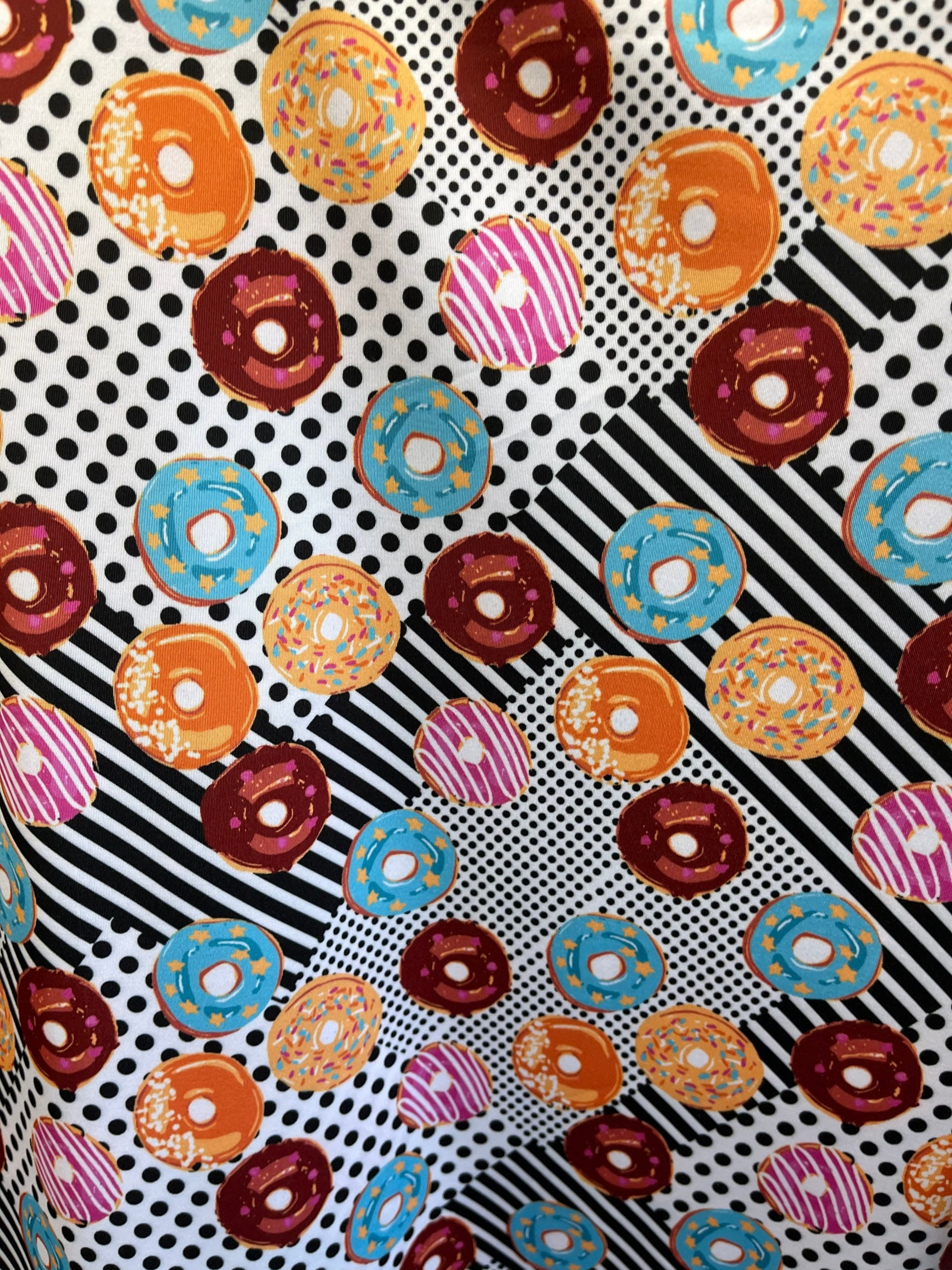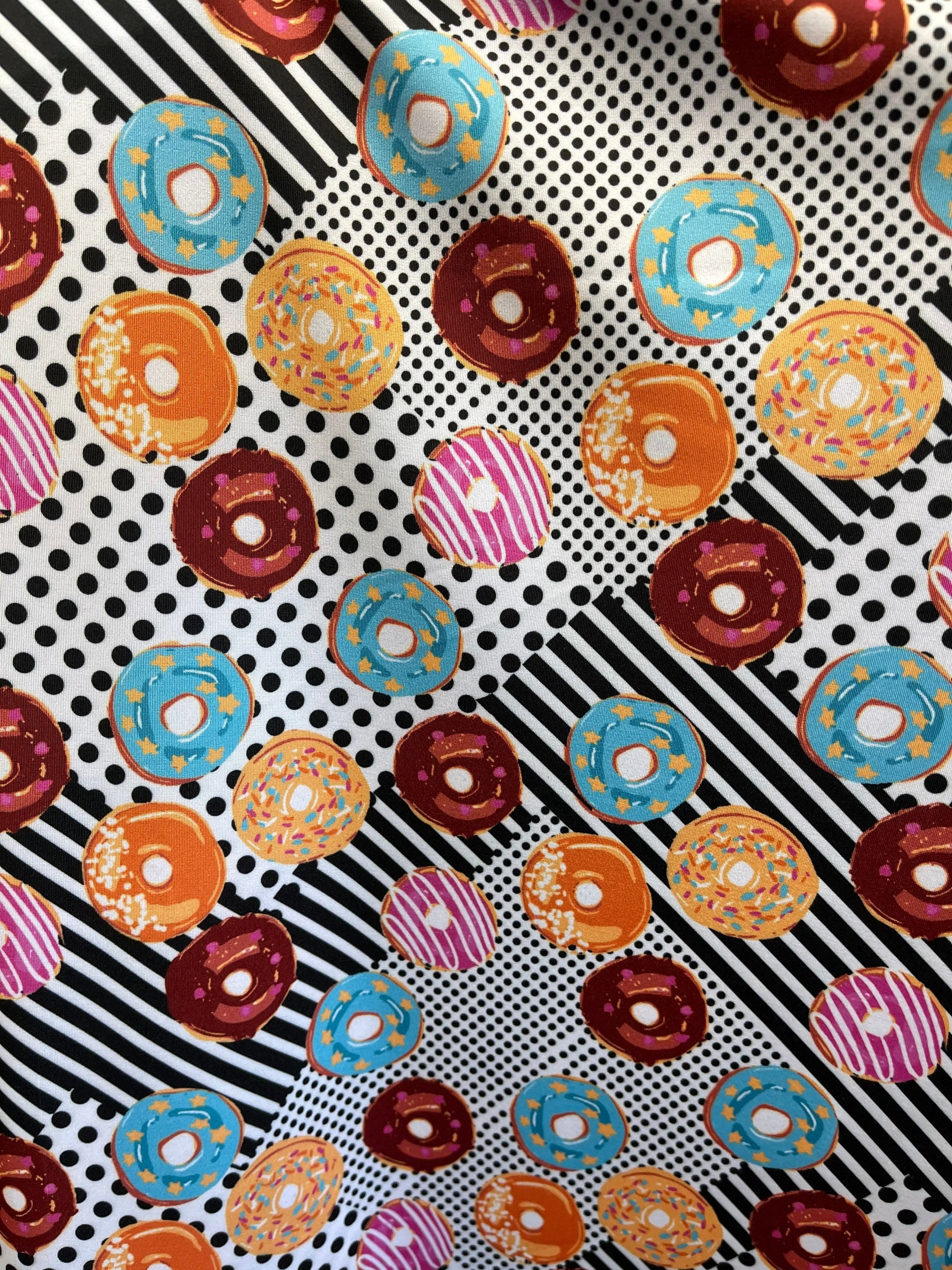 New donuts designMulticolor print on great quality of nylon spandex 4way Stretch 58/60” Sold by the yd. Ships worldwide from Los Angeles California USA.