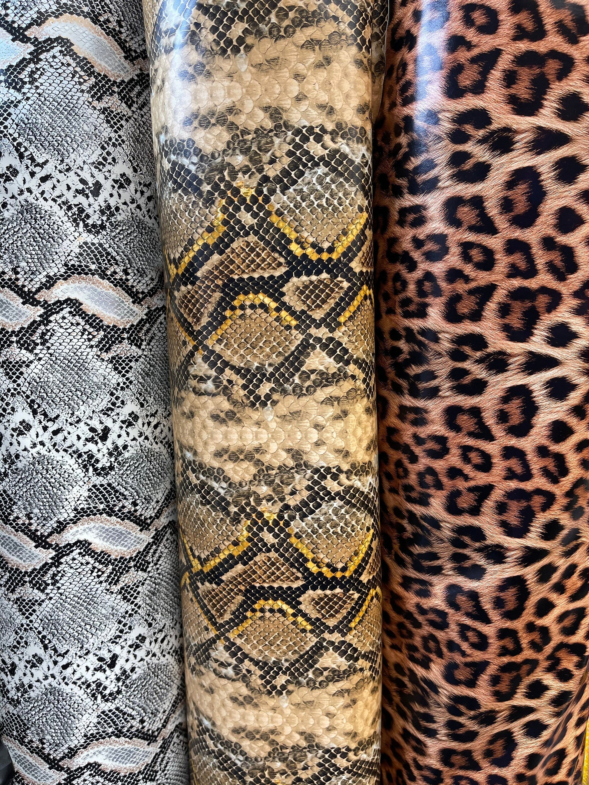 New Exotic animal print leopard and snake design stretch shiny vinyl 2-way 58/60” Sold by the YD. Ships Worldwide from Los Angeles California USA.