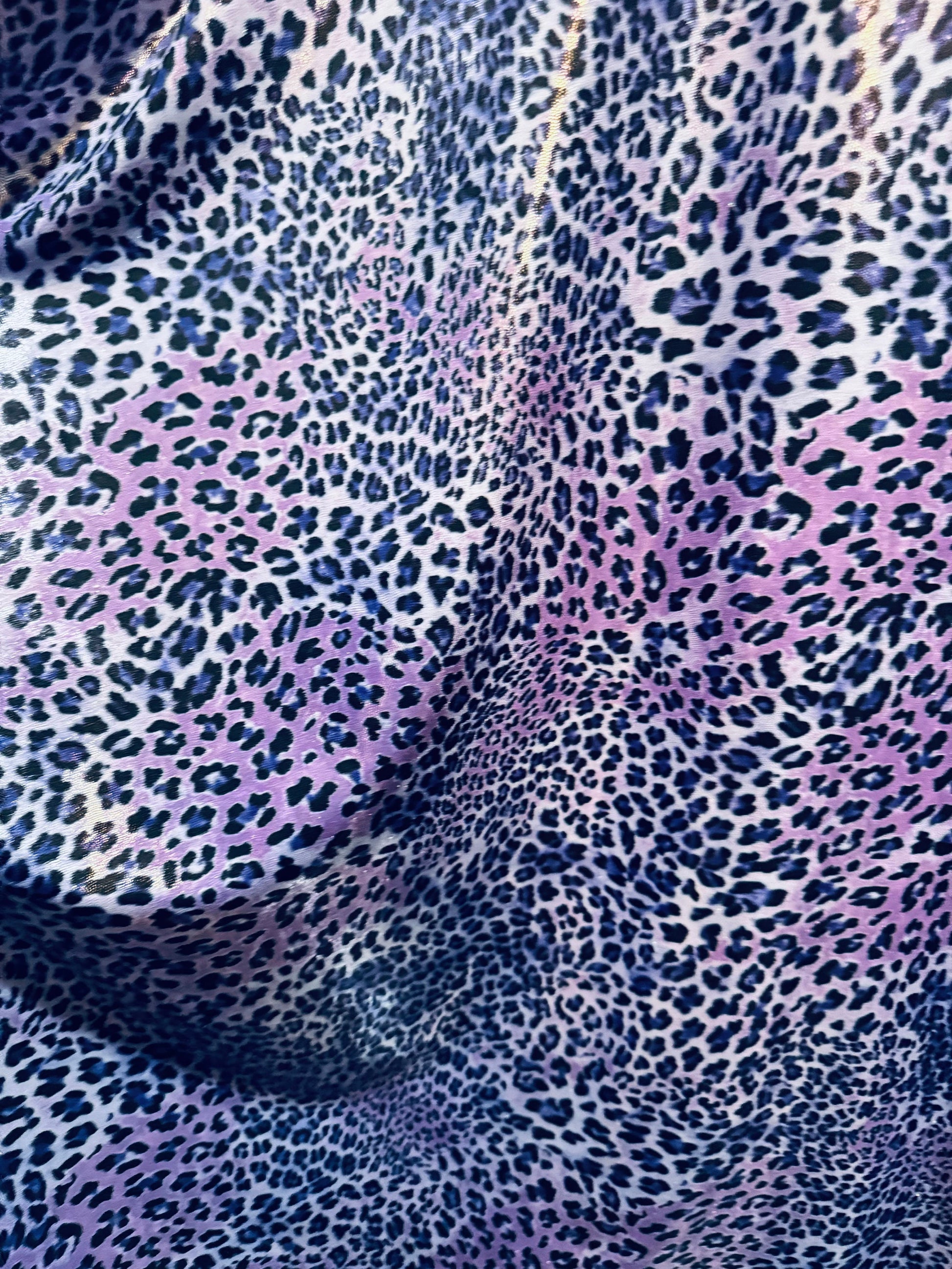 New Exotic cheetah design on metallic nylon spandex with foggy foil 4-way stretch 58/60” Sold by the YD. Ships worldwide from Los Angeles California USA.