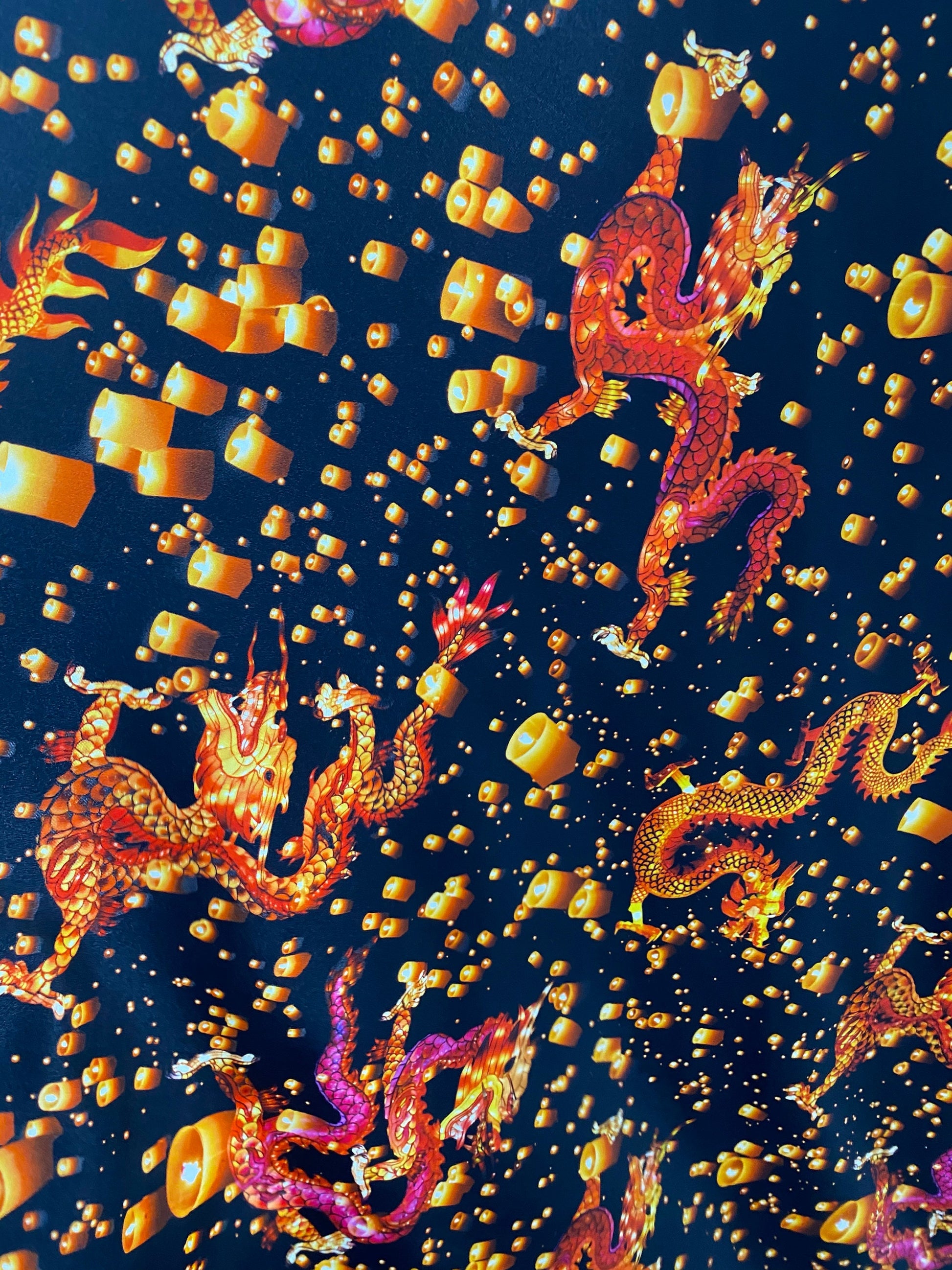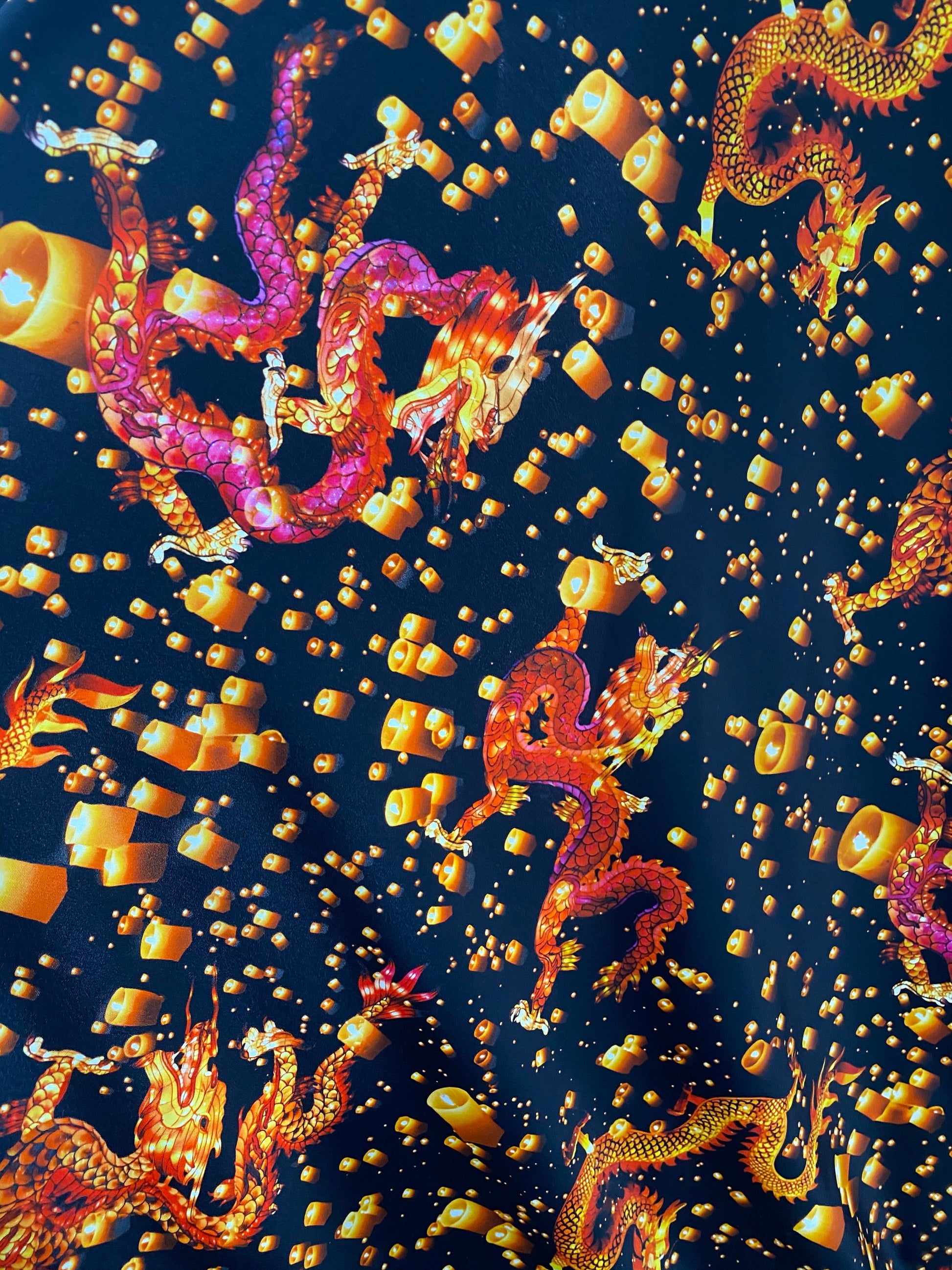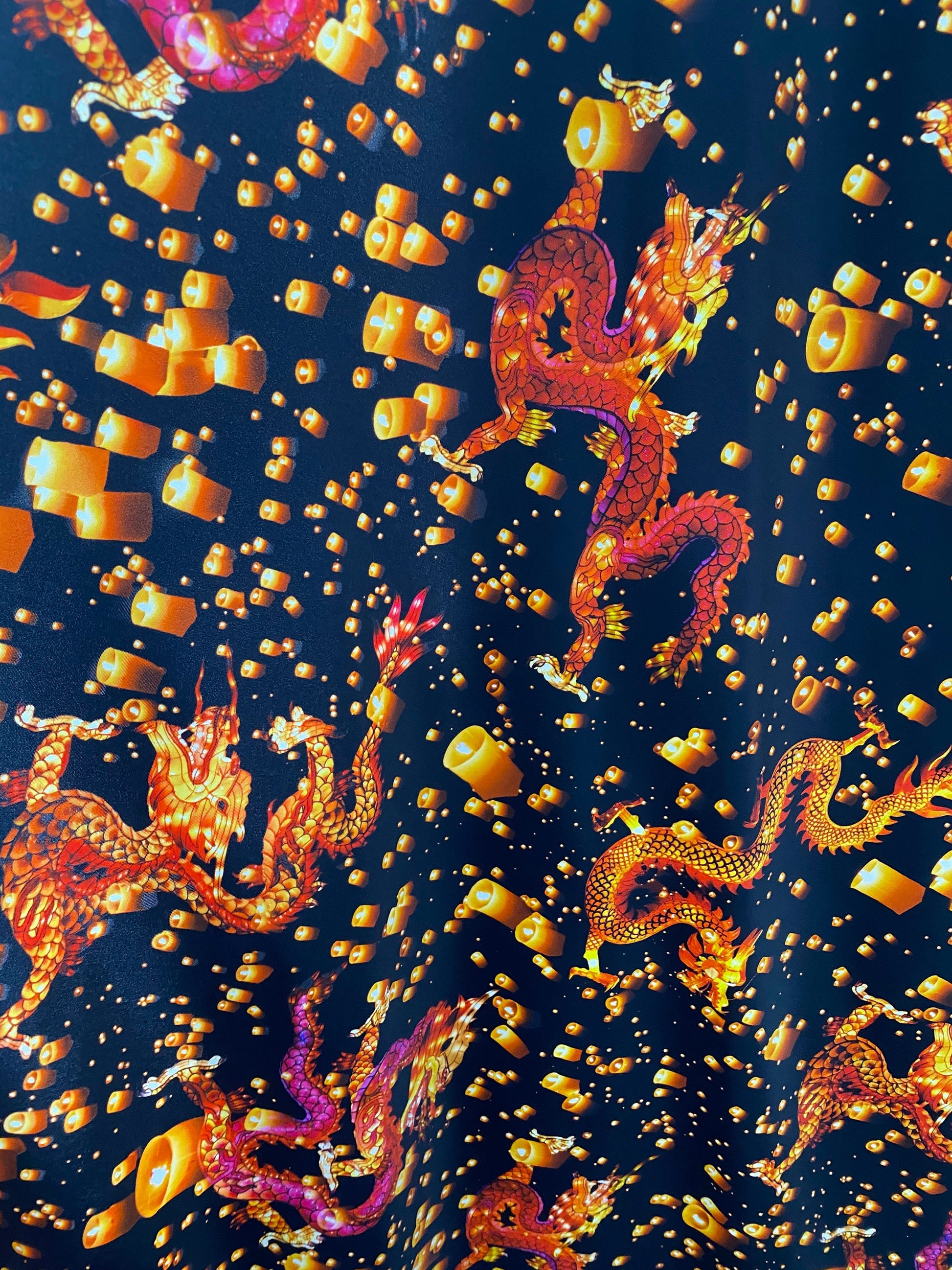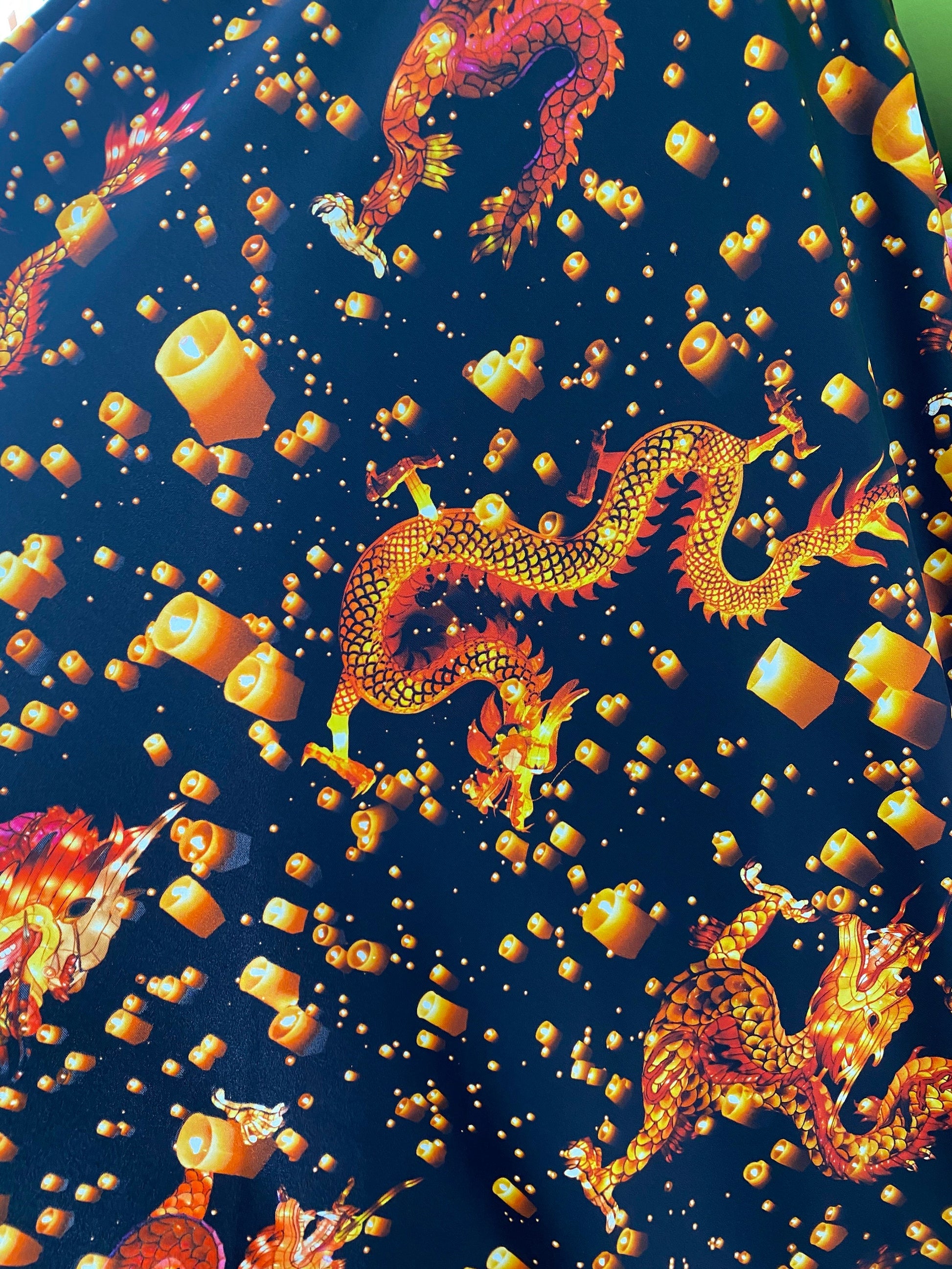New Exotic Dragon design print on nylon spandex 4-way 58/60” Sold by the YD. Ships worldwide from Los Ángeles California USA.