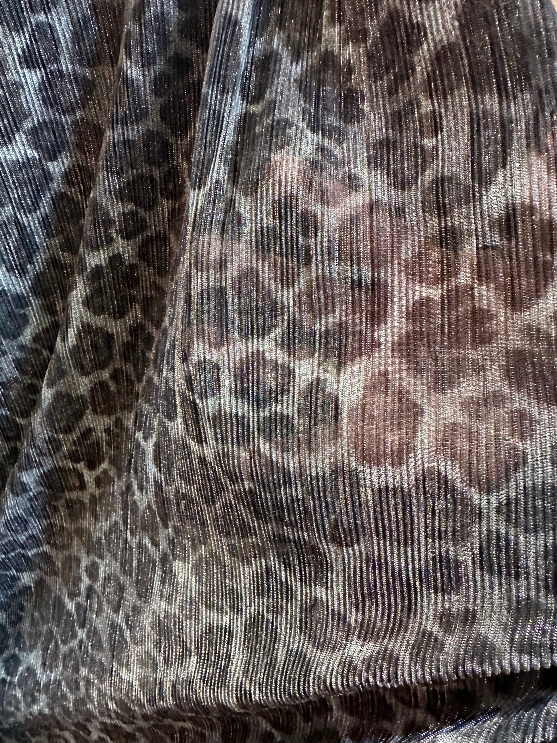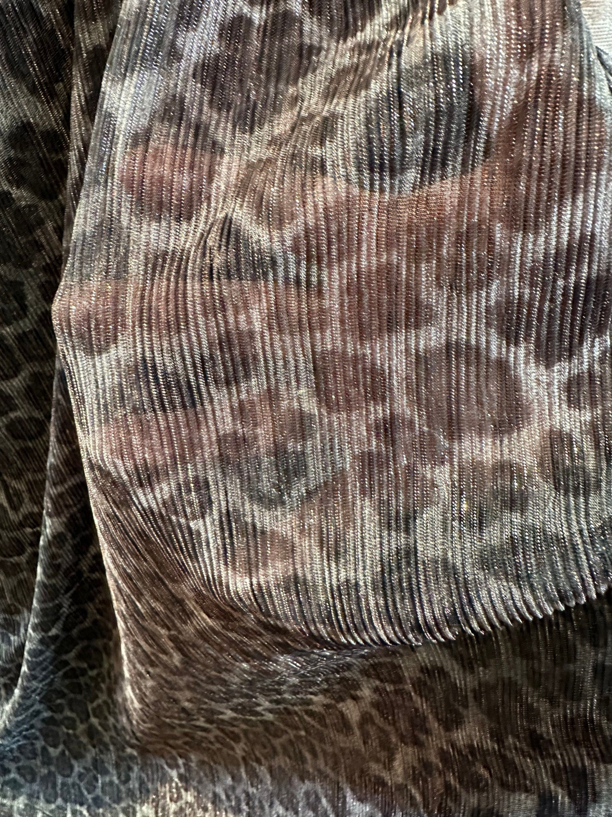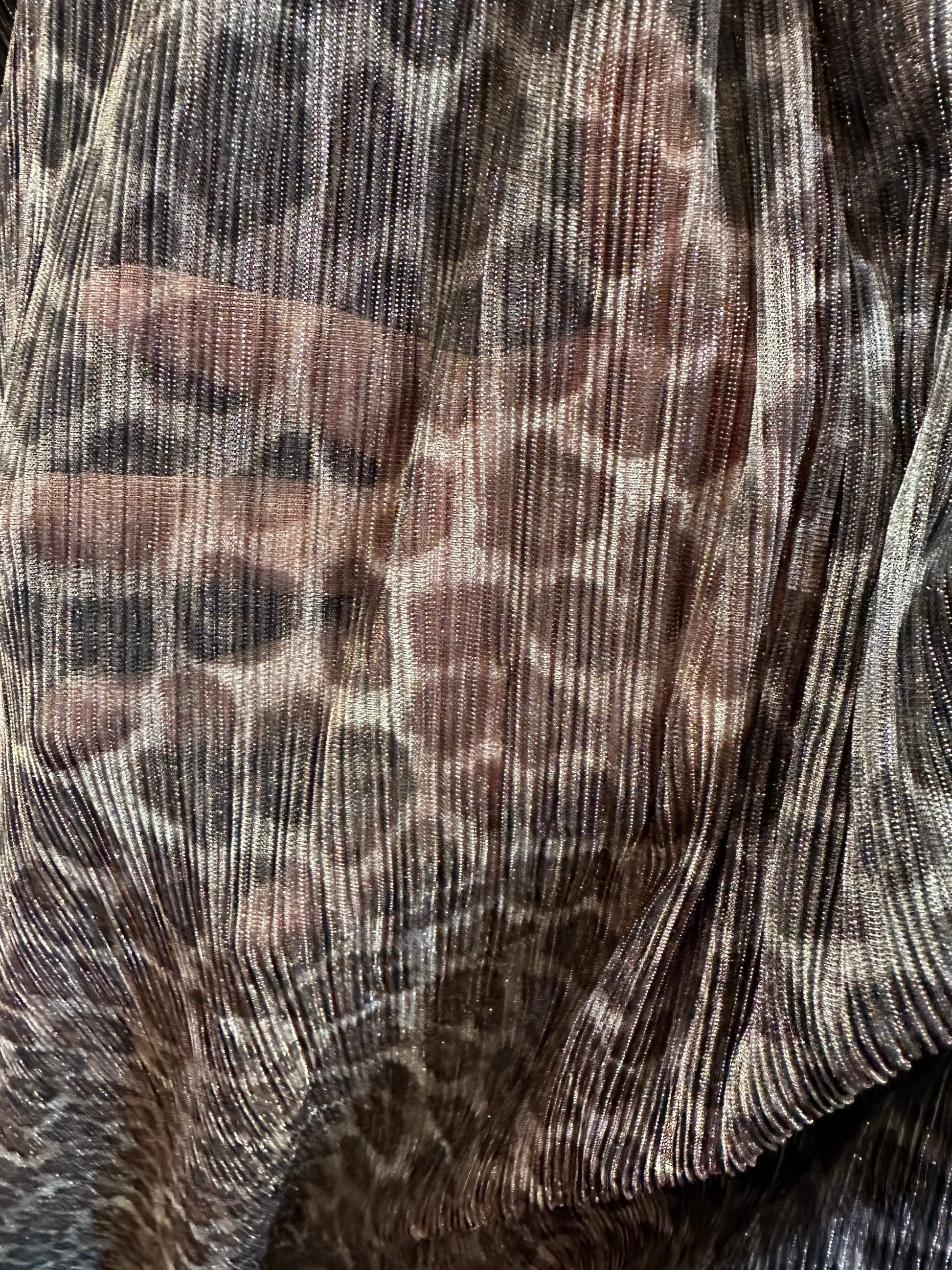 New Exotic leopard design Gold/Brown print on pleated metallic mesh 2-way stretch 58/60” Sold by the YD. Ships worldwide from Los Angeles California USA