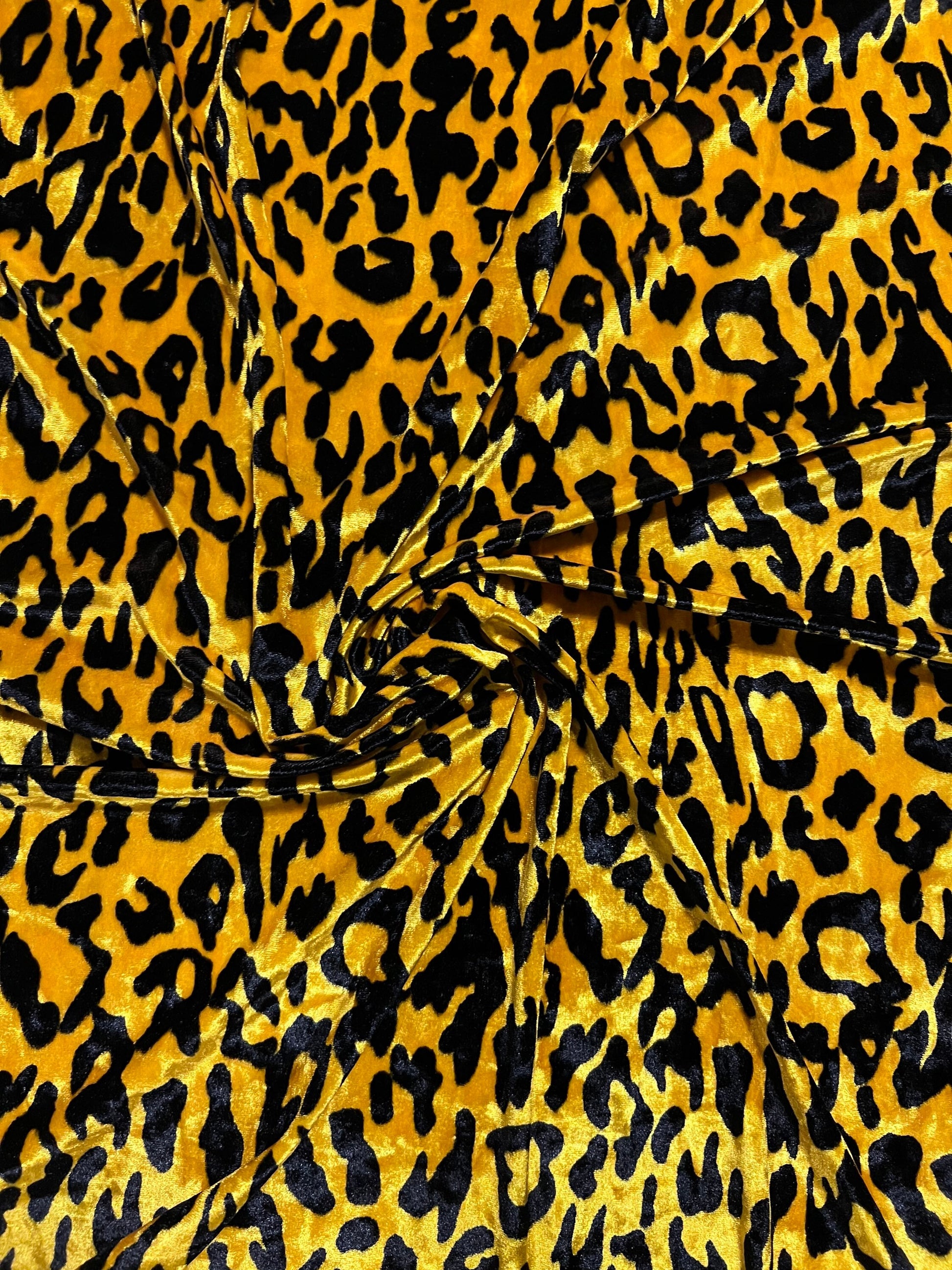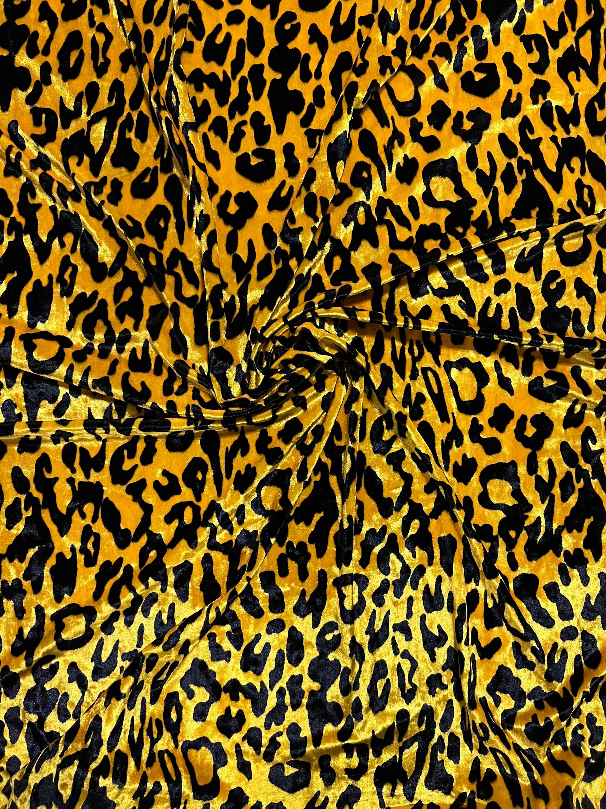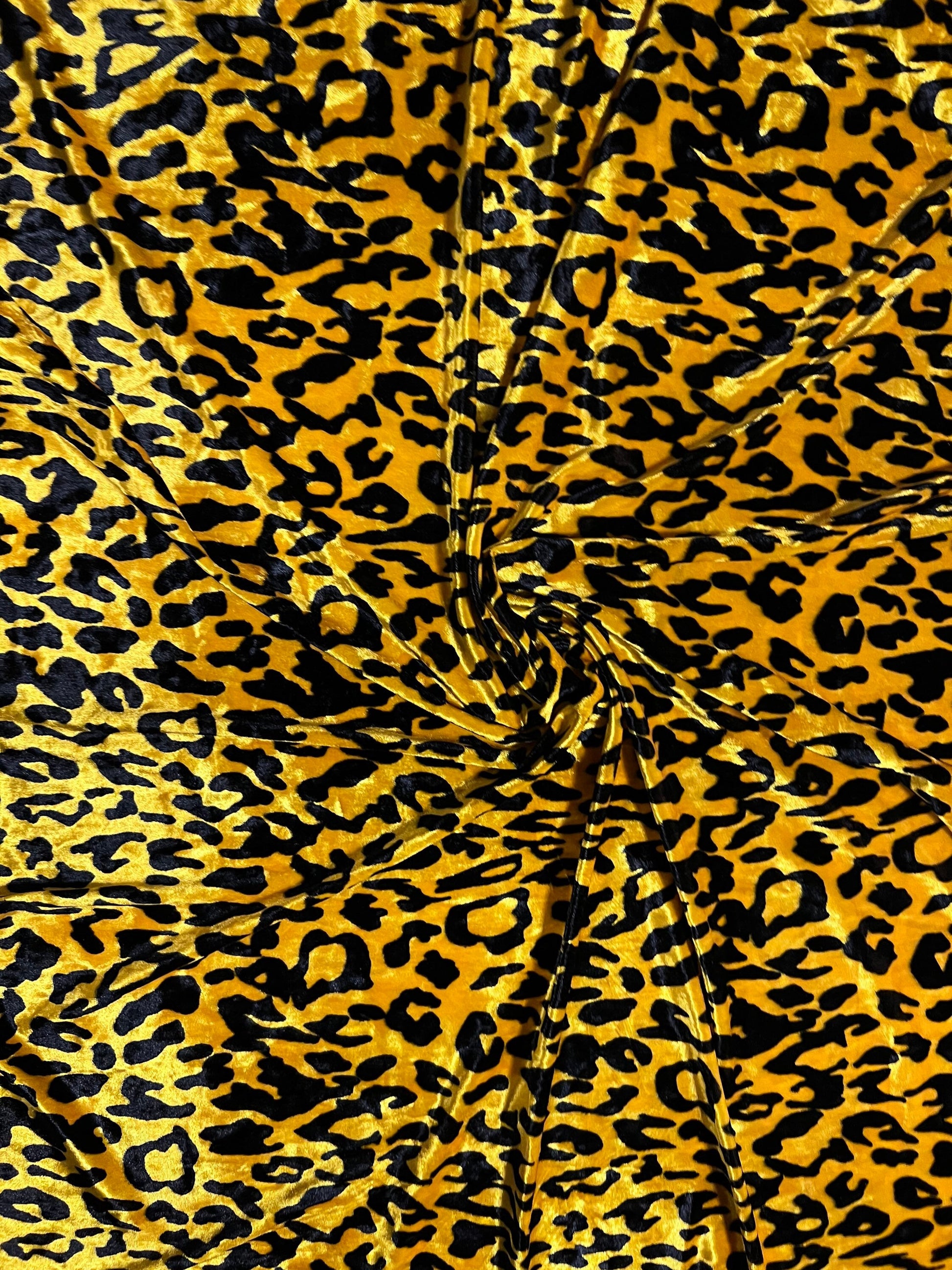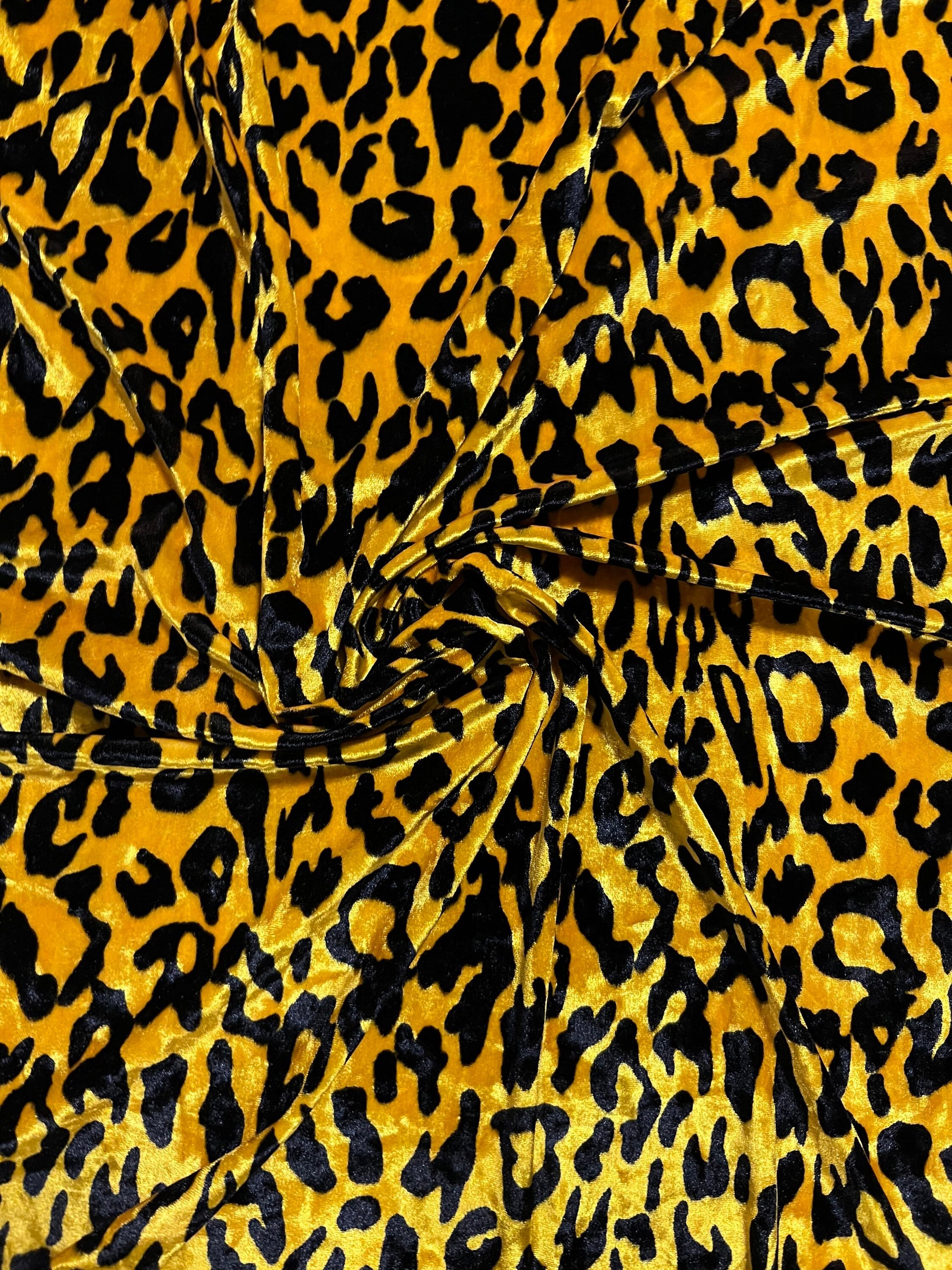 New Exotic Leopard design yellow/black print on great quality of stretch velvet 4-way stretch 58/60” Sold by the YD. Ships Worldwide From Los Angeles California USA.