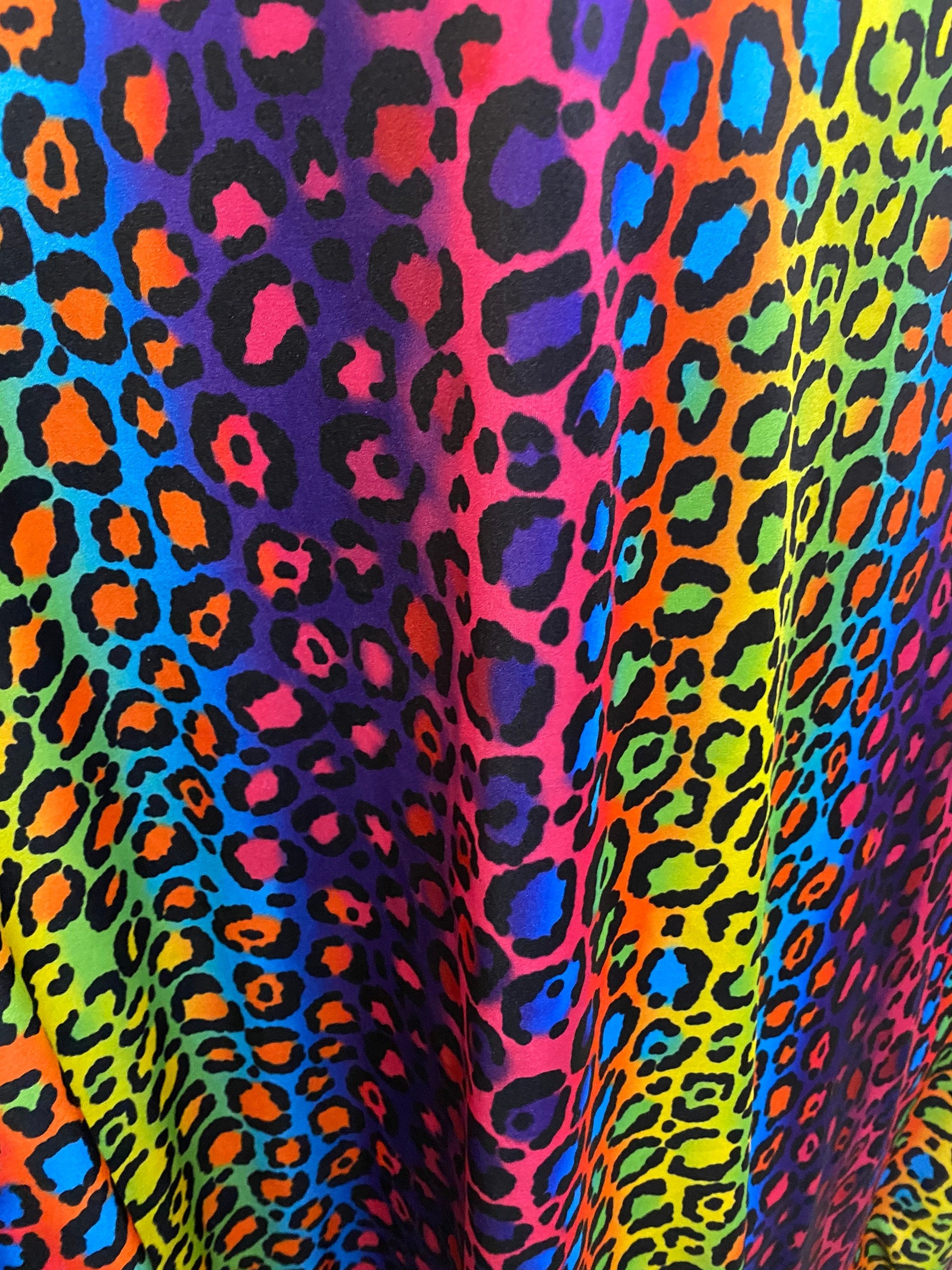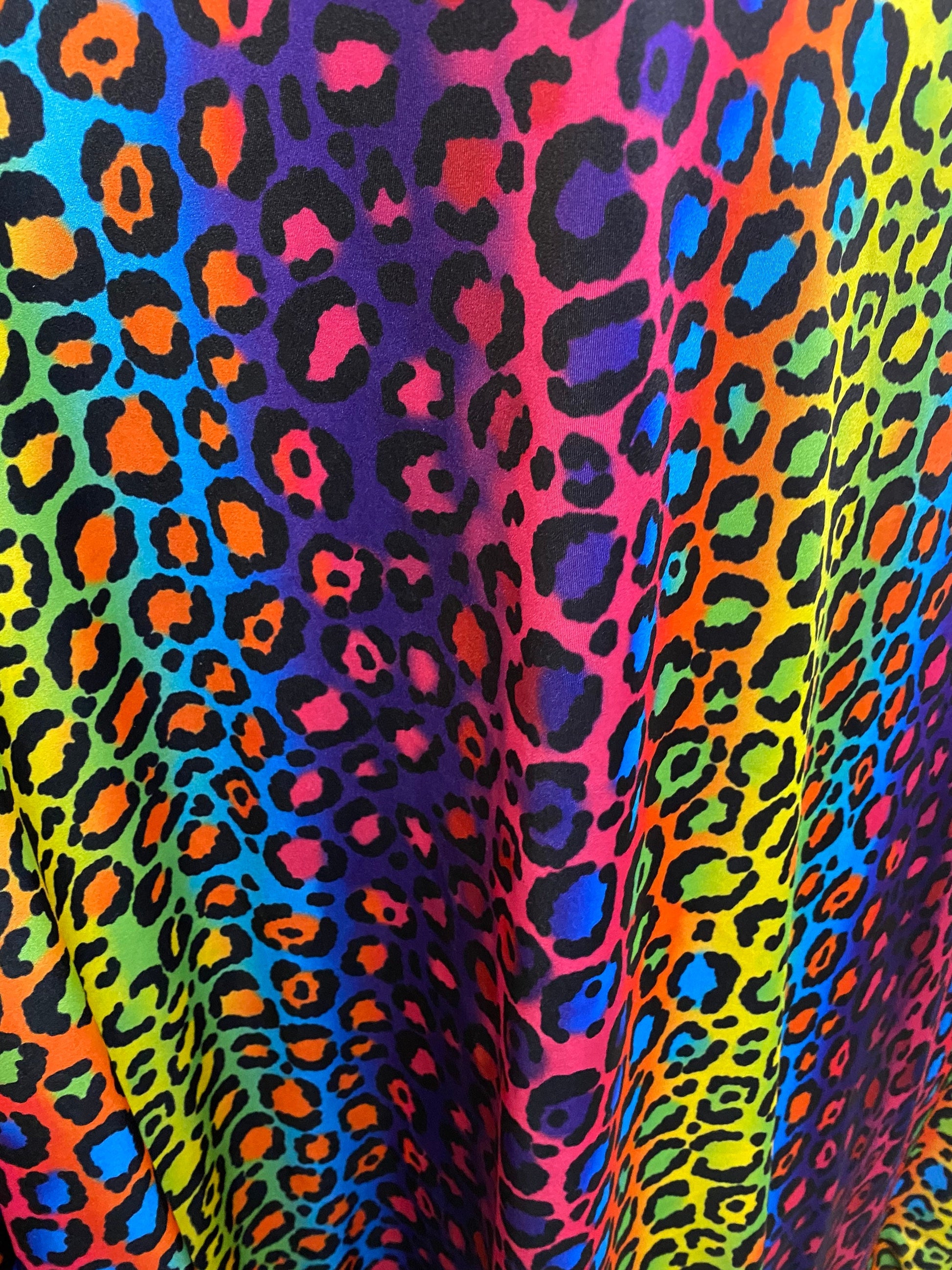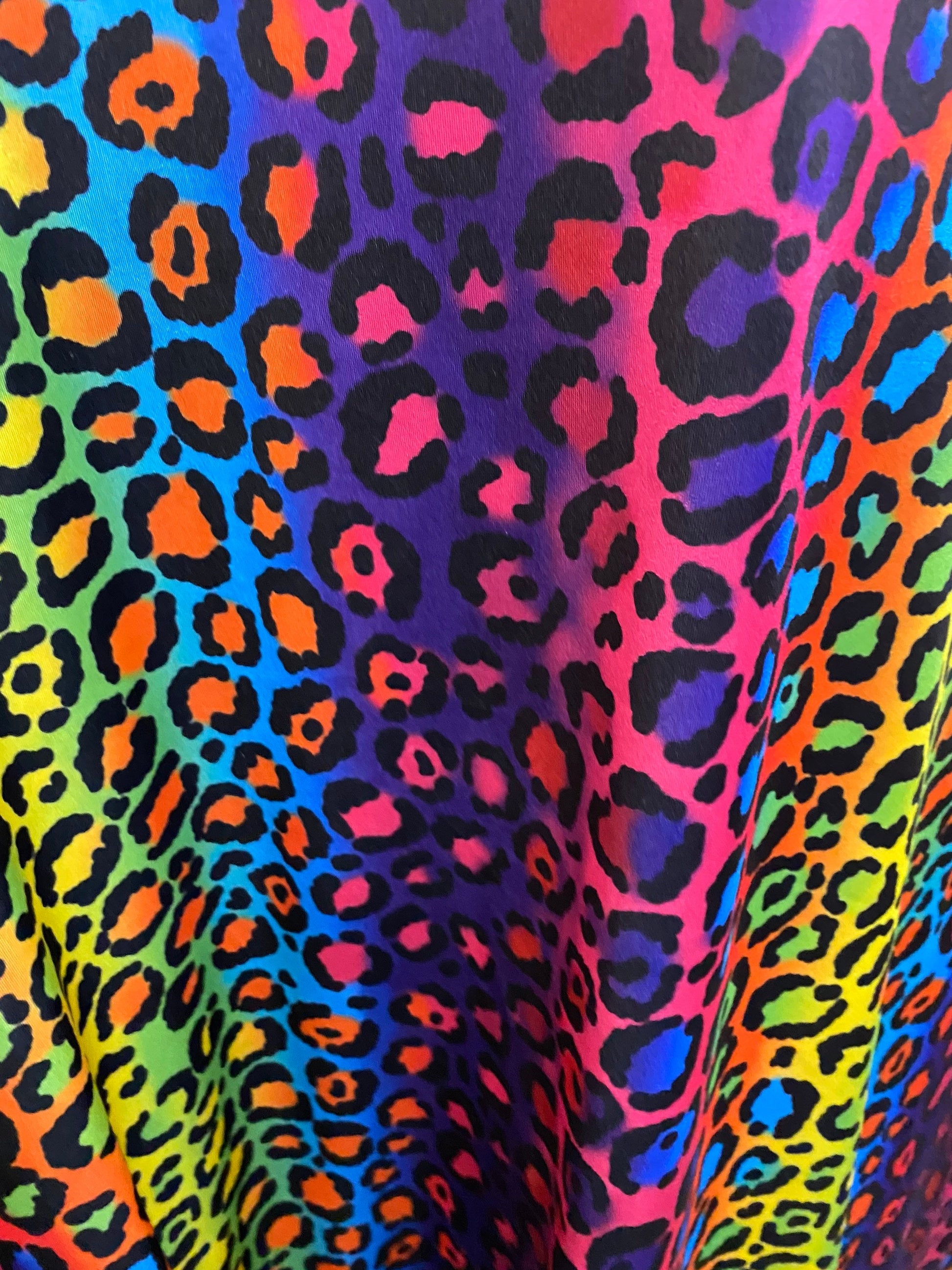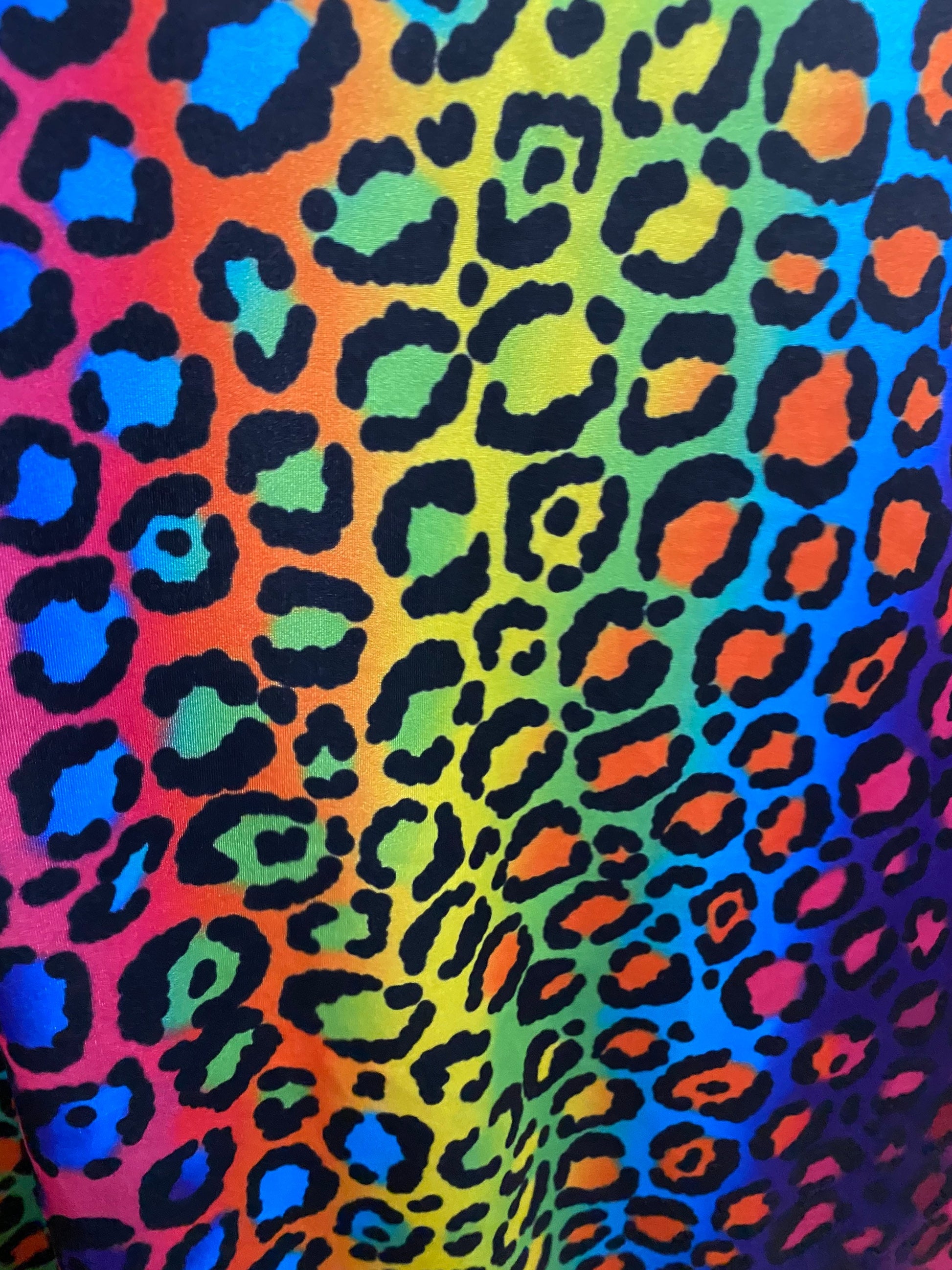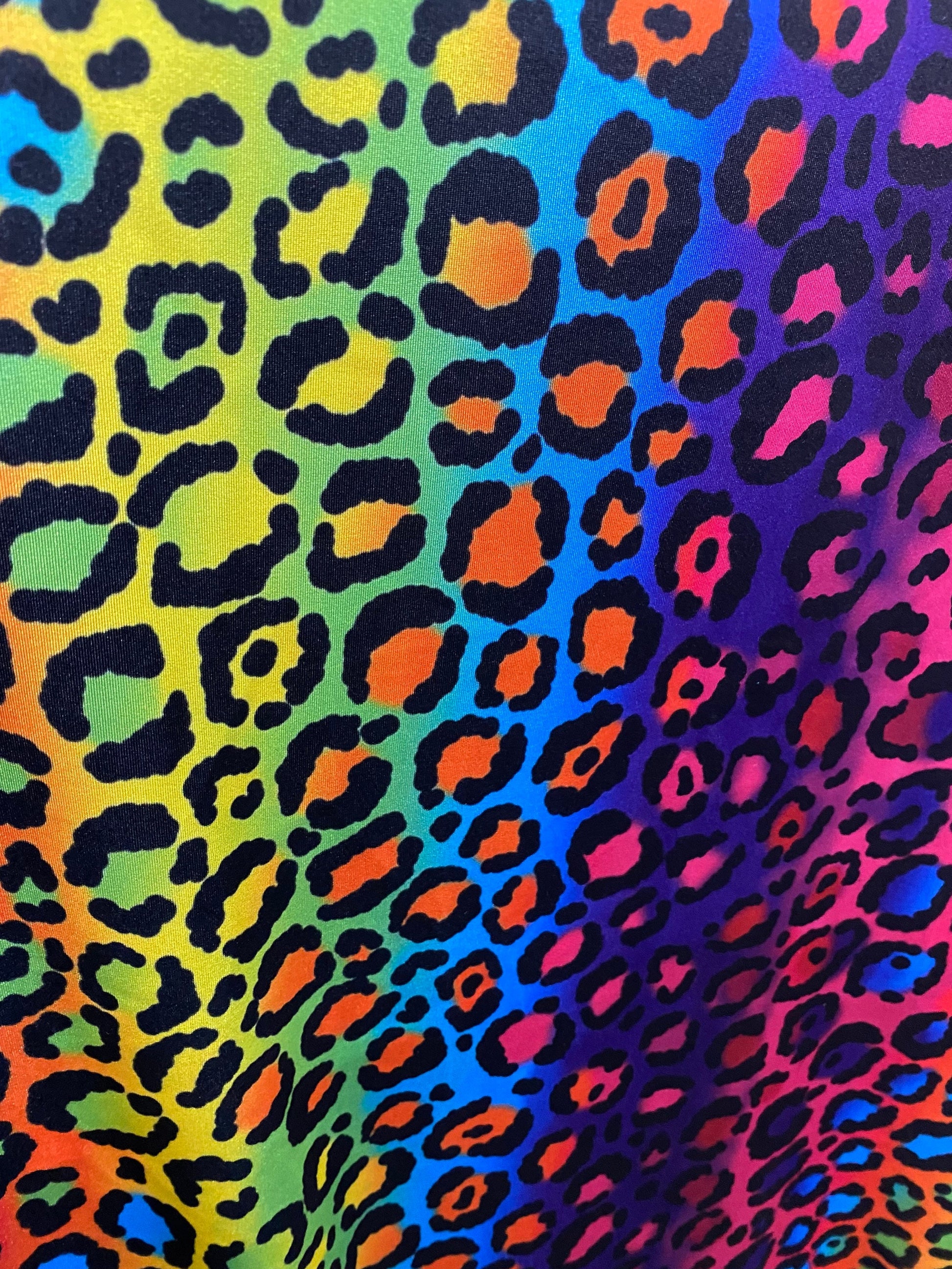 New Exotic rainbow leopard design print on great quality of nylon spandex;-way stretch 58/60” Sold by the YD. Ships Worldwide from Los Angeles California USA