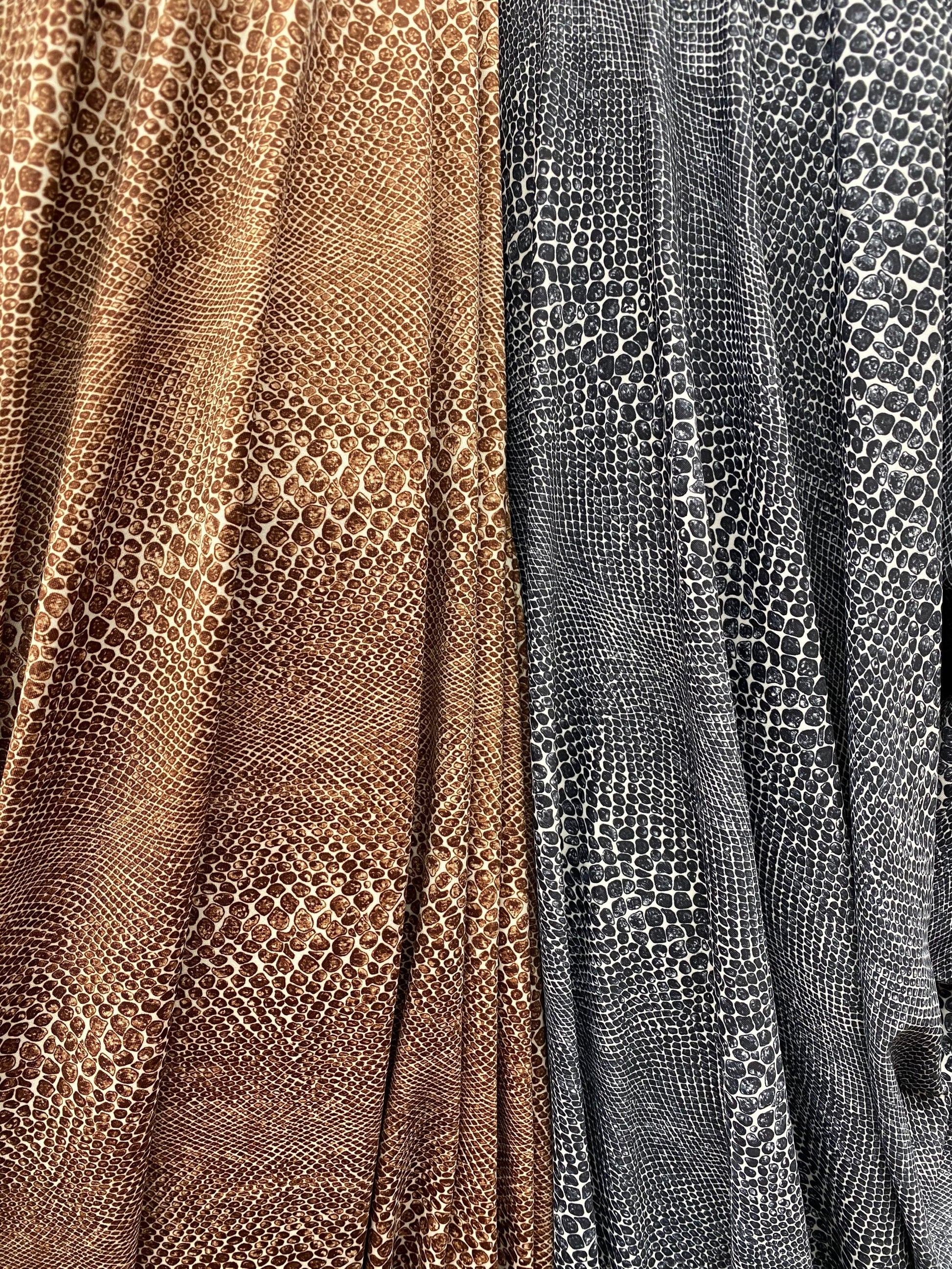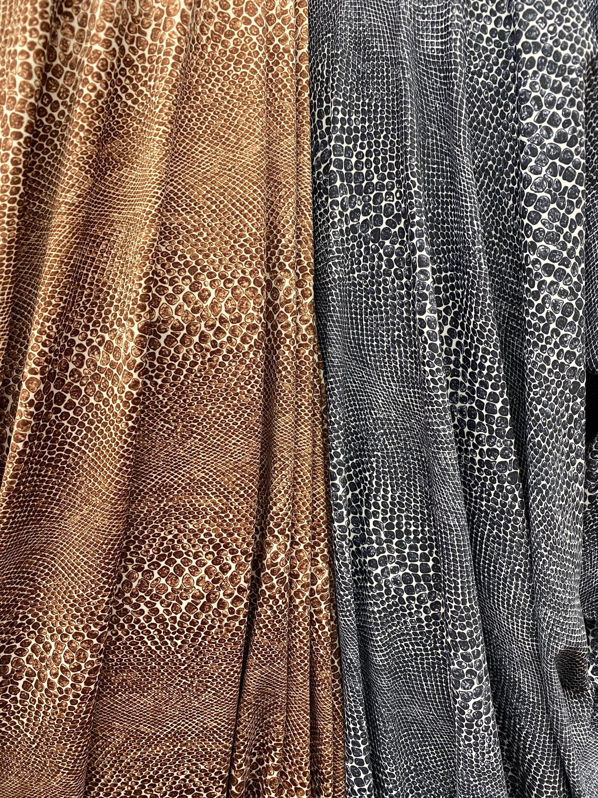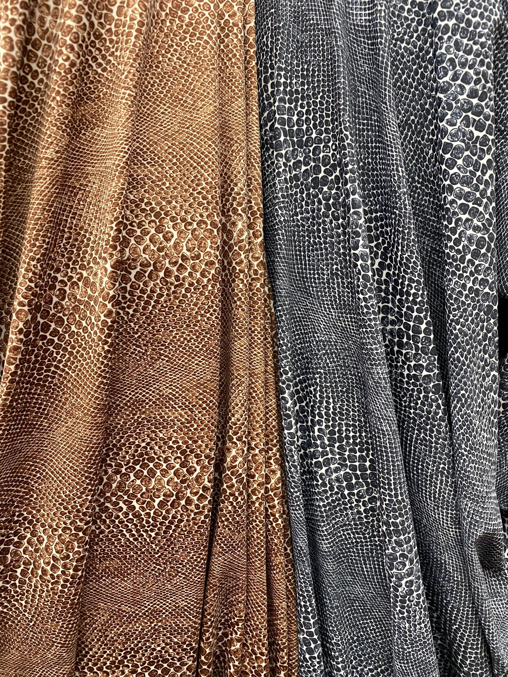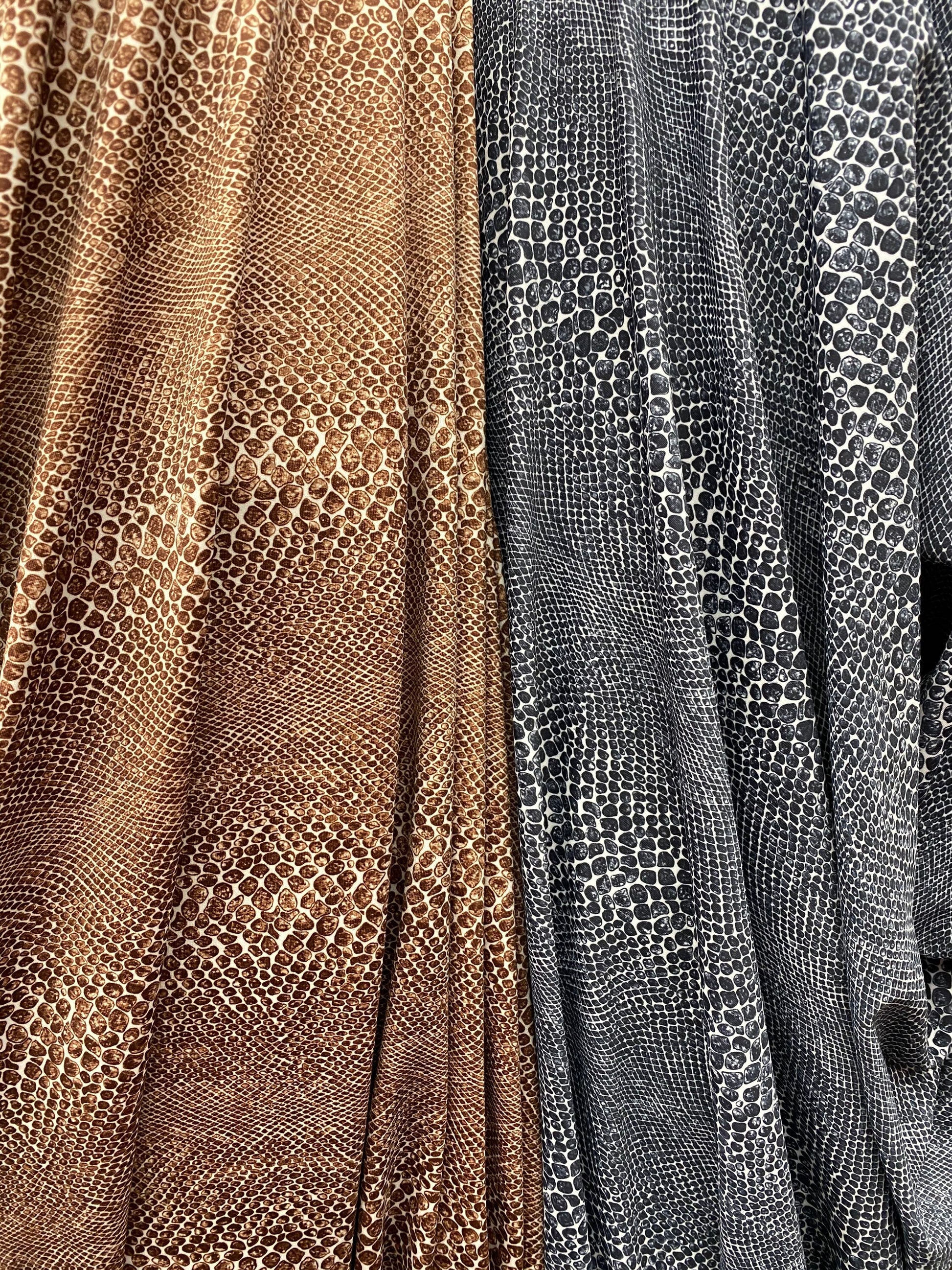 New exotic snake design print on nylon spandex 4-way stretch 58/60” Sold by the YD. Ships worldwide from Los Angeles California USA.