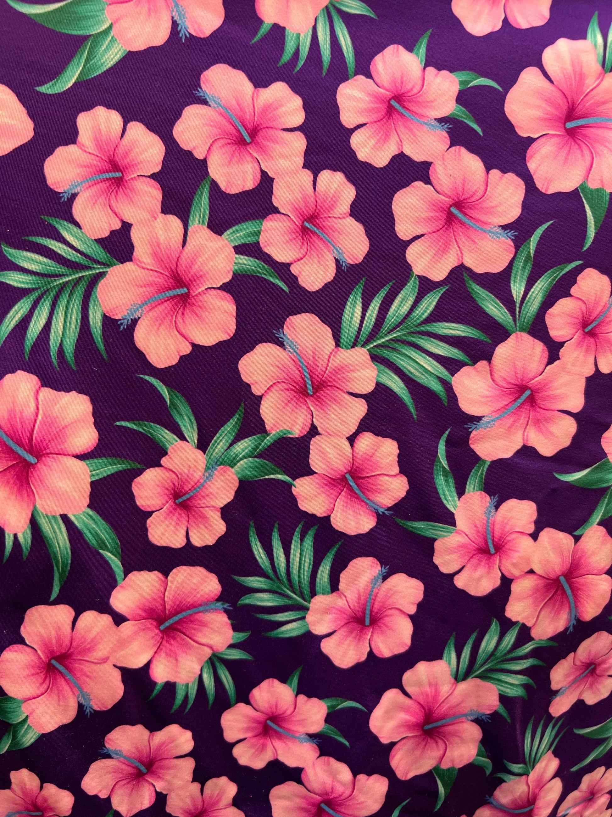New floral design eggplant/pink print on great quality of nylon spandex 4-way stretch 58/60” Sold by the YD. Ships Worldwide from Los Angeles California USA.