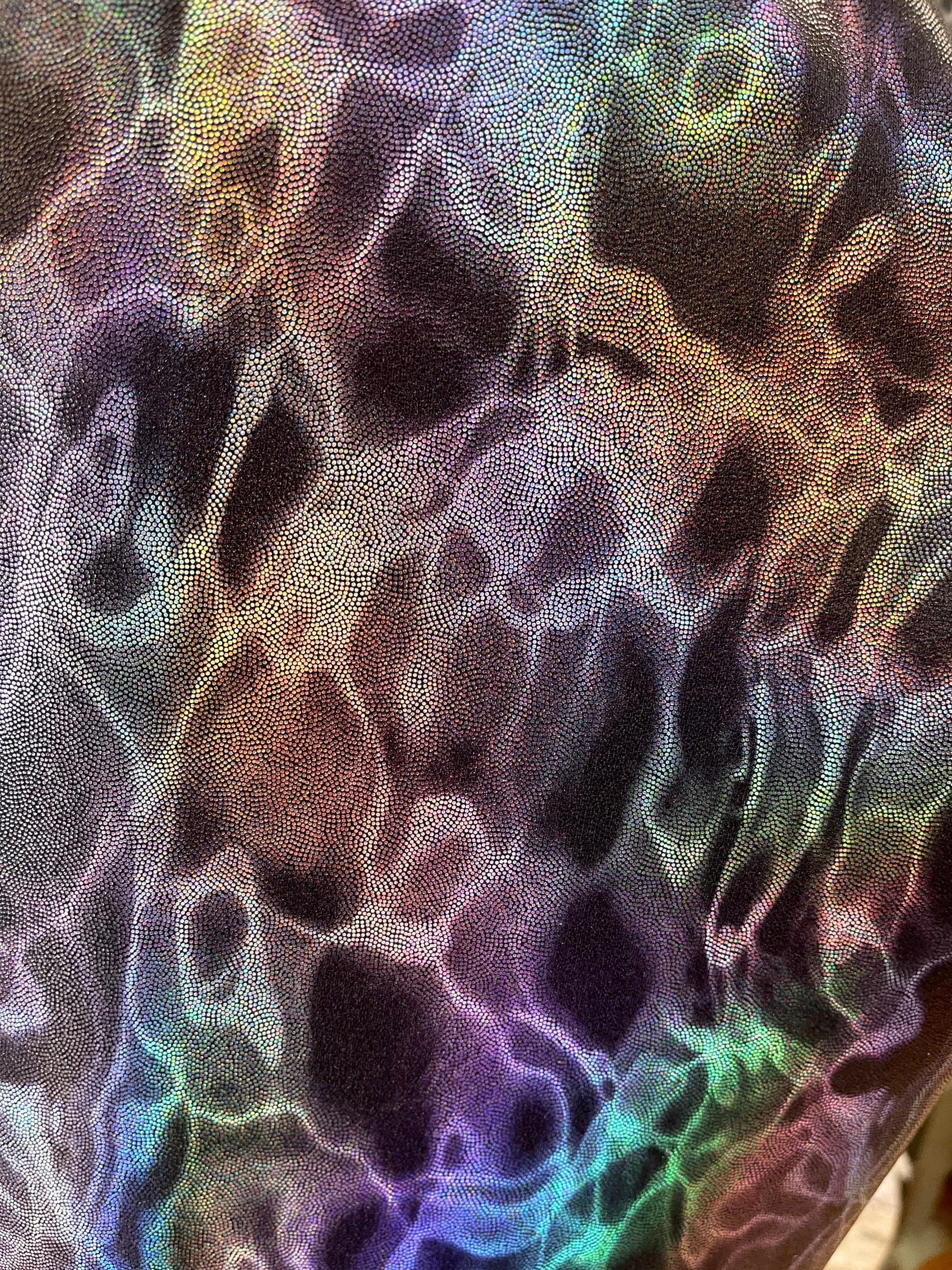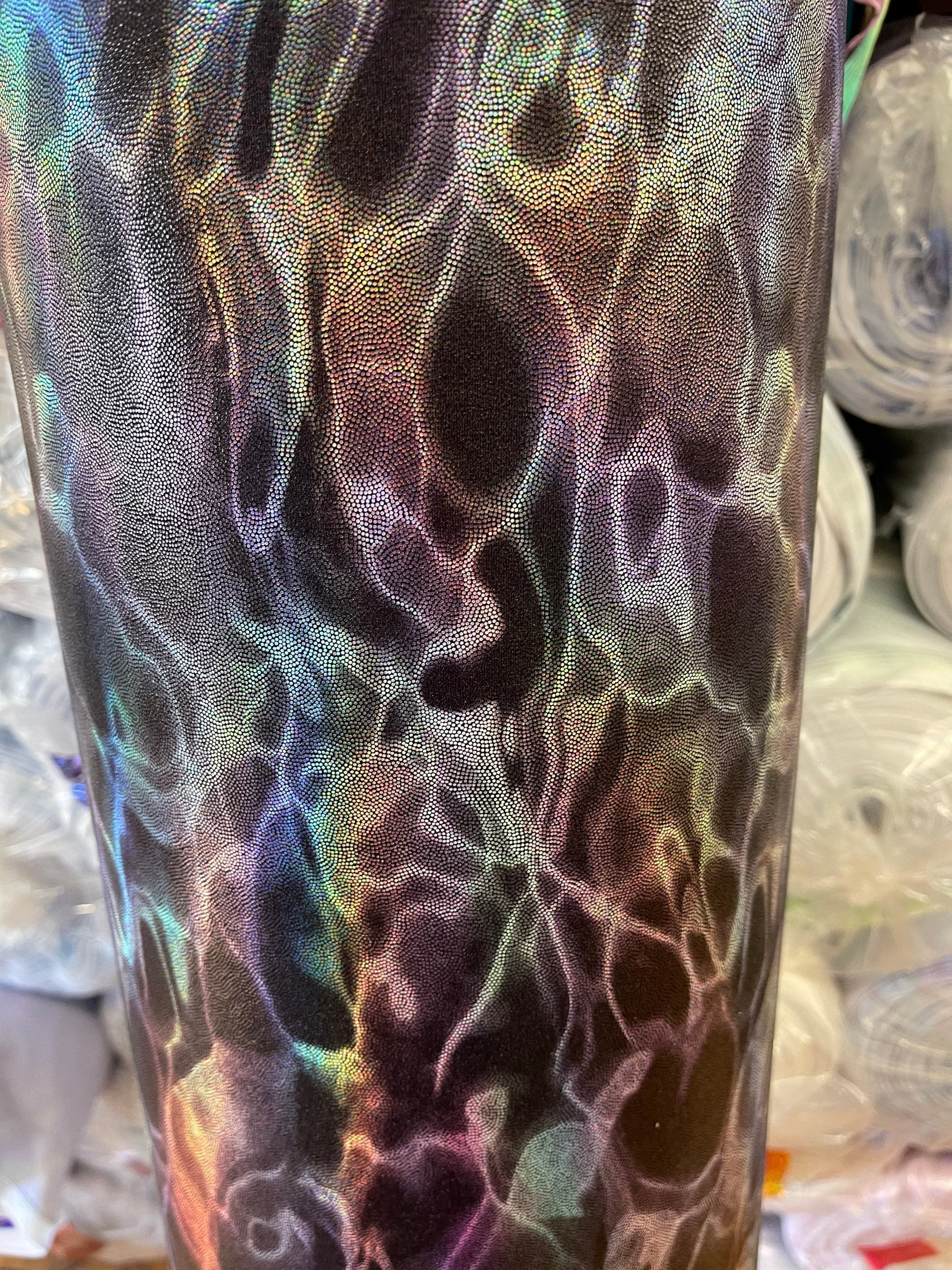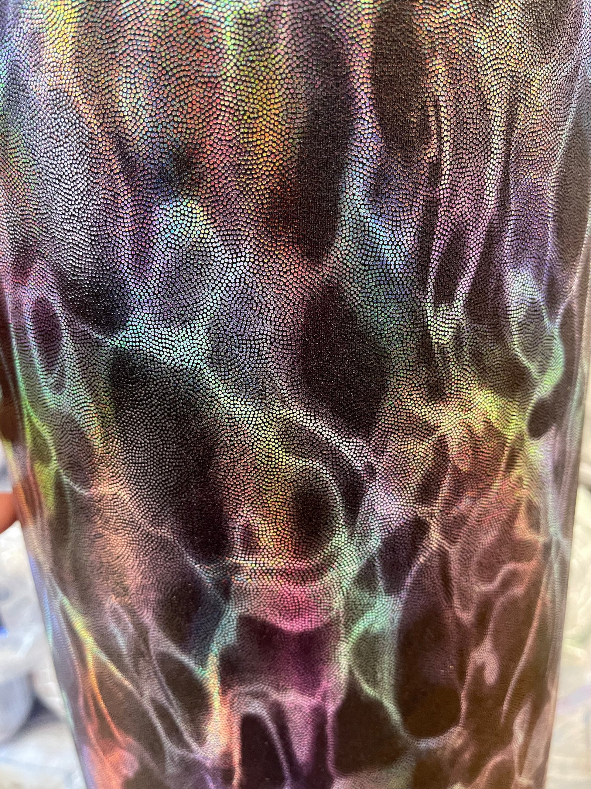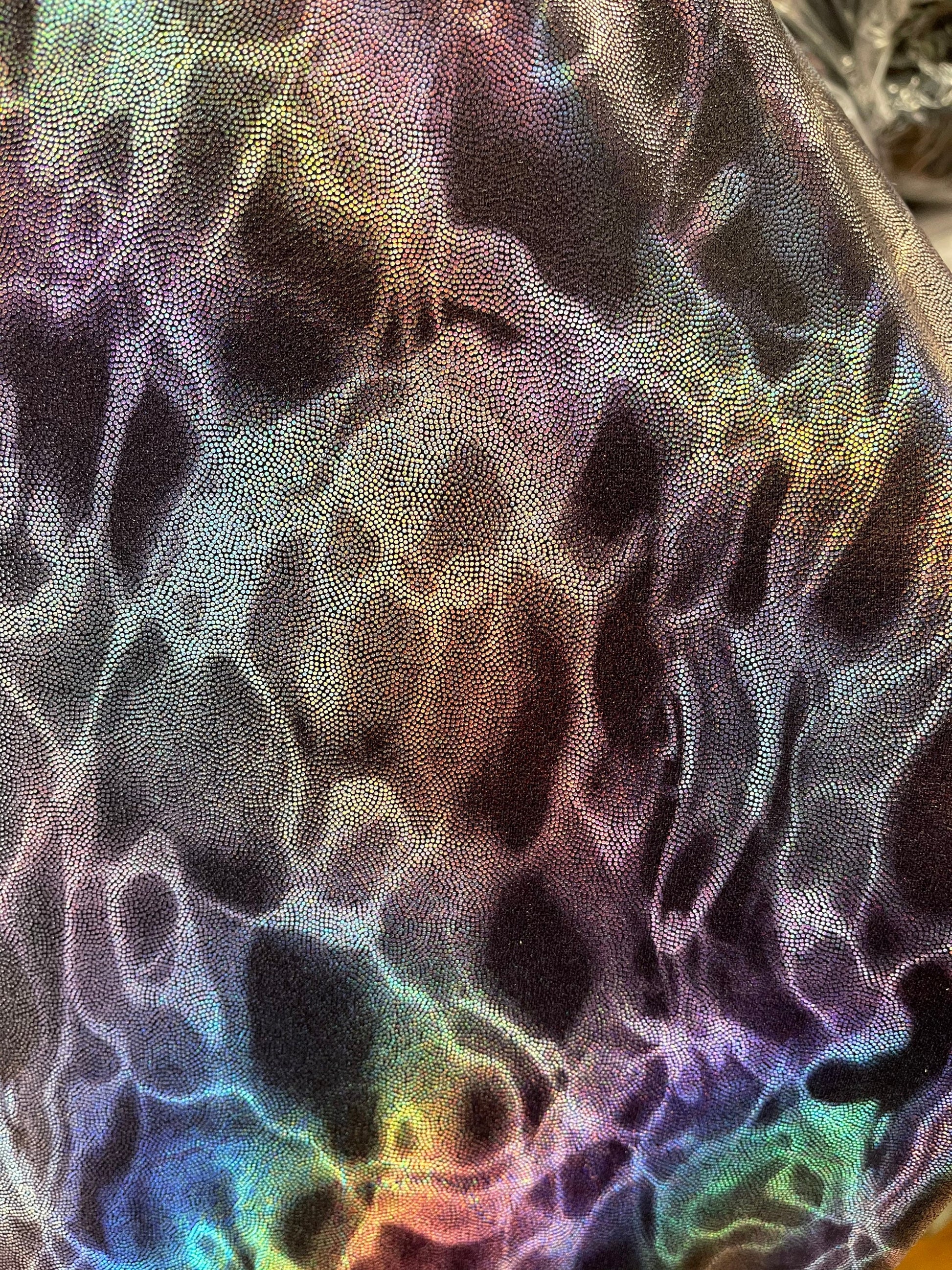 New Ghost design metallic nylon spandex with iridescent foggy foil 4-way stretch 58/60” Sold by the YD. Ships Worldwide from Los Angeles California USA.