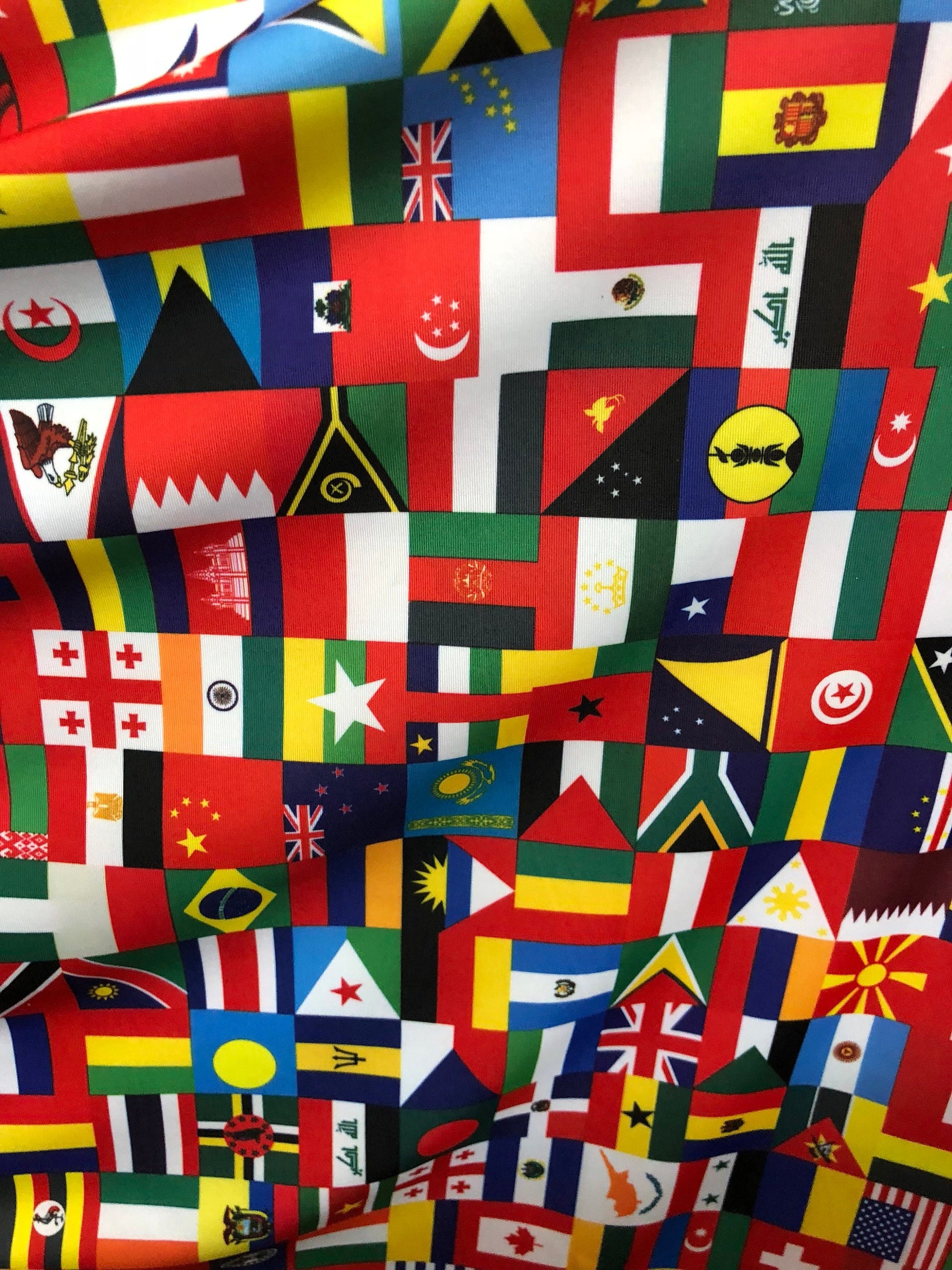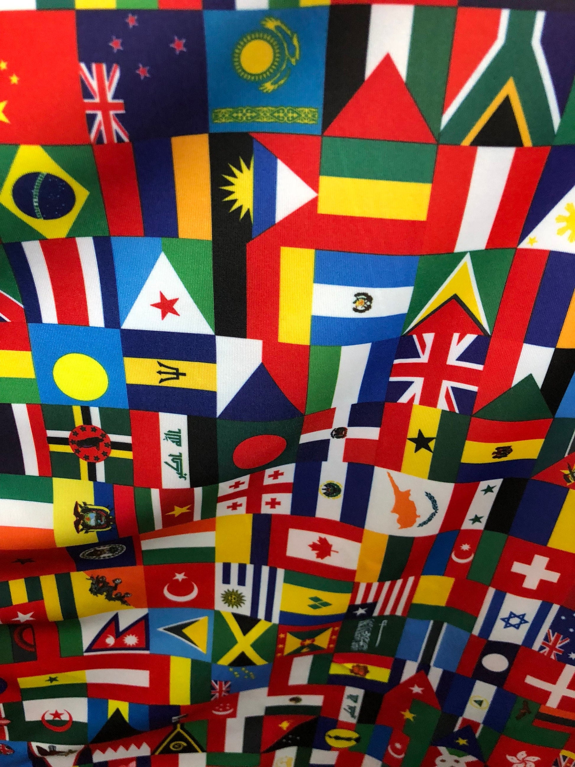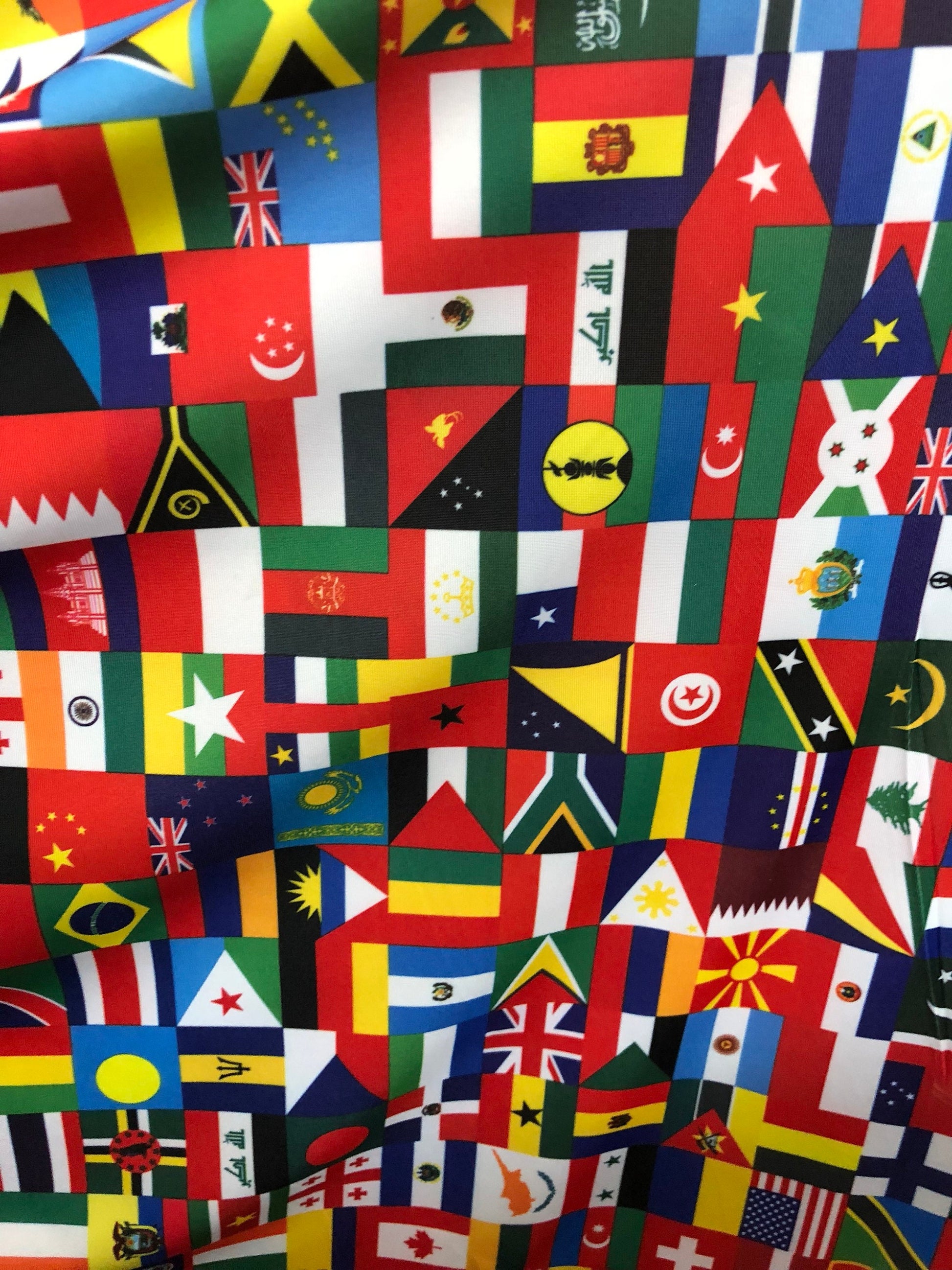 New International multi flags design printed on nylon spandex 4way stretch 58/60" Sold by the YD. Ships worldwide from Los Angeles CA USA.