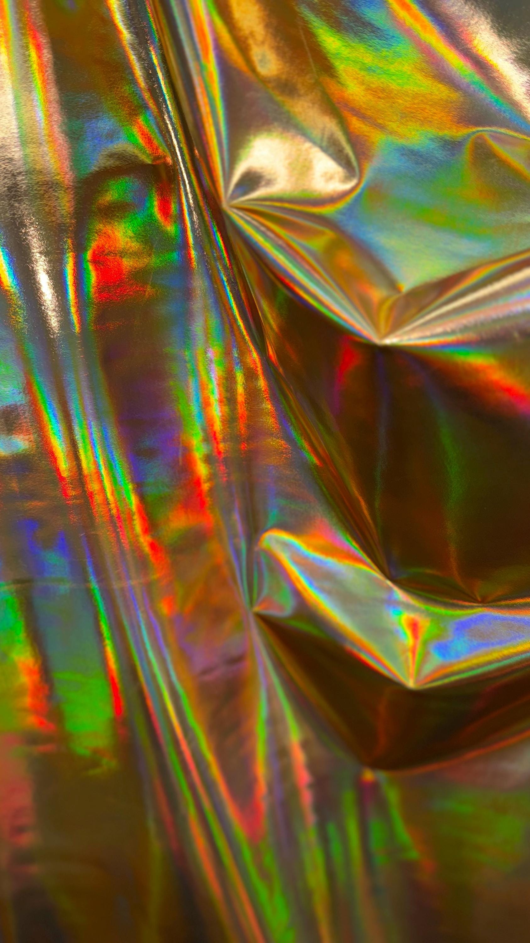 New Iridescent foggy foil oil effect metallic nylon spandex and iridescent metallic vinyl 4way stretch Sold by the YD. Ships worldwide