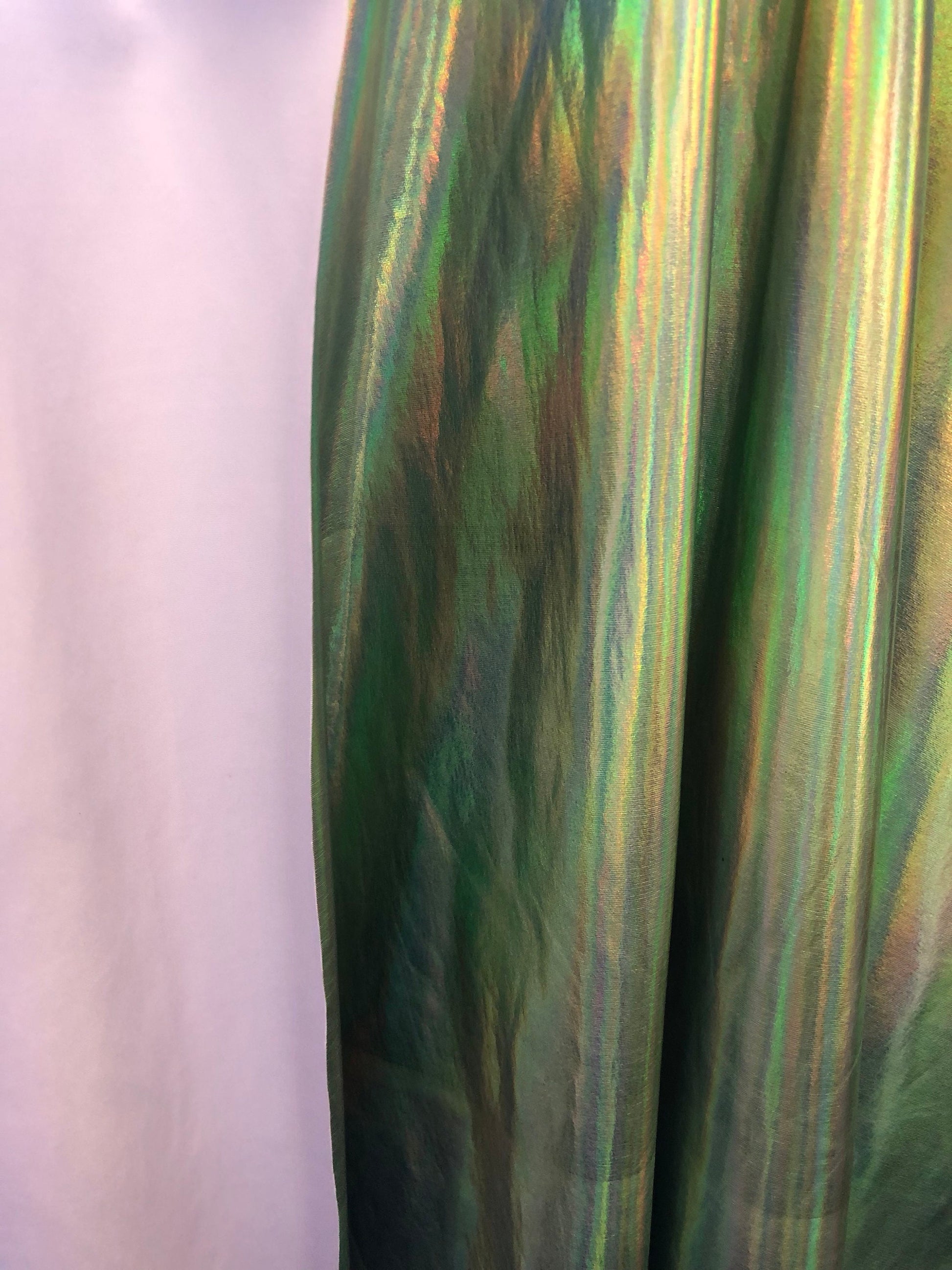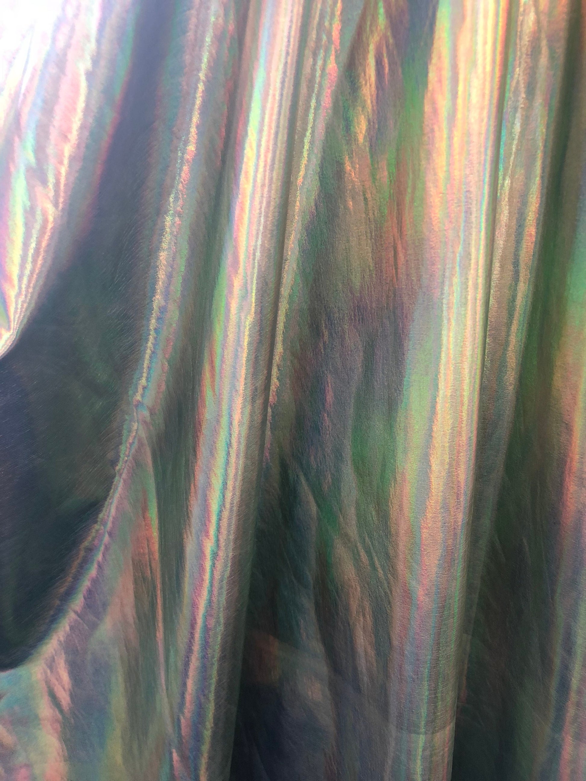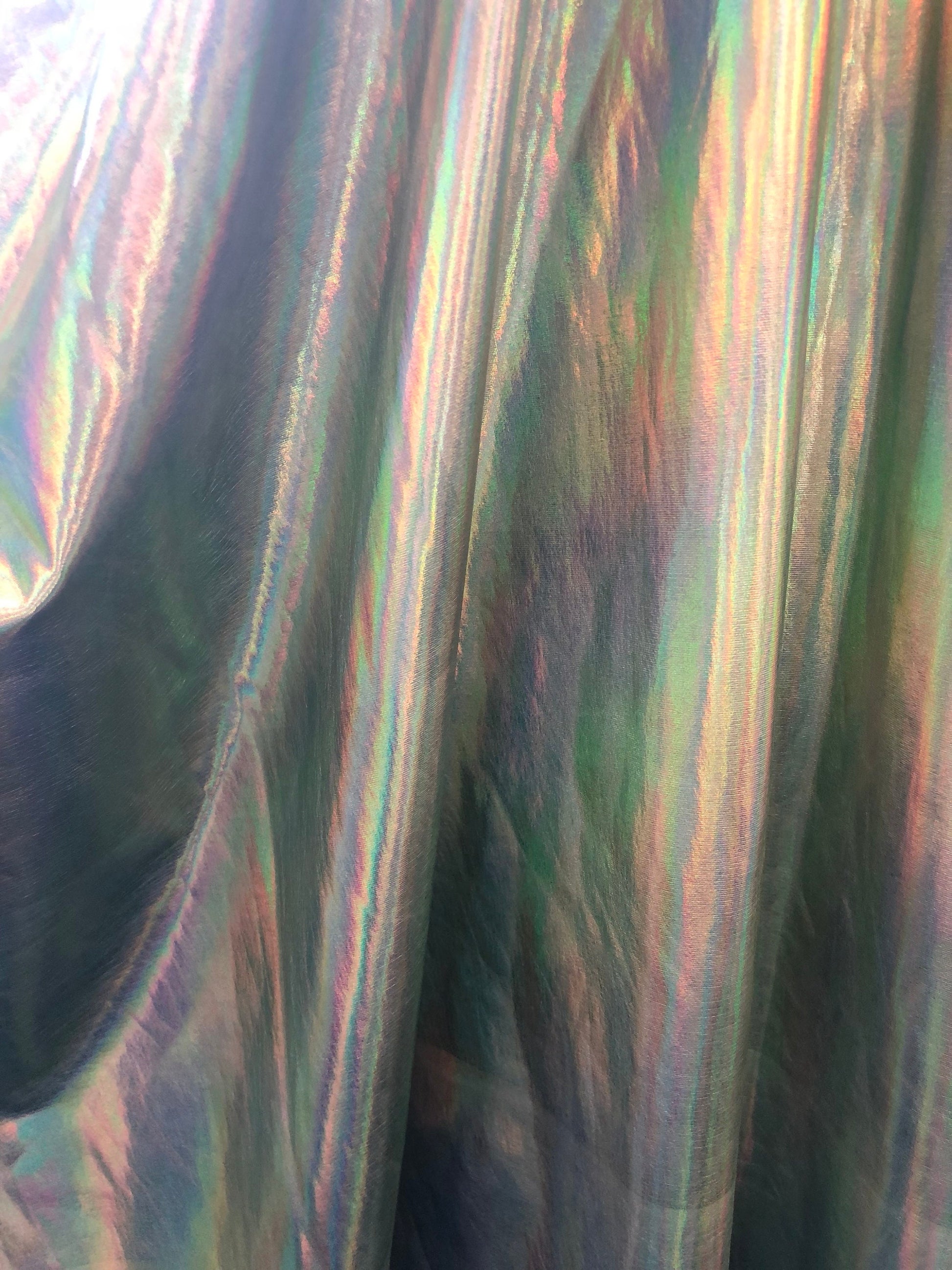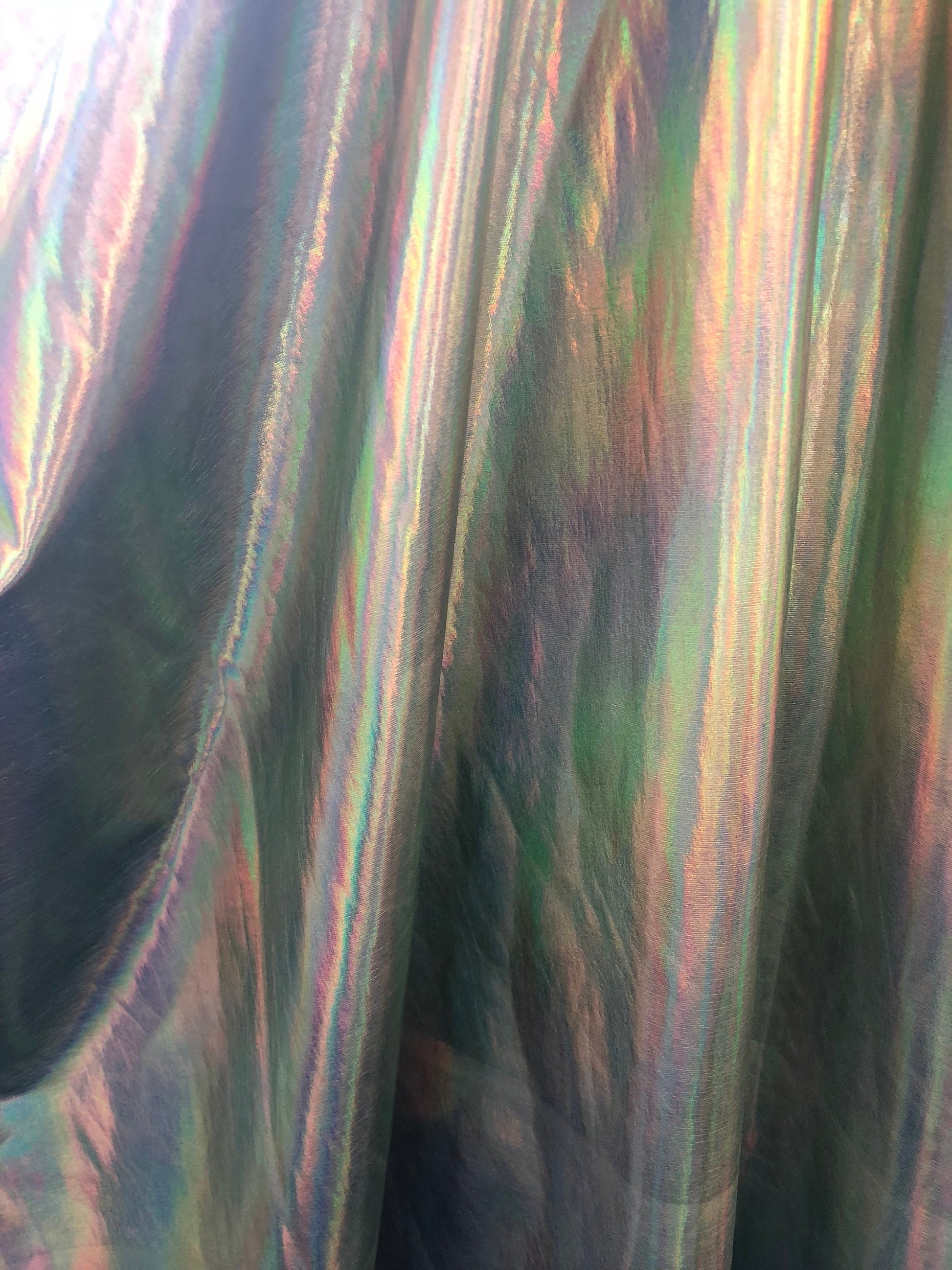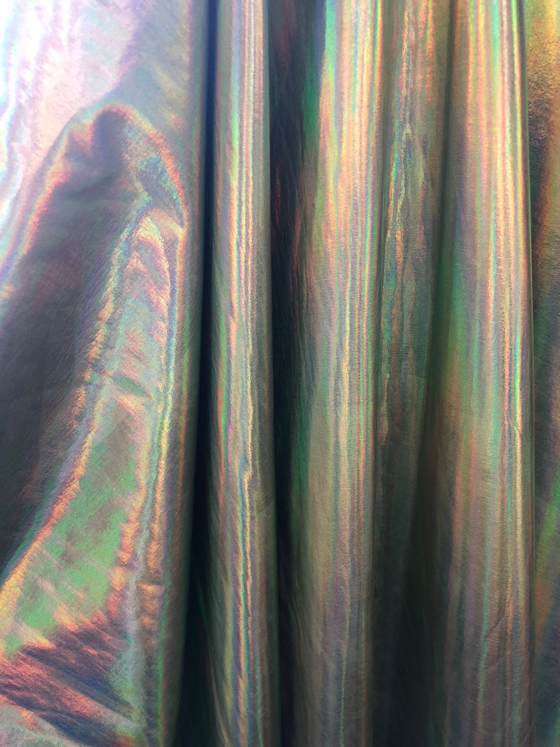 New iridescent olive foil metallic nylon spandex 4way stretch 58/60" Sold by the YD. Ships worldwide from Los Angeles California USA.