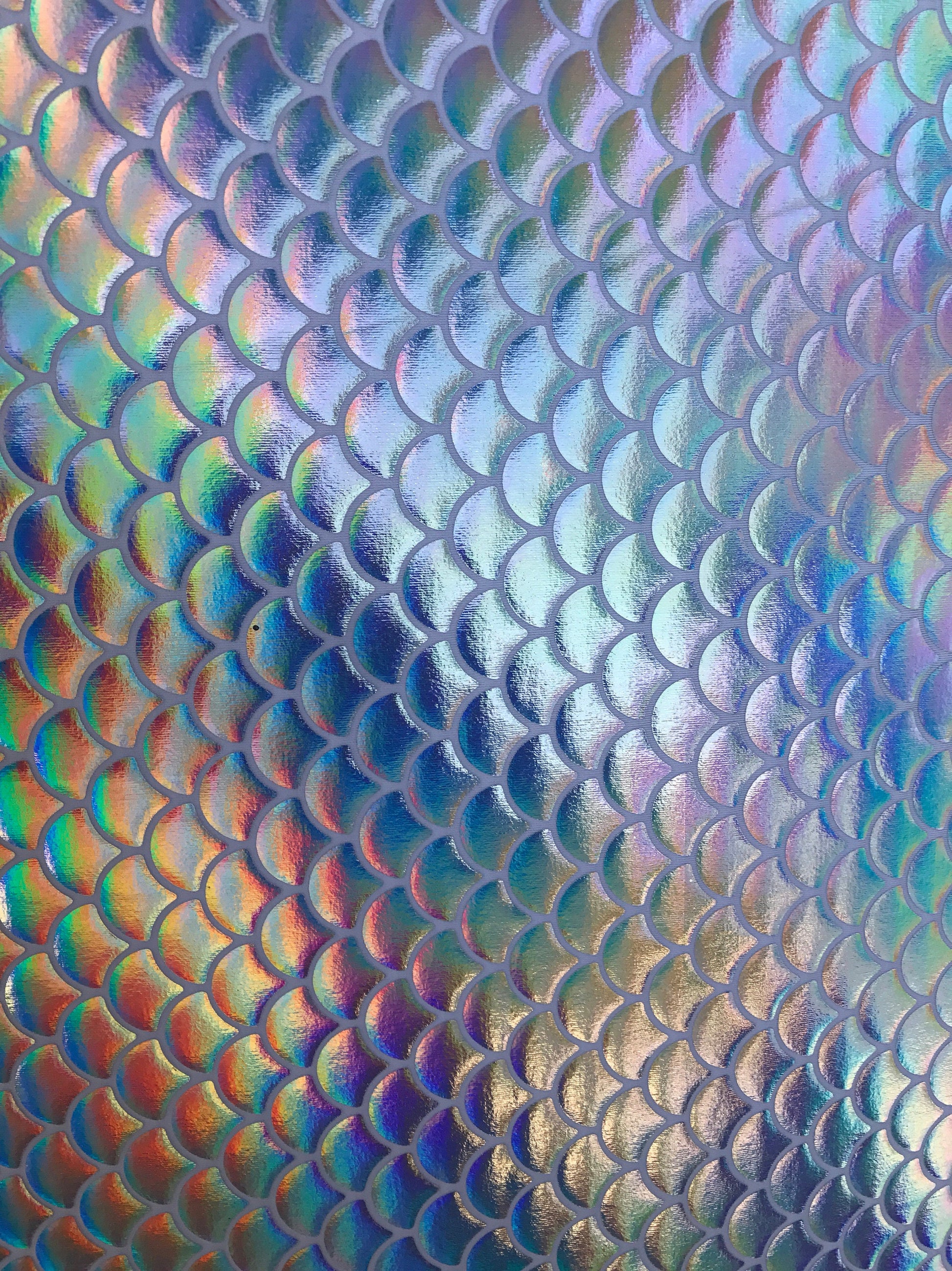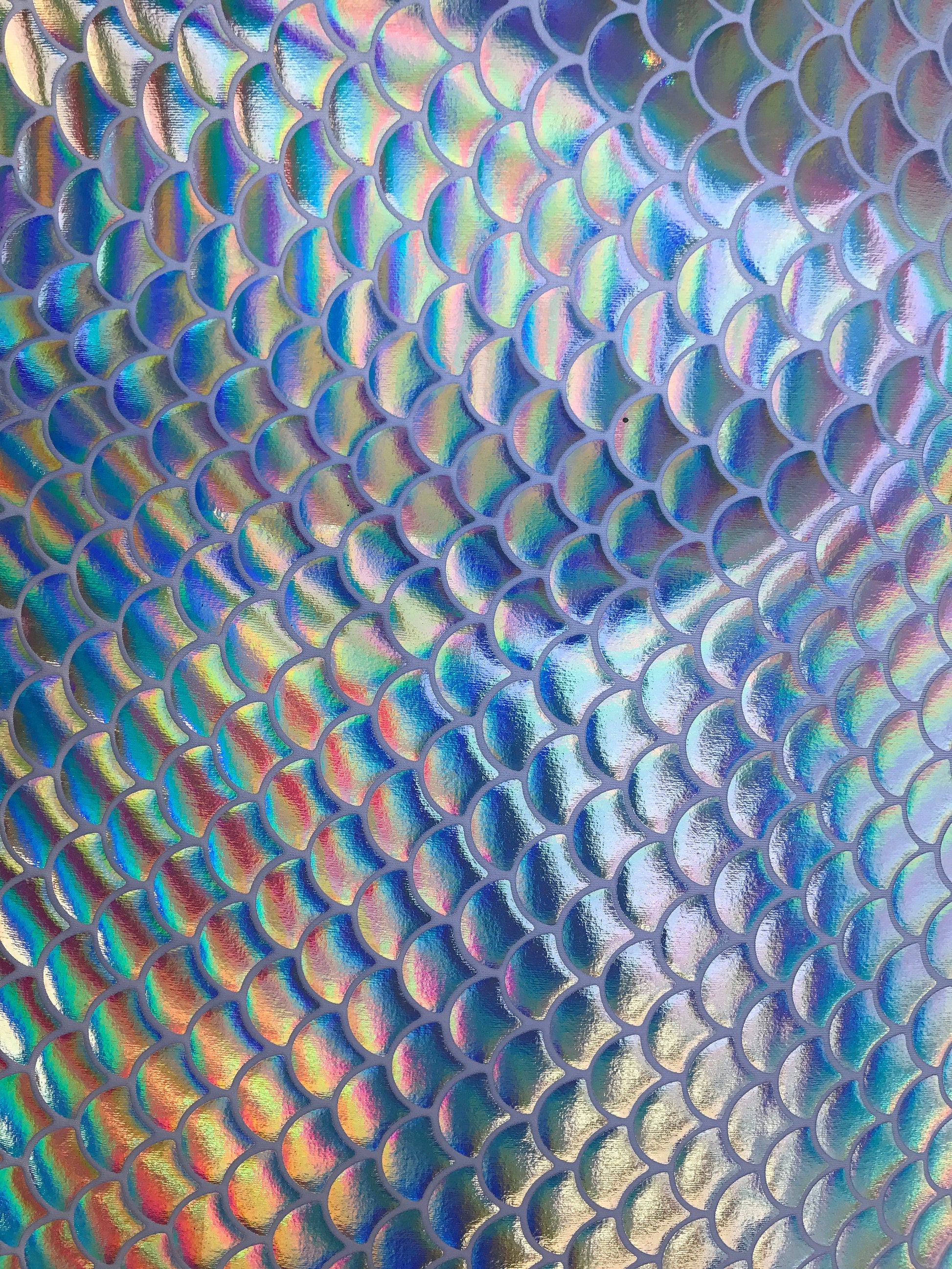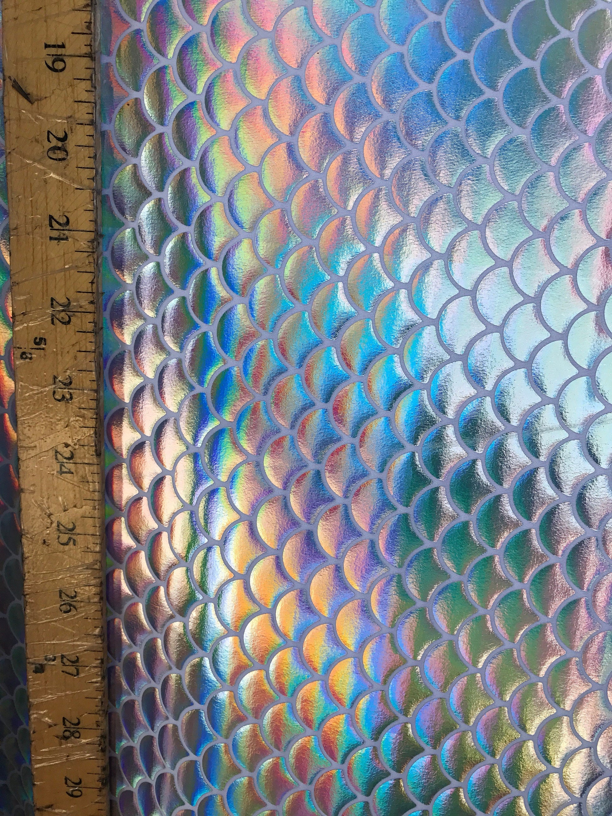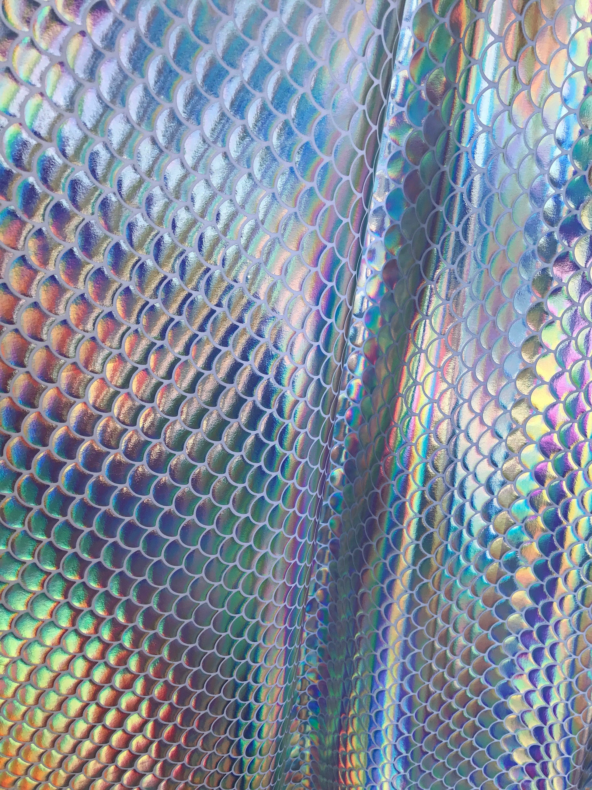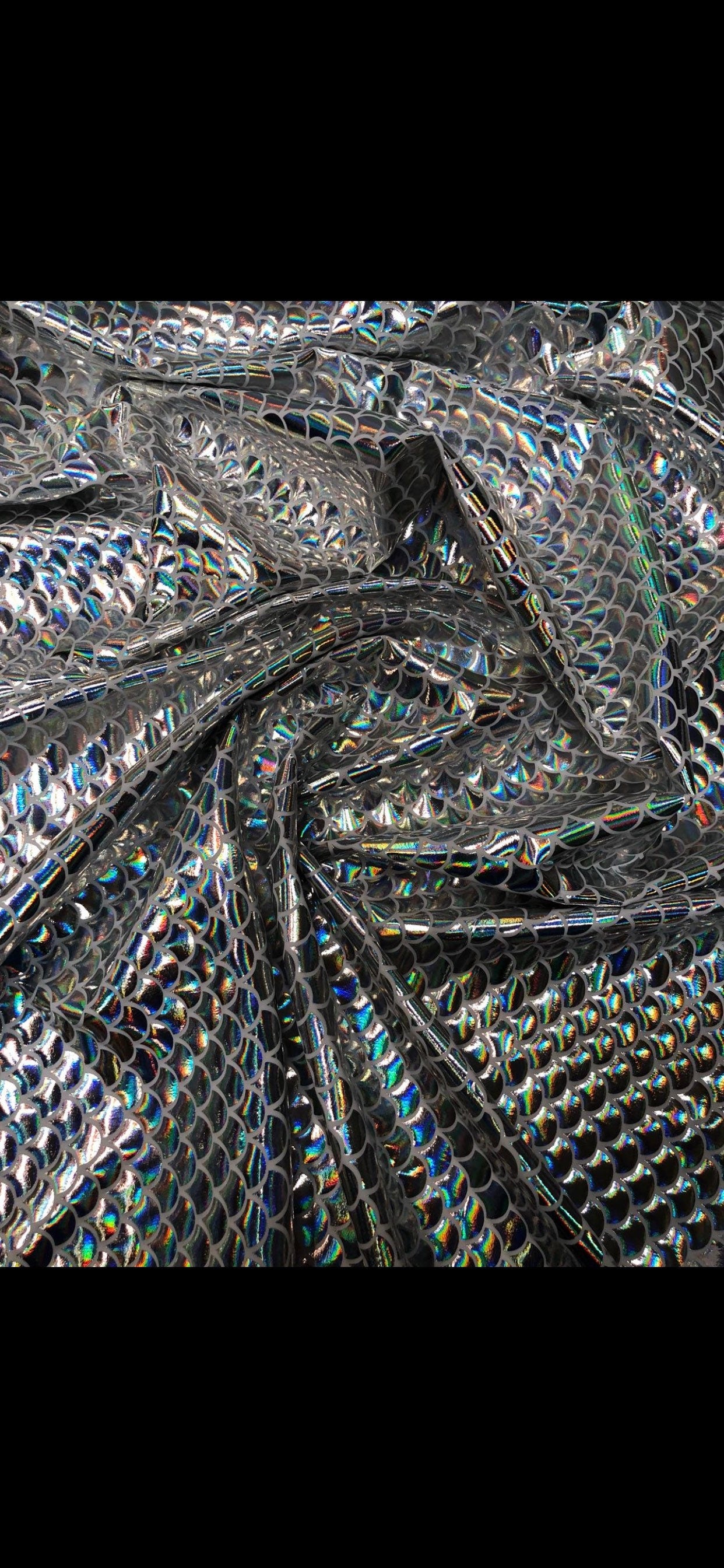 NEW iridescent white/silver fish Scale mermaid design metallic spandex 4way Stretch 58/60" Sold by the YD. Ships worldwide from Los Angeles California USA.