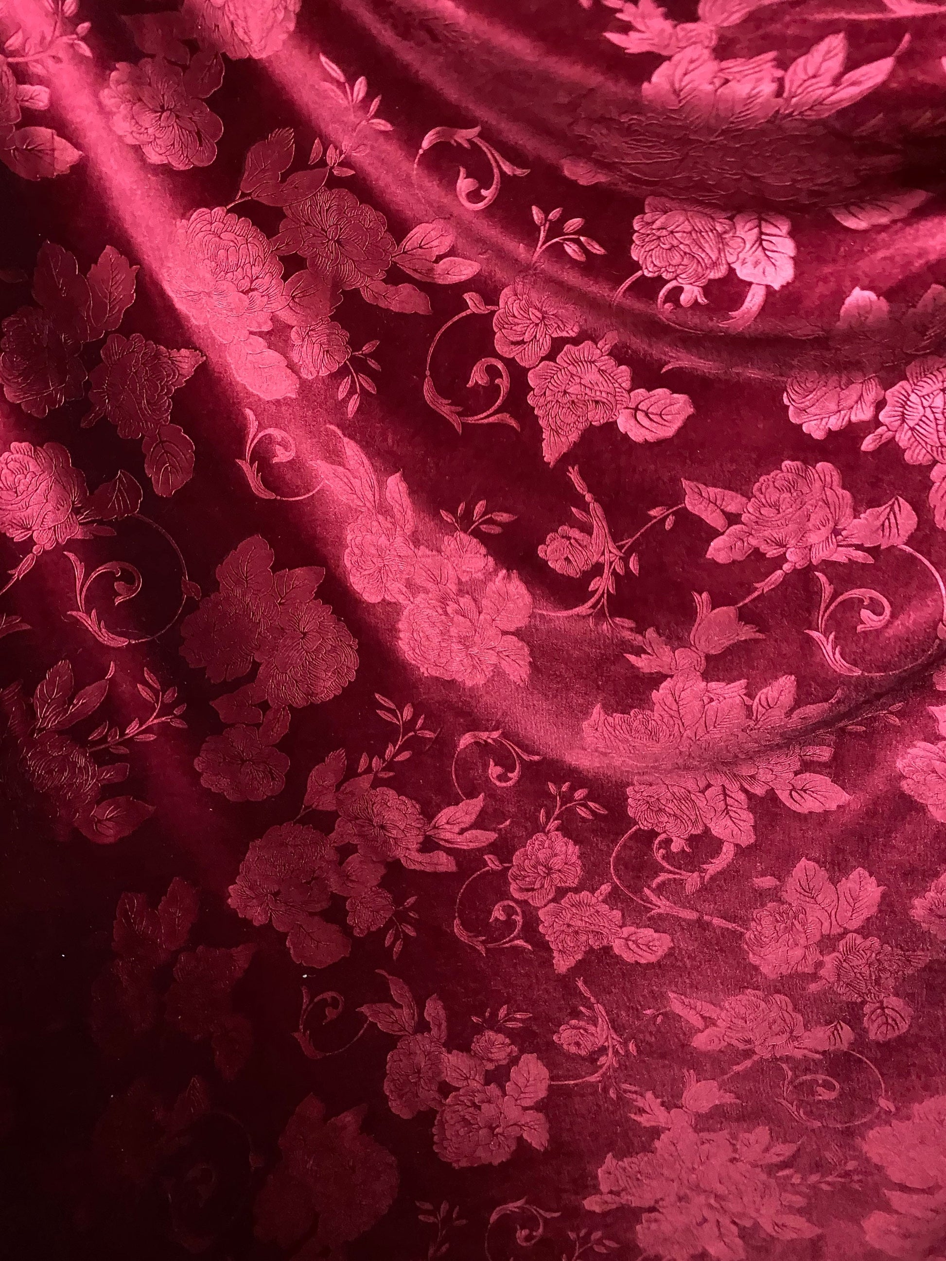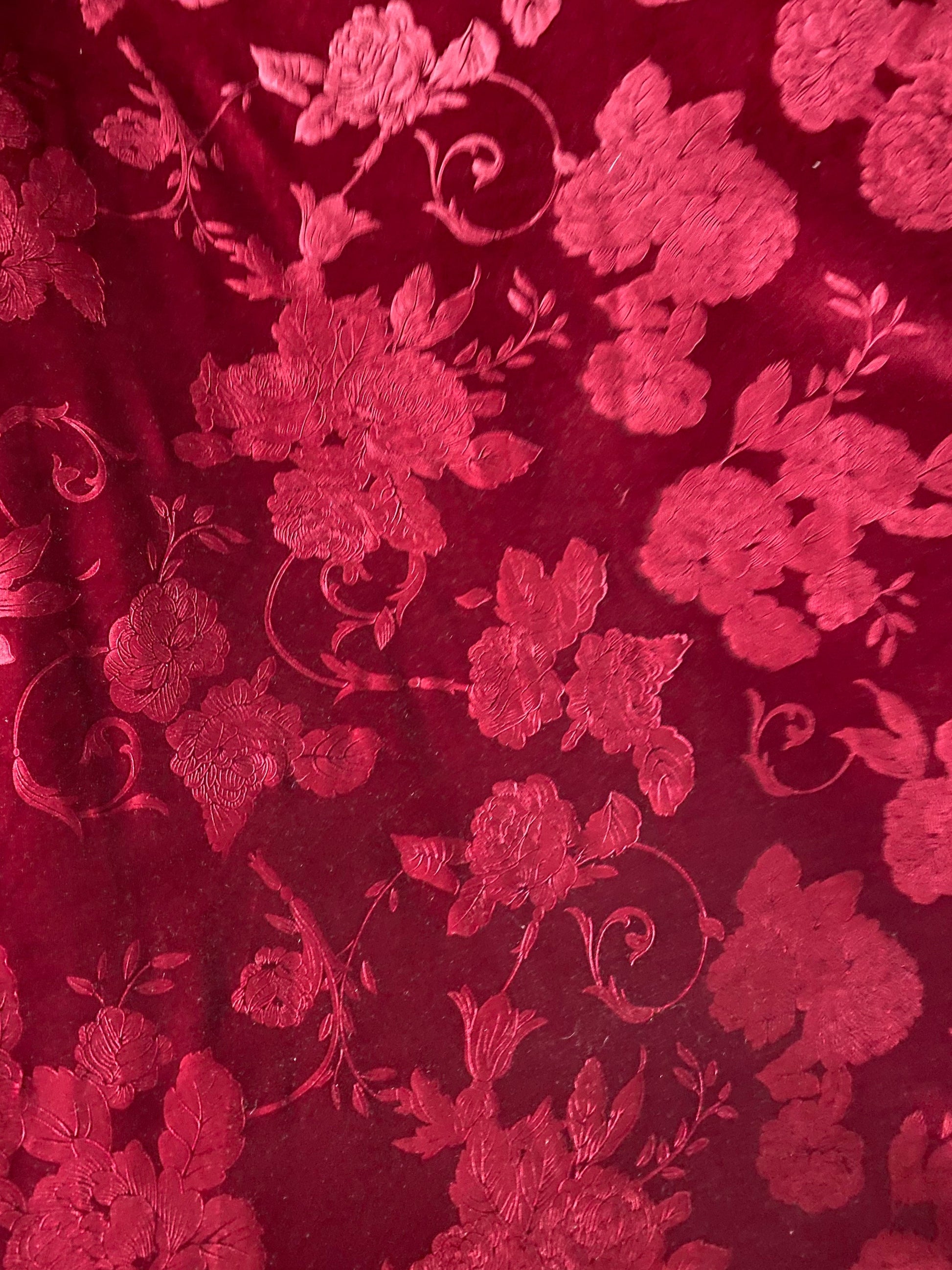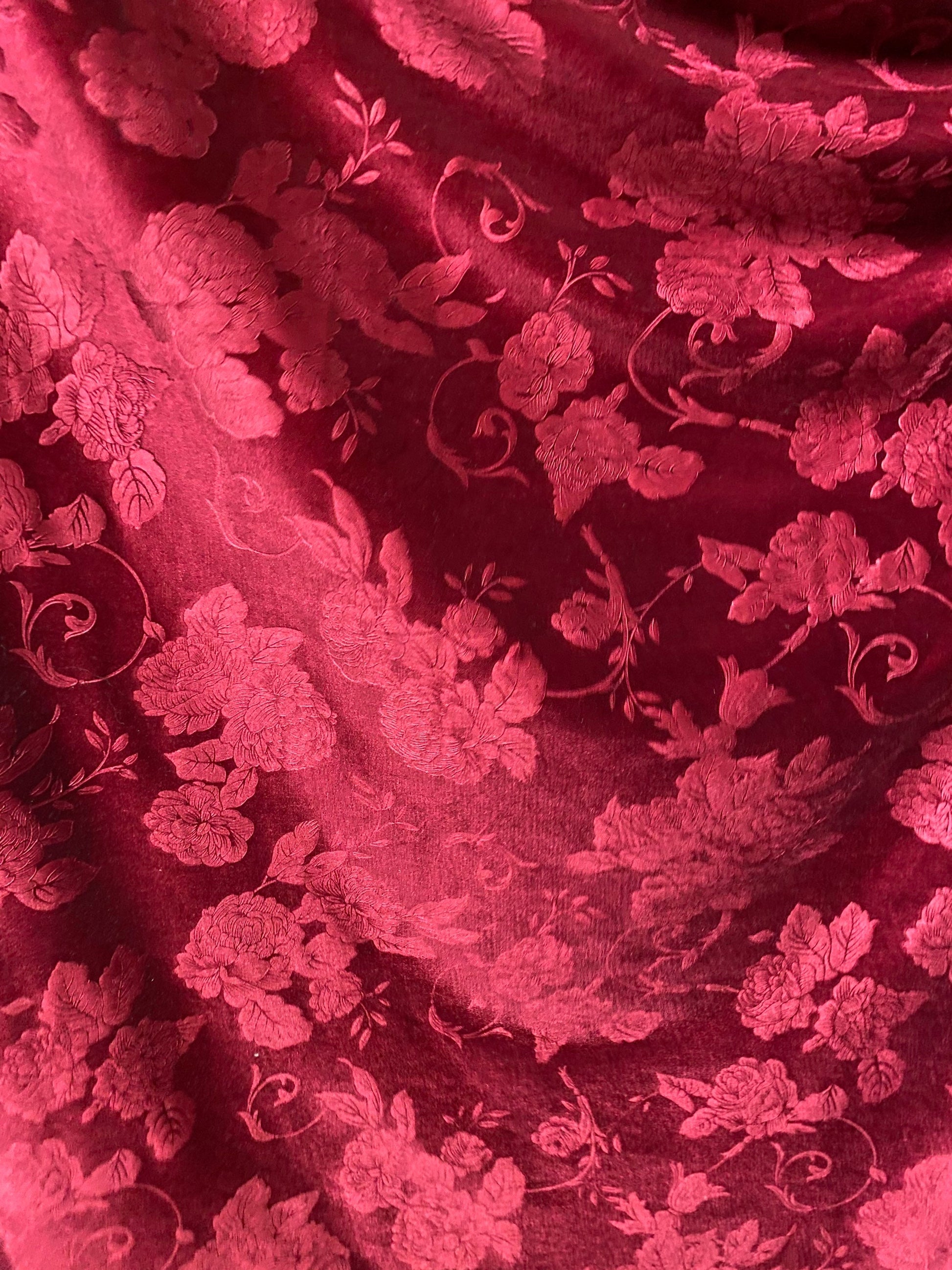 New Italian embossed velvet flower design merlot color luxury 4-way stretch velvet 58/60” Sold by the YD. Ships worldwide from Los Angeles.
