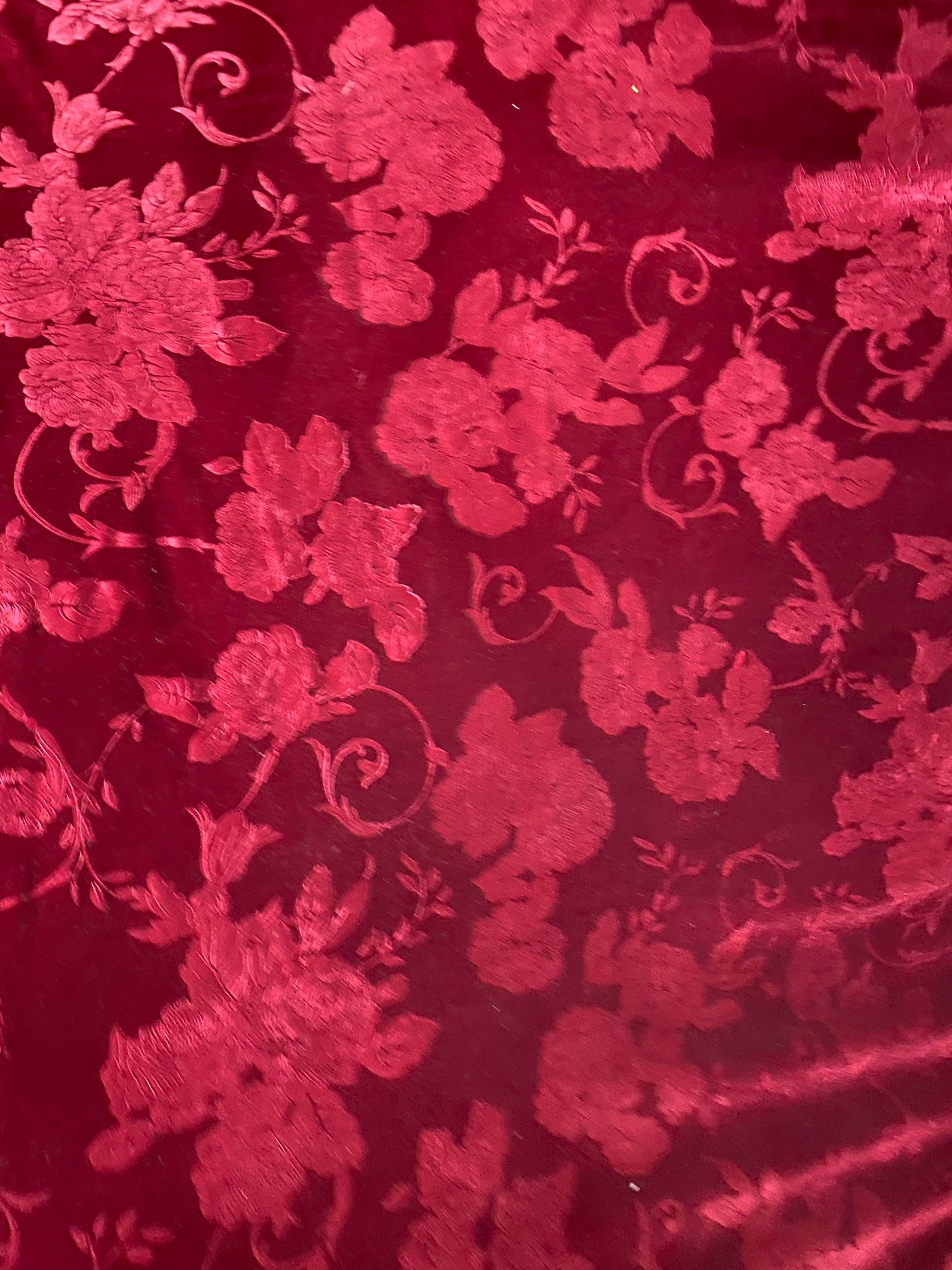 New Italian embossed velvet flower design merlot color luxury 4-way stretch velvet 58/60” Sold by the YD. Ships worldwide from Los Angeles California USA.