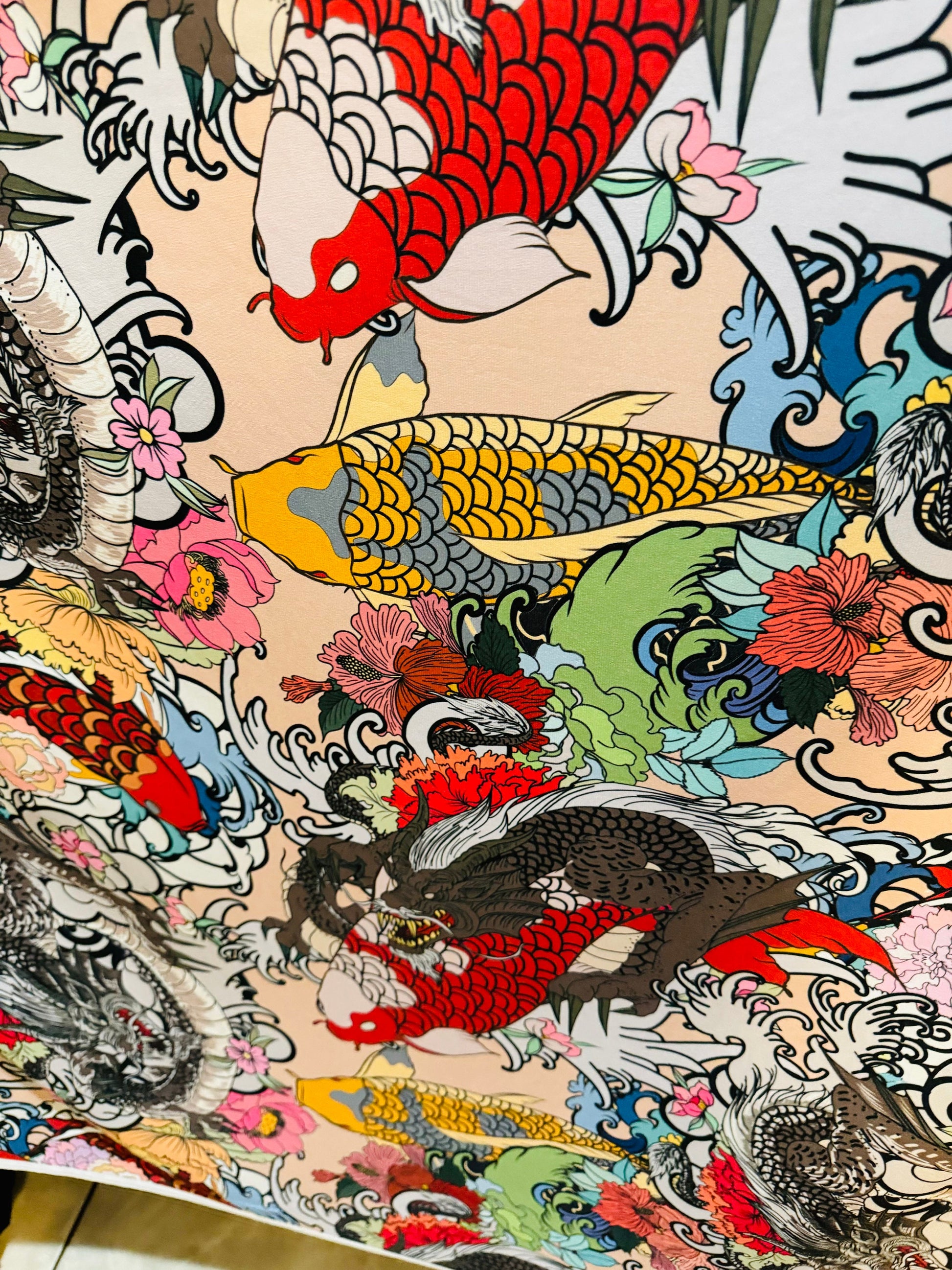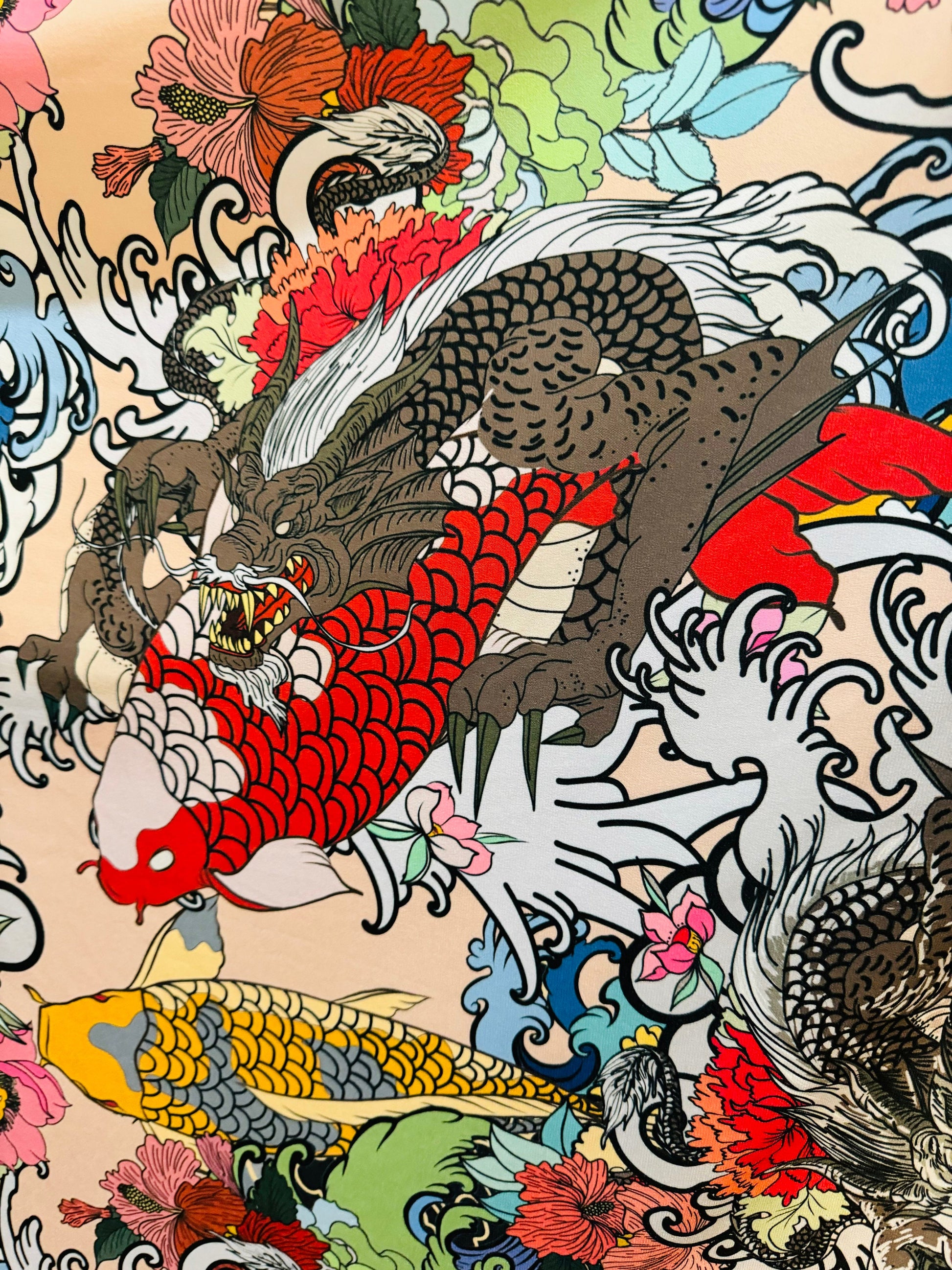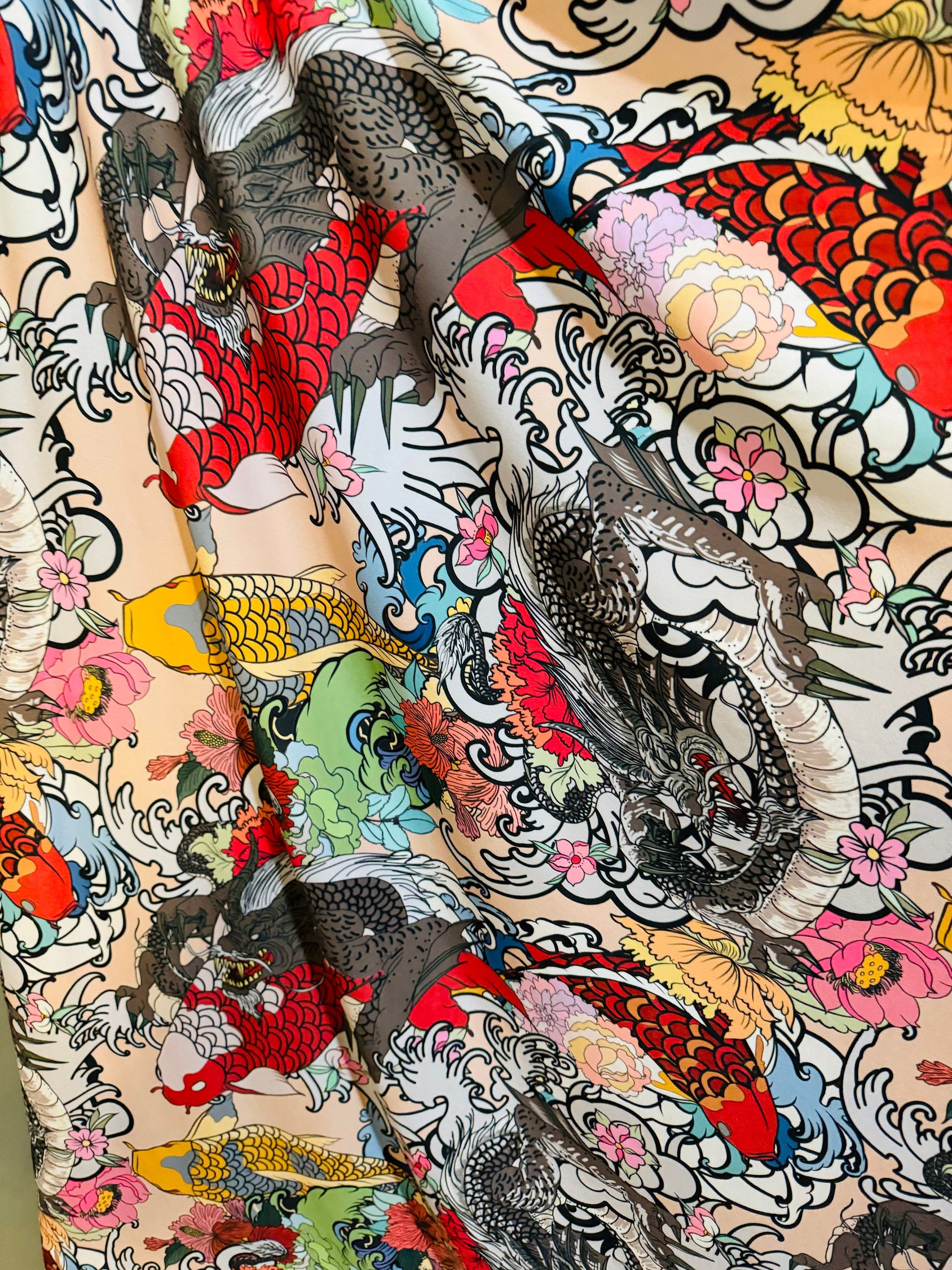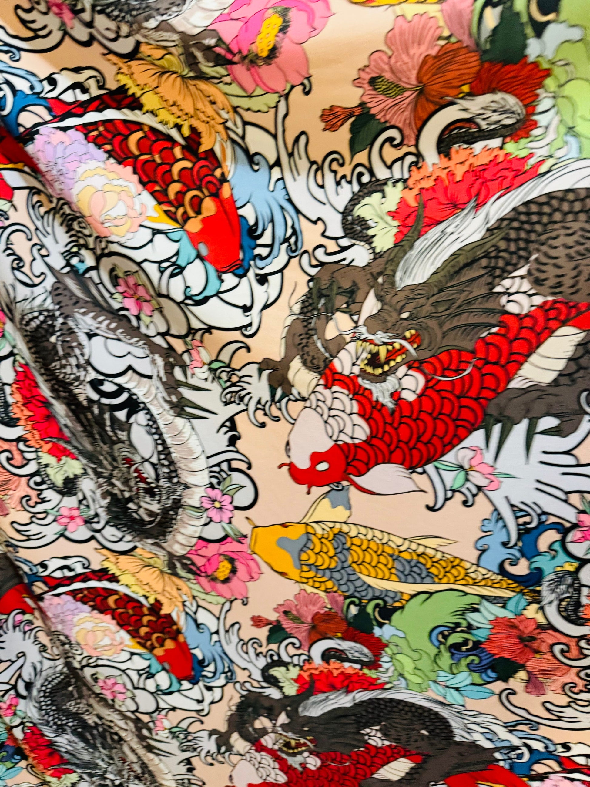 New Japanese Tattoo design print on poly Spandex light weight 2-way stretch 58/60” Sold by the YD. Ships worldwide from Los Angeles California USA.